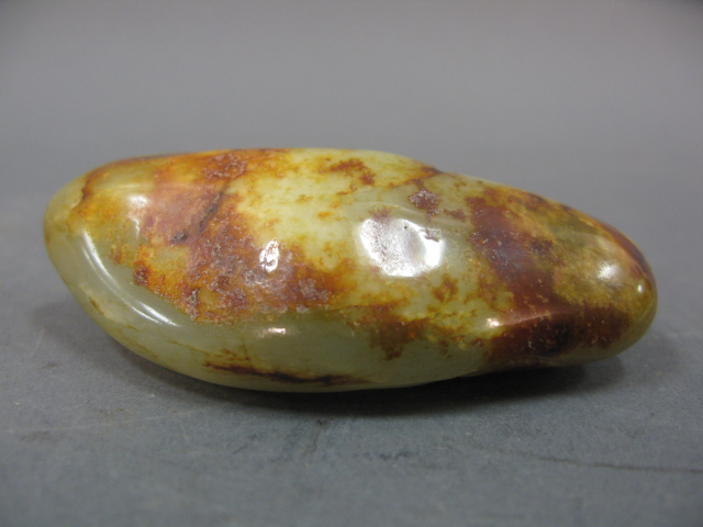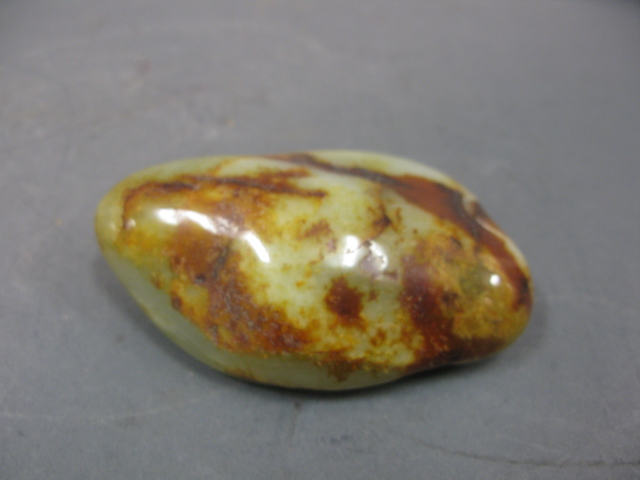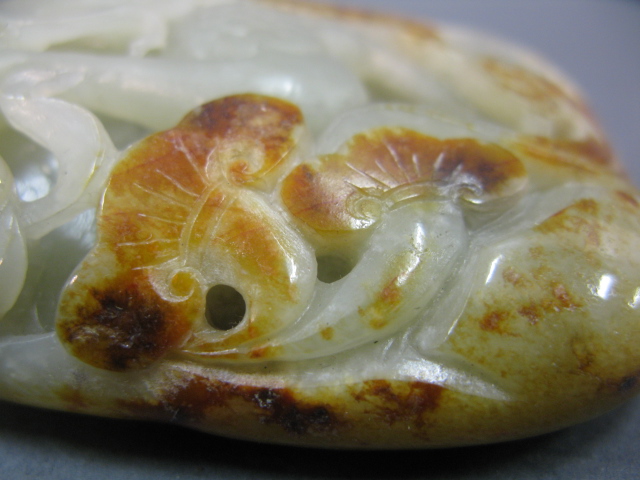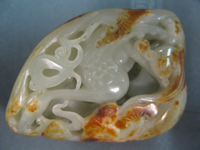 Carved celadon jade boulder of peacock and lotus having russett spots.