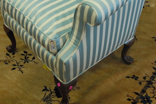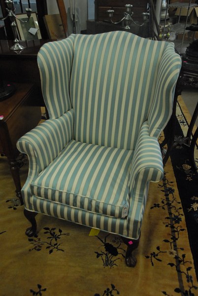Chippendale style upholstered wing chair with custom silk upholstery.