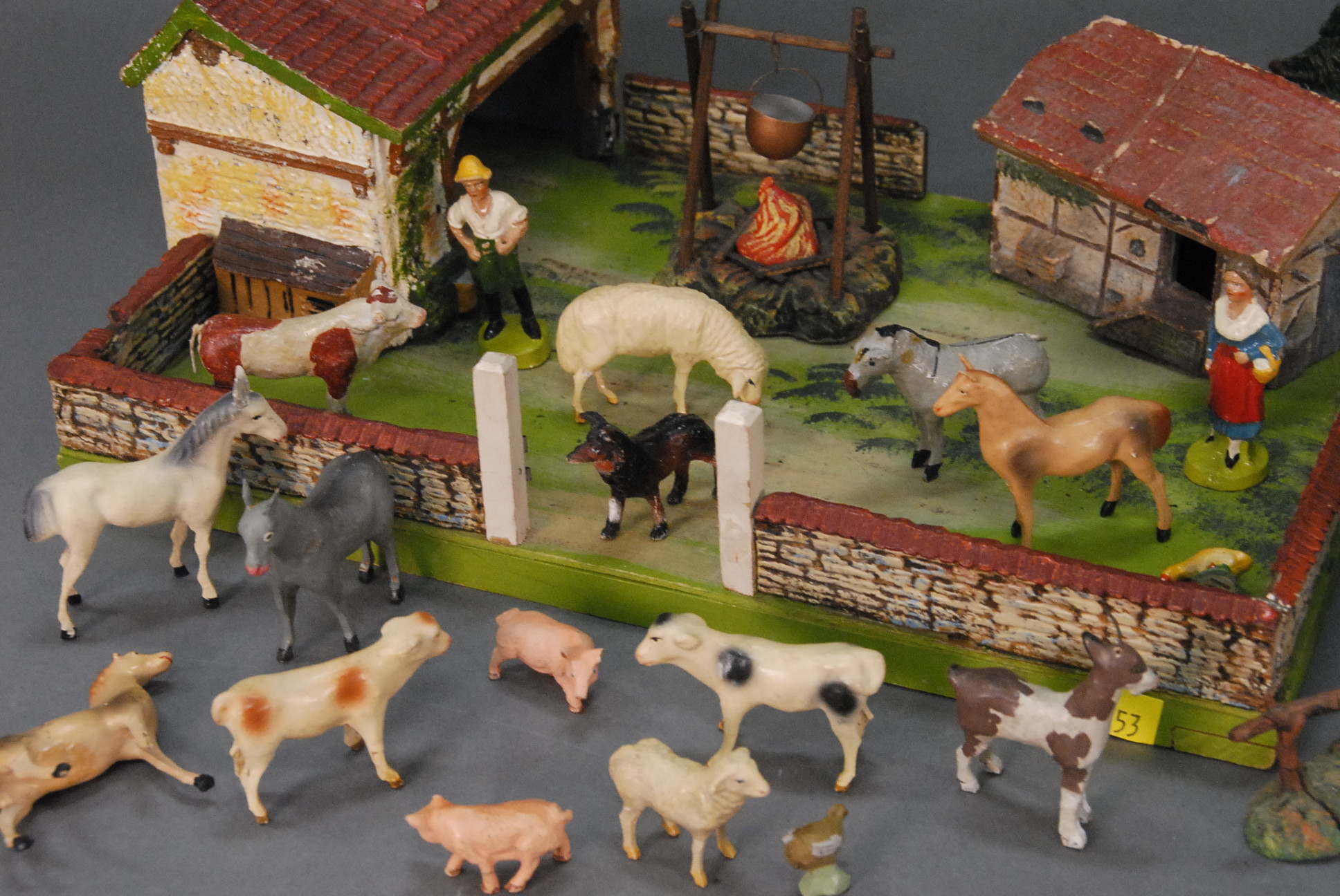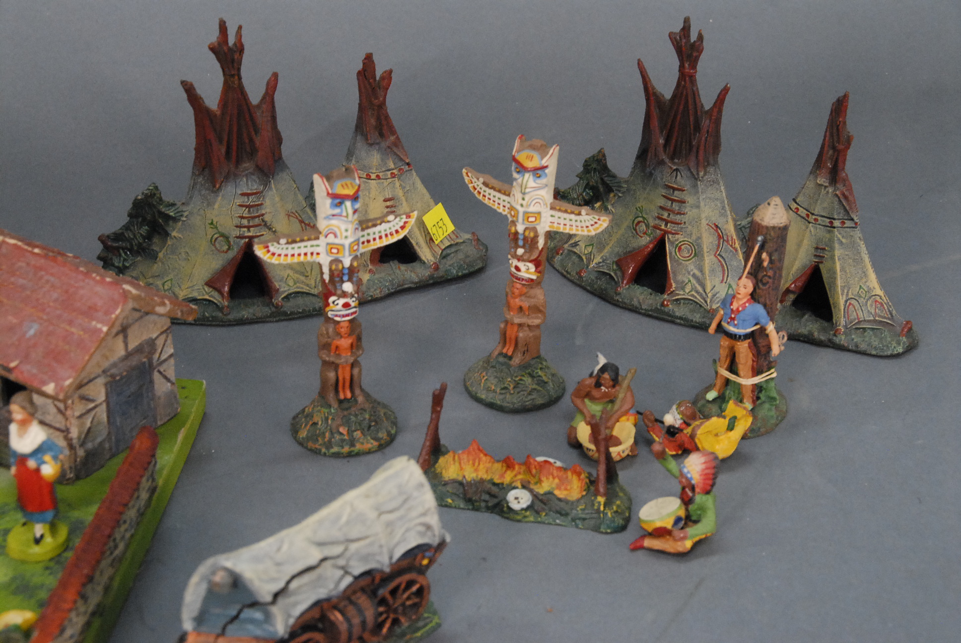 Elastolin village set up of Indian Teepees, covered wagon, cabins, etc.