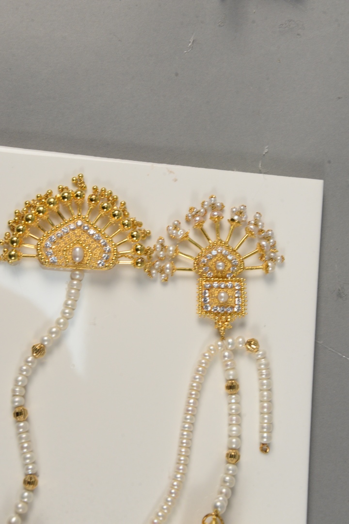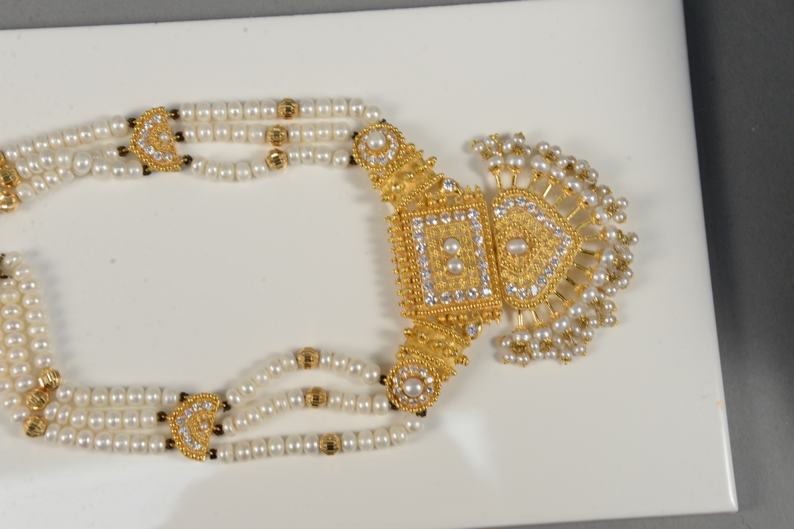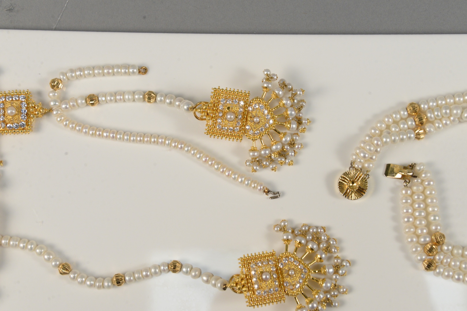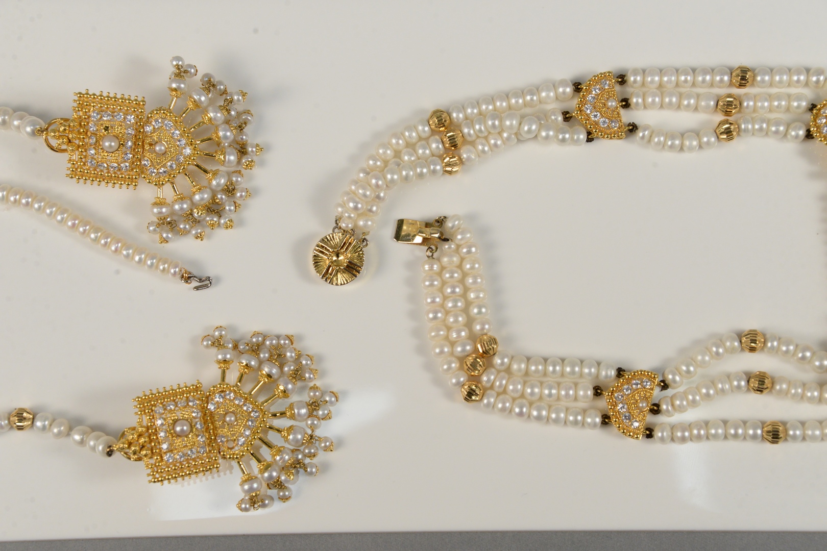 Lot 185: Five Piece 22 Karat Gold Necklace, Earrings, Two Pendants all with strung pearls, and small stones total weight 197 grams