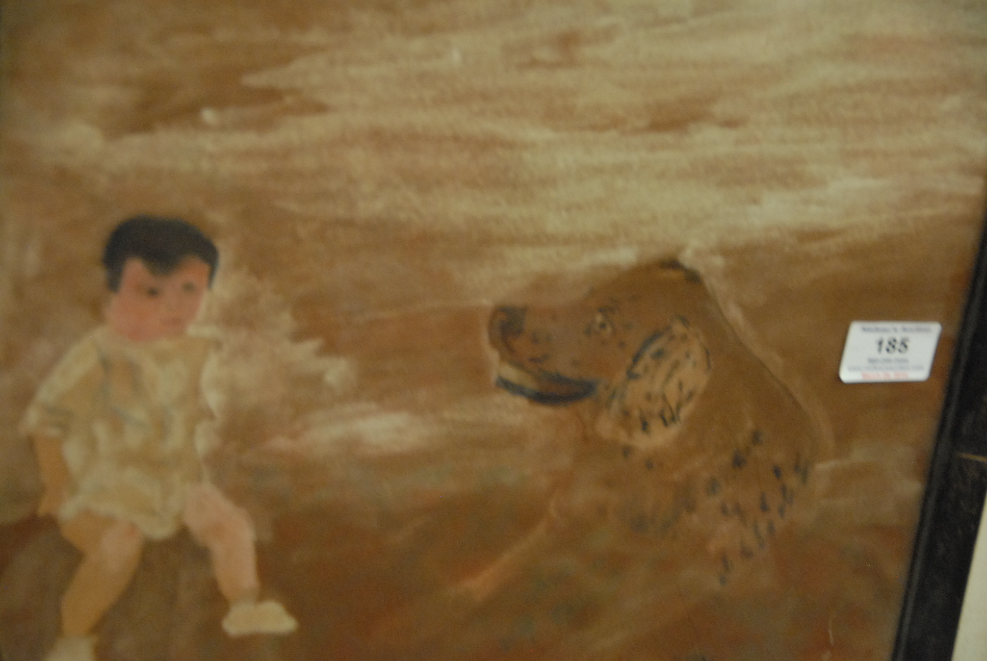 Folk art DOG AND BOY pastel painting 1935 signed illegibly. 15 x 14 3/4