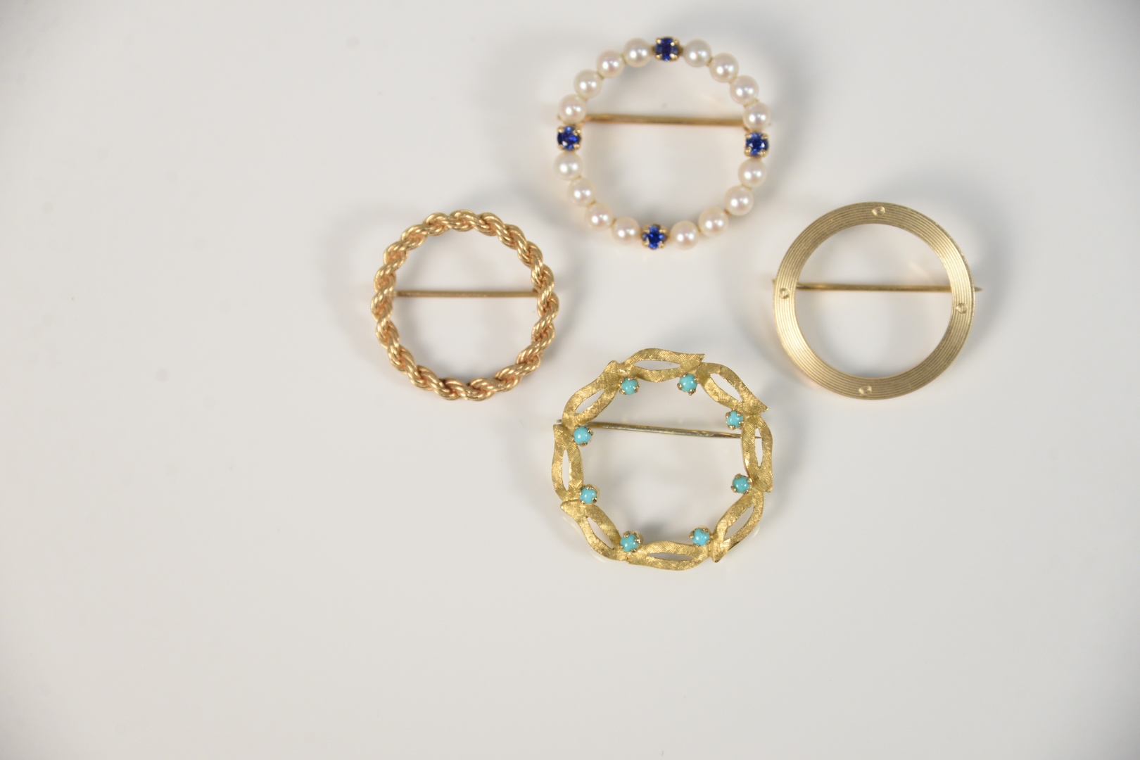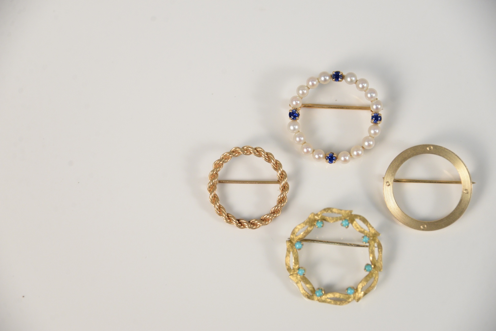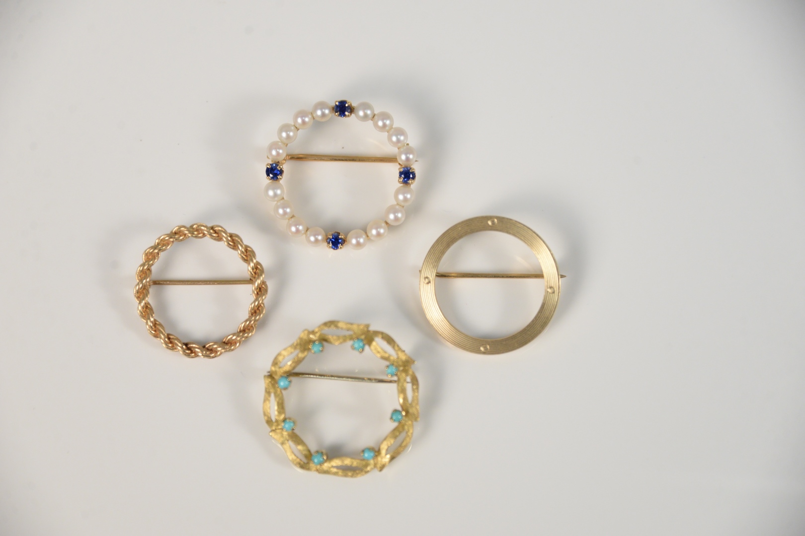 Four piece gold lot with four circular pins, 13.6 gr. Provenance: Estate of Dr. Thomas & Alice Kugelman, Bloomfield, Connecticut.