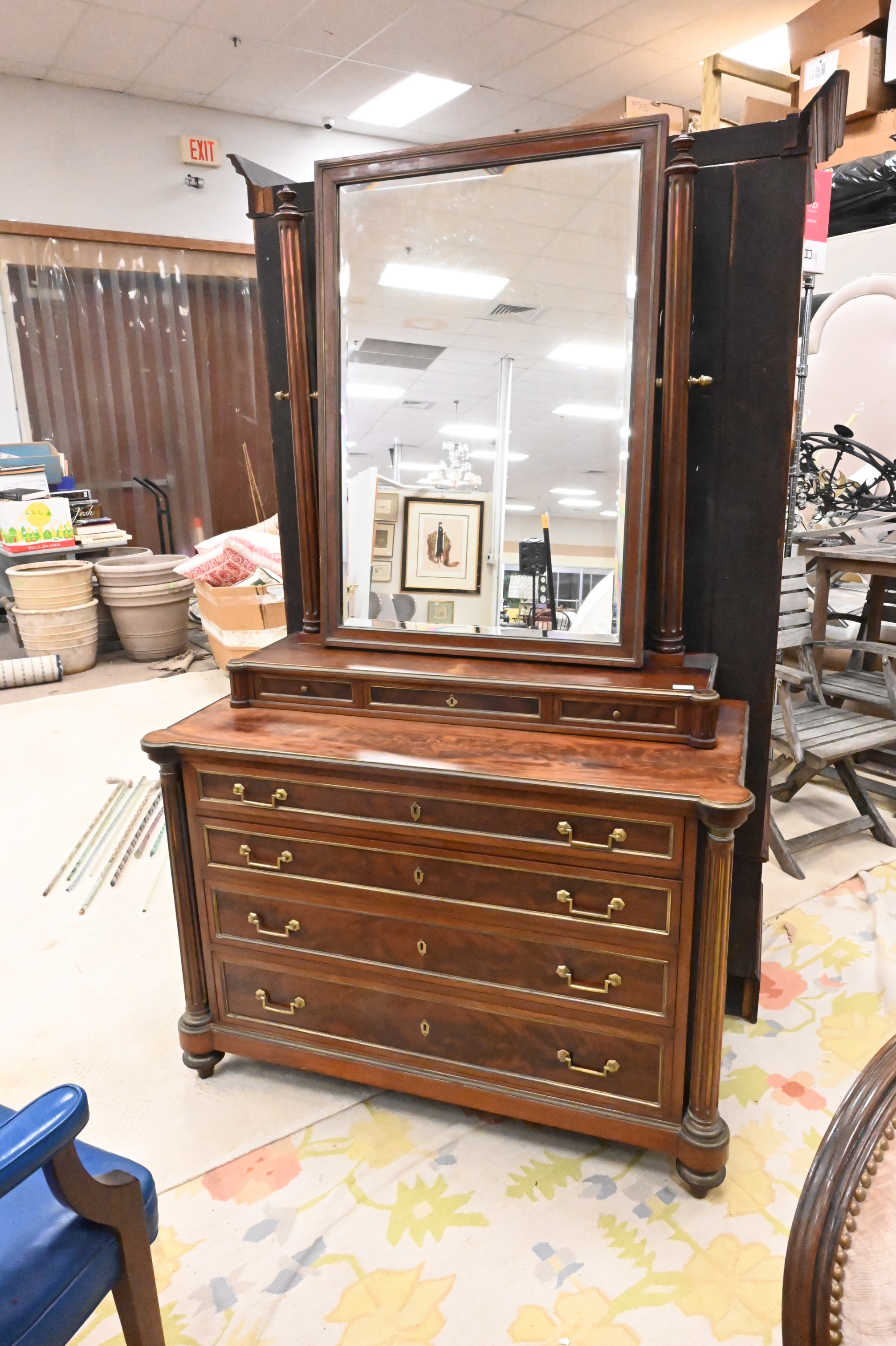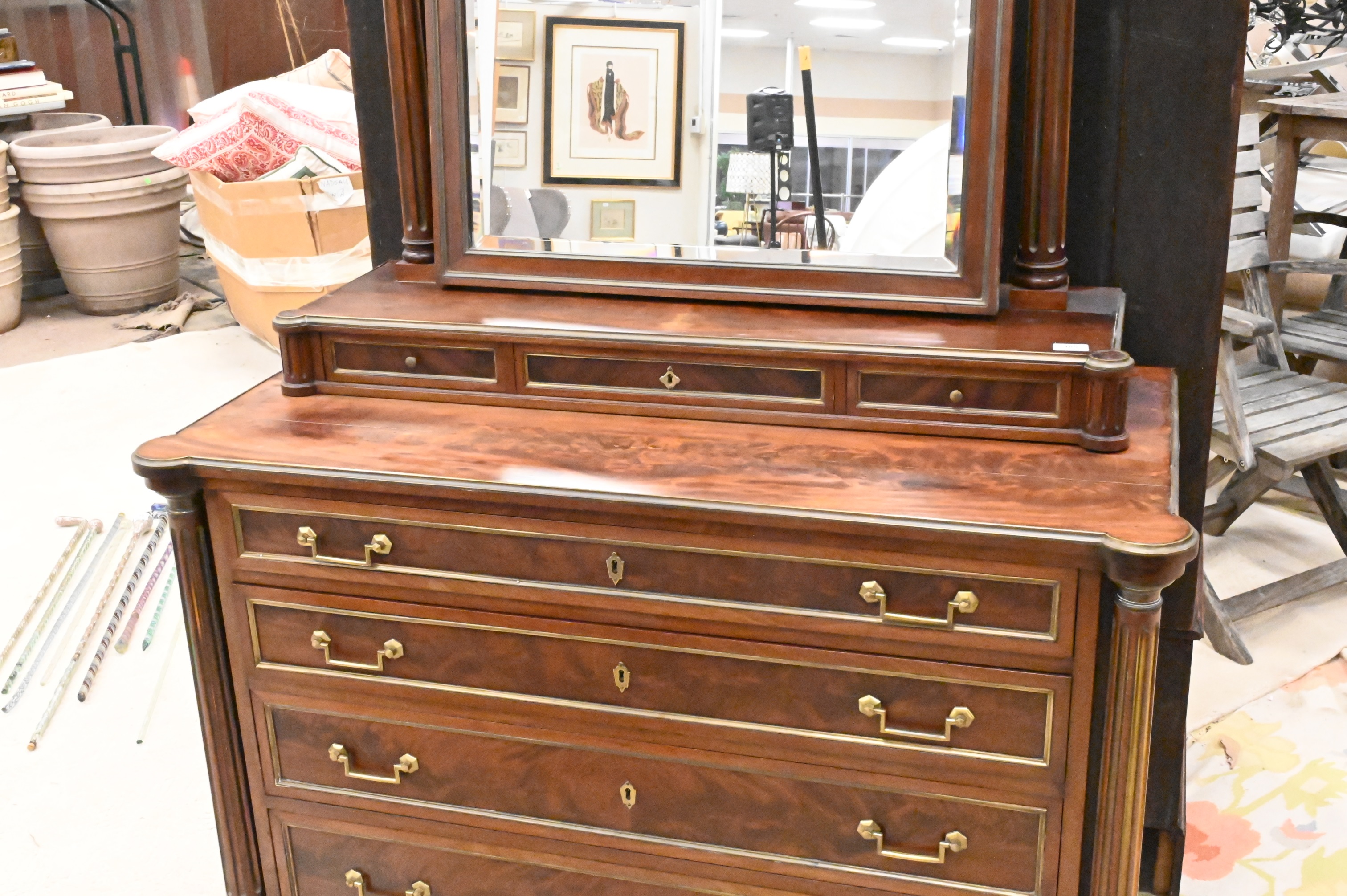 French Mahogany Three piece Bedroom Furniture, to include chest with standing mirror and double size bed, all with brass inlays, chest and mirror height 79 inches.