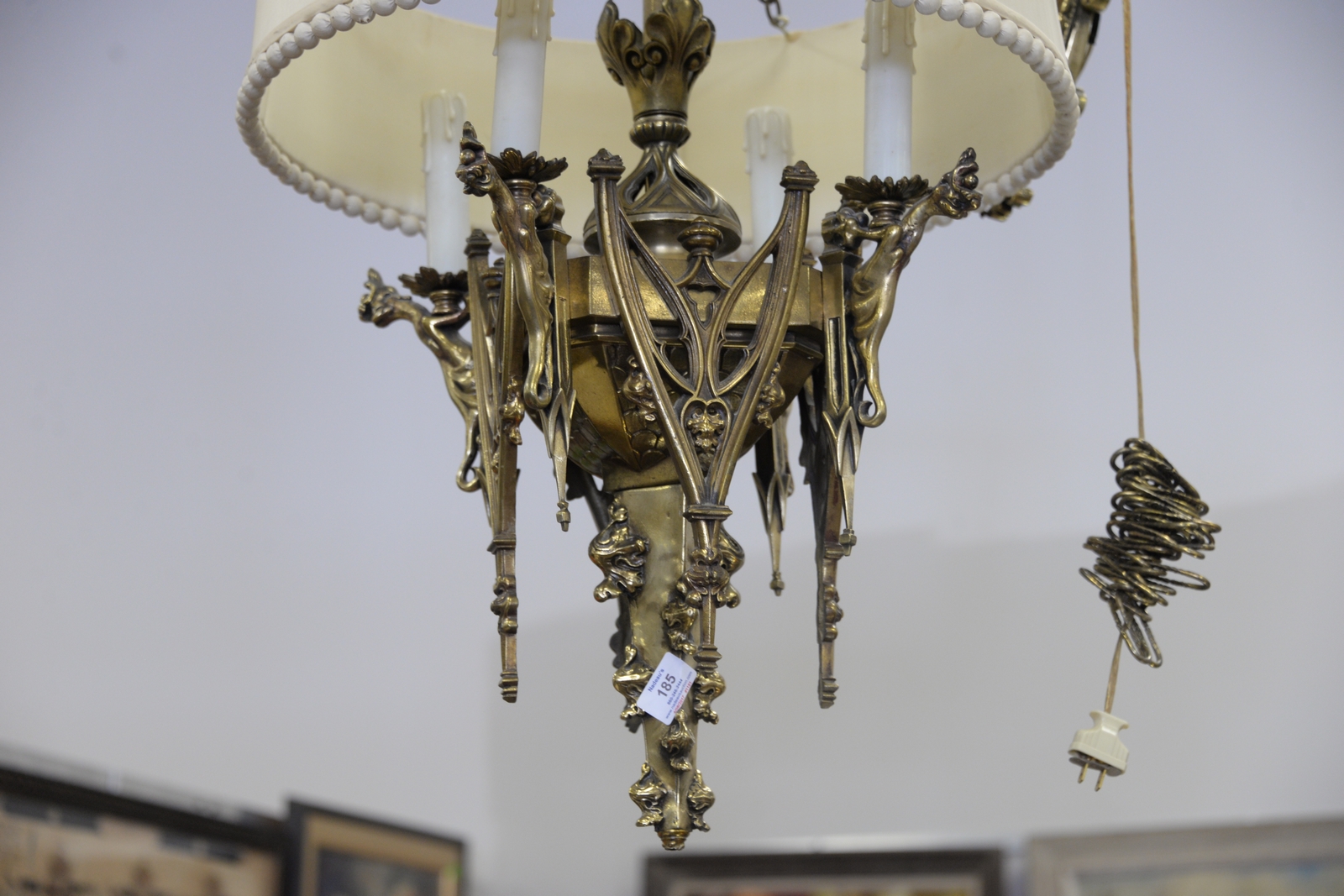 Lot 185: Gothic style heavy brass 24 light chandelier, each light having griffin supported arms with matching wall mount hanging arm. total h…