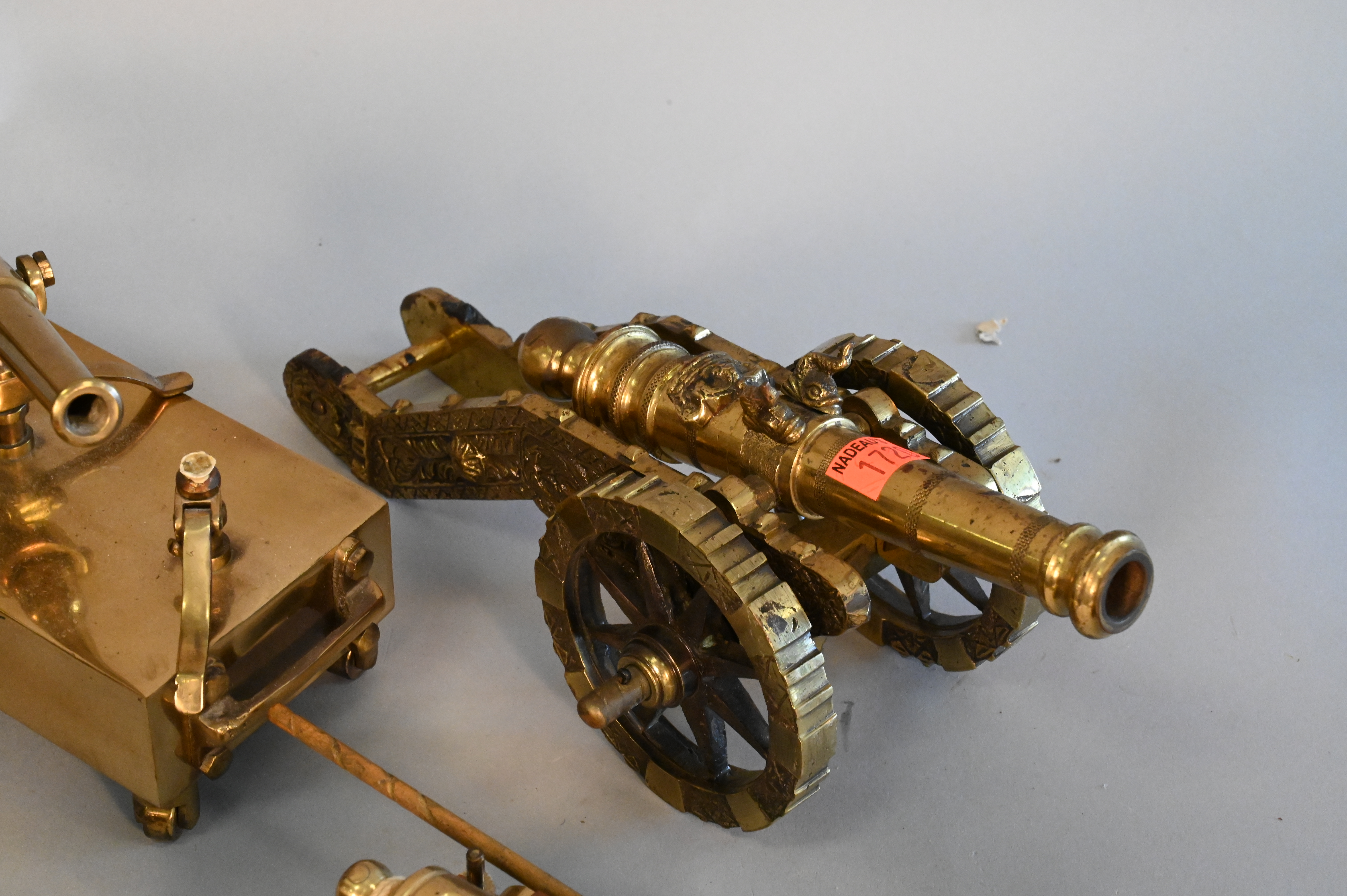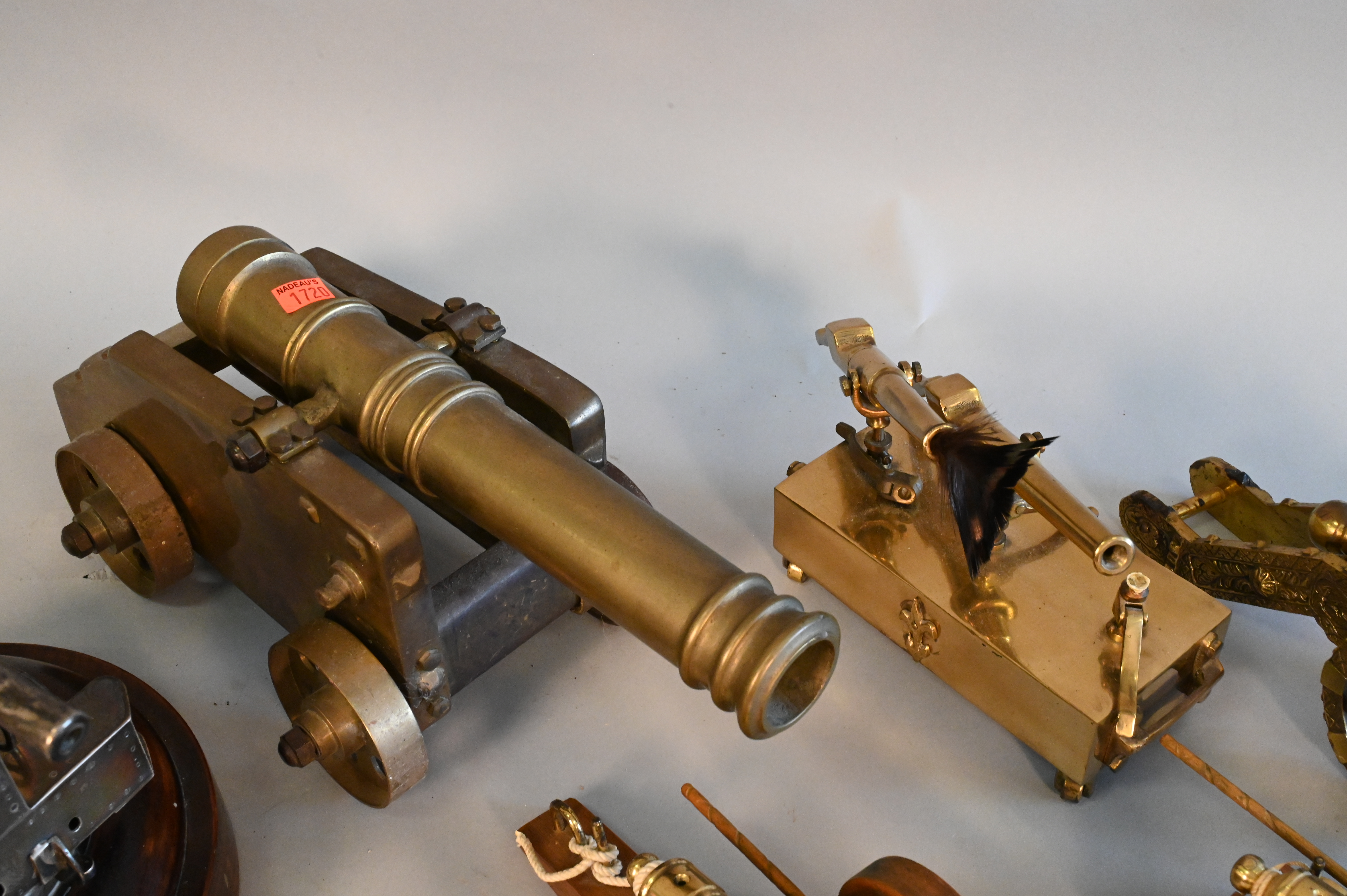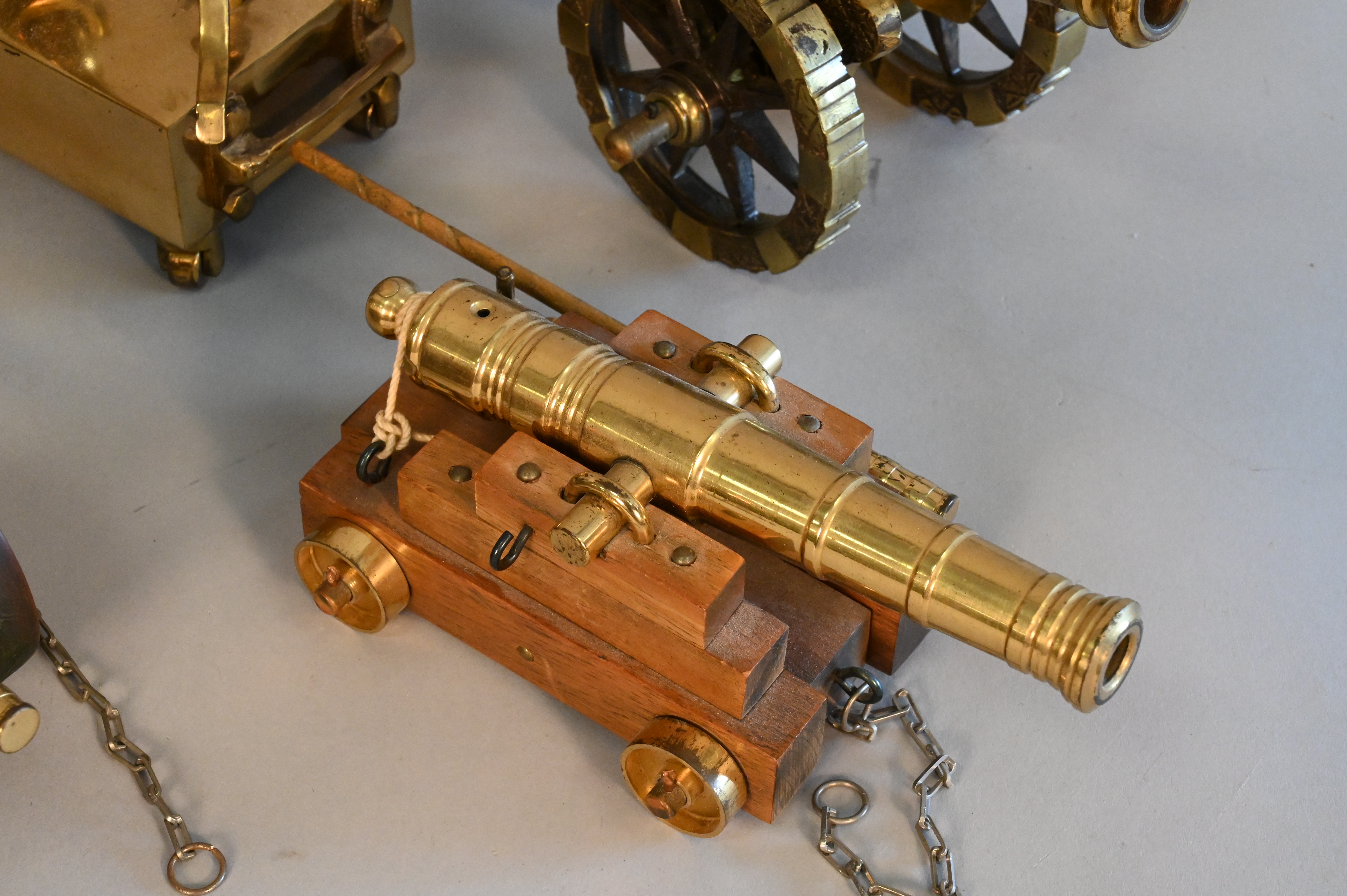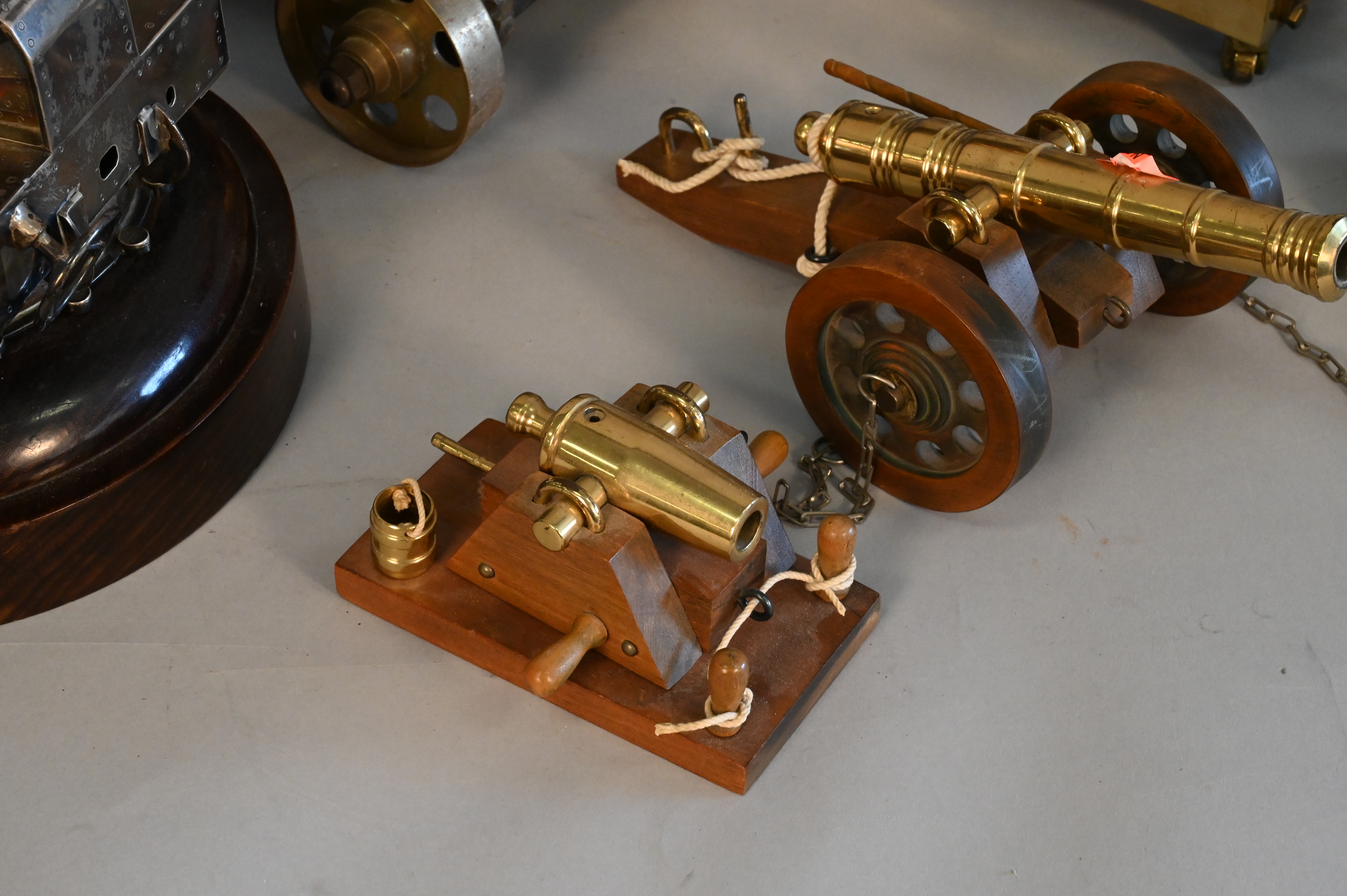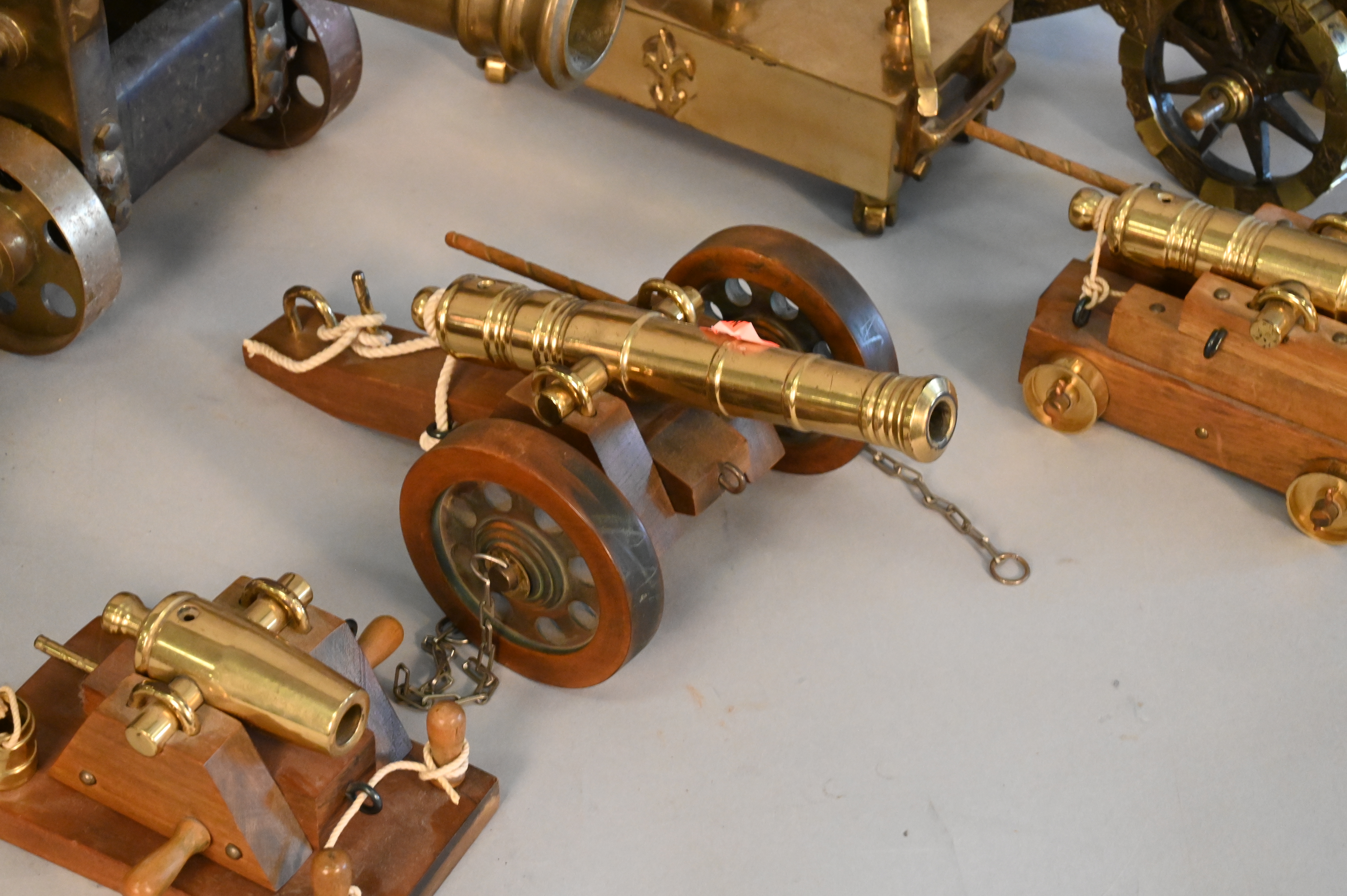 Group of Seven Model Brass and Wood Cannons, one having ornate floral and crown design, some with pull chain wheels etc..largest length 17 inches.