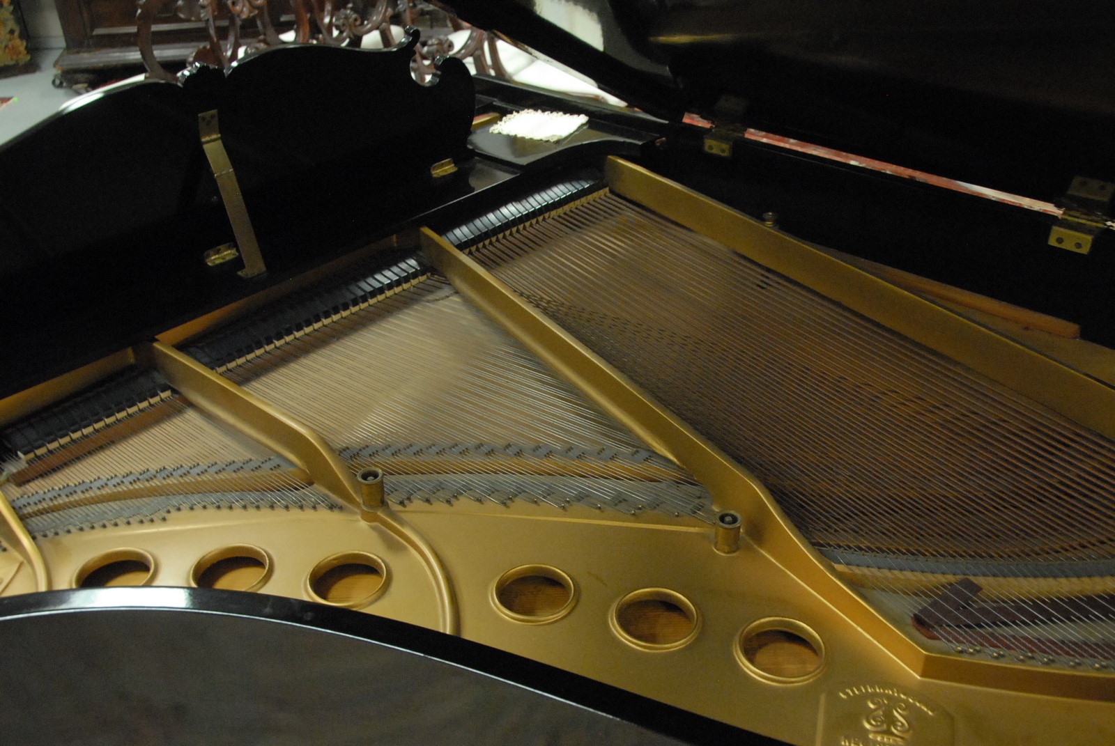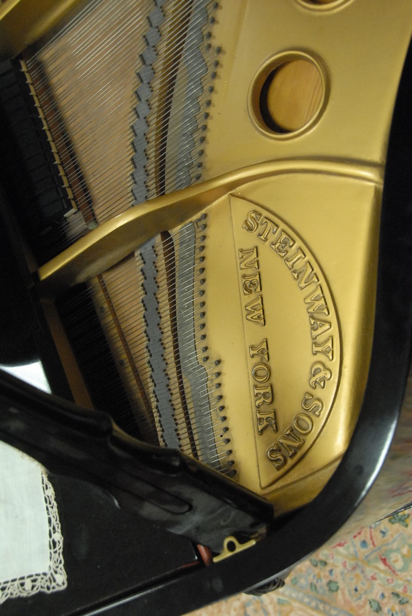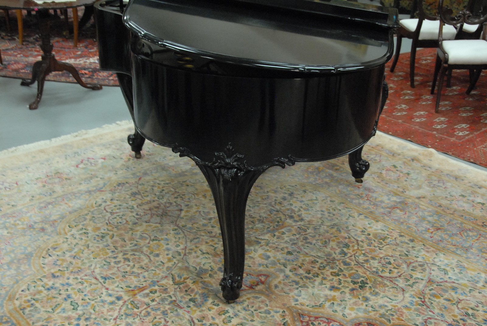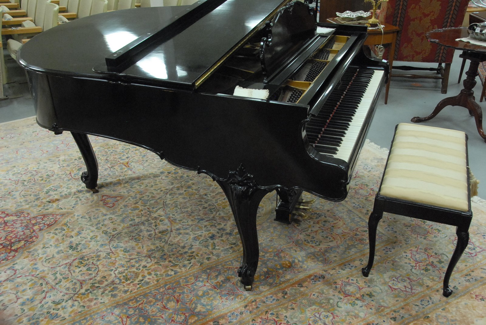 Lot 185: Louis XV style Steinway Baby Grand piano and bench, ebonized, having cabriole legs ending in scrolled feet, M Model 303465 S3175, in excellent condition.