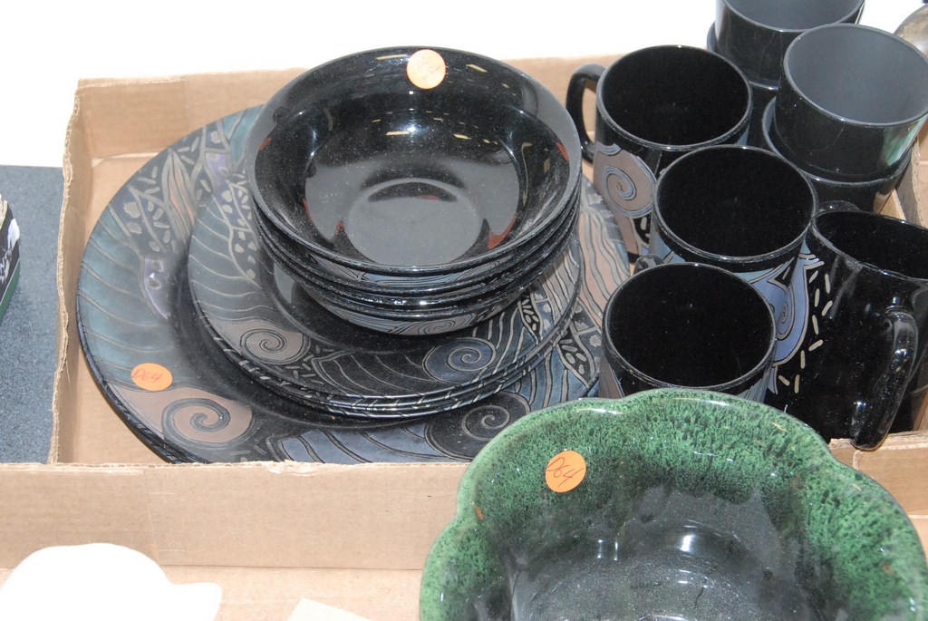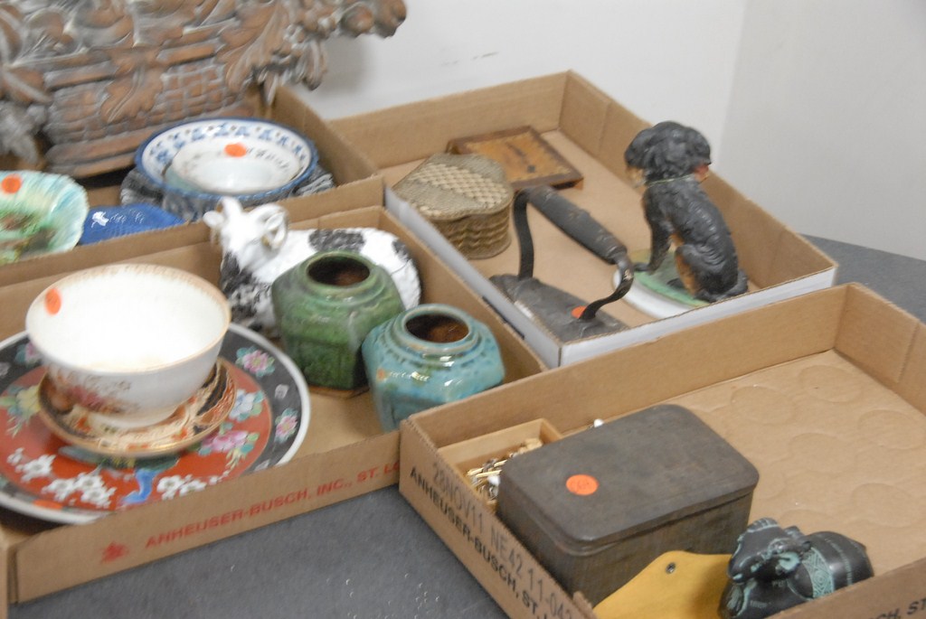 Seven box lots crystal, glassware, majolica, porcelain, iron, pottery, Arconoc French glass dish set, etc.