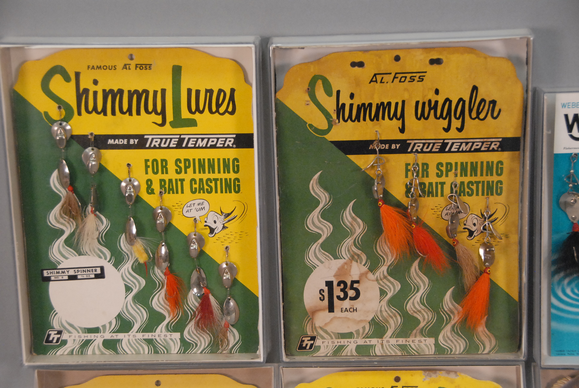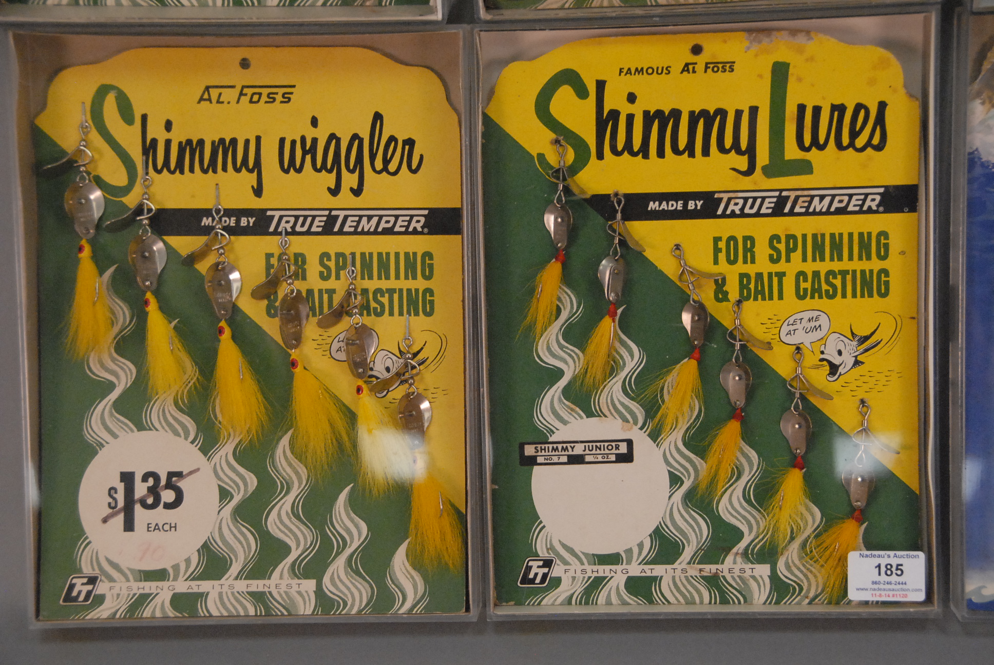 Six Al Foss True Temper cardboard display boards with twelve Shimmy Lures and ten Shimmy Wigglers.