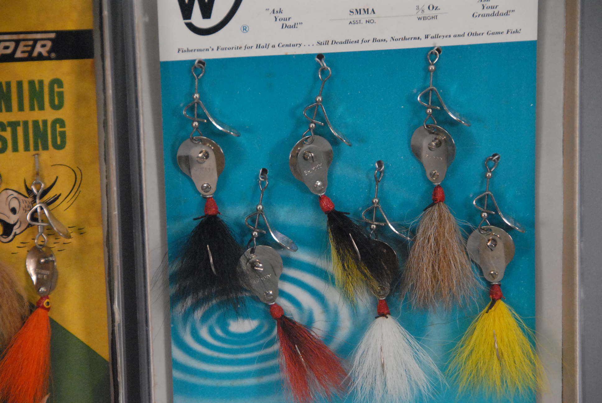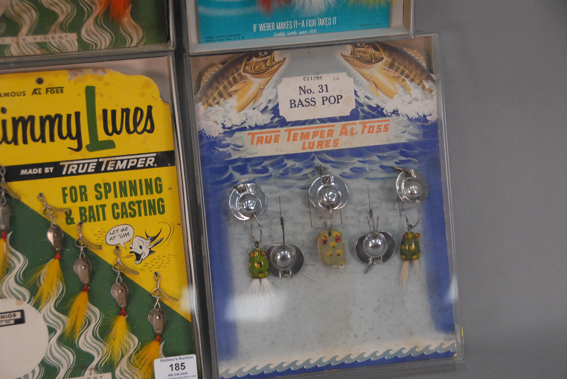 Lot 185: Six Al Foss True Temper cardboard display boards with twelve Shimmy Lures and ten Shimmy Wigglers.