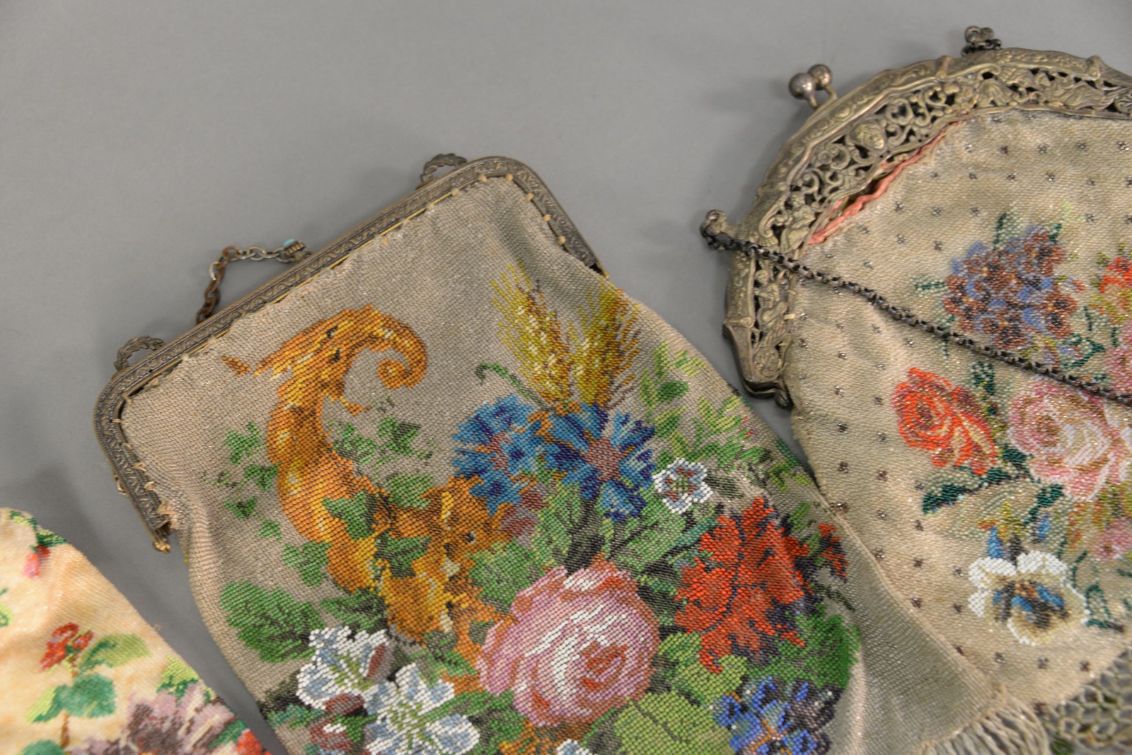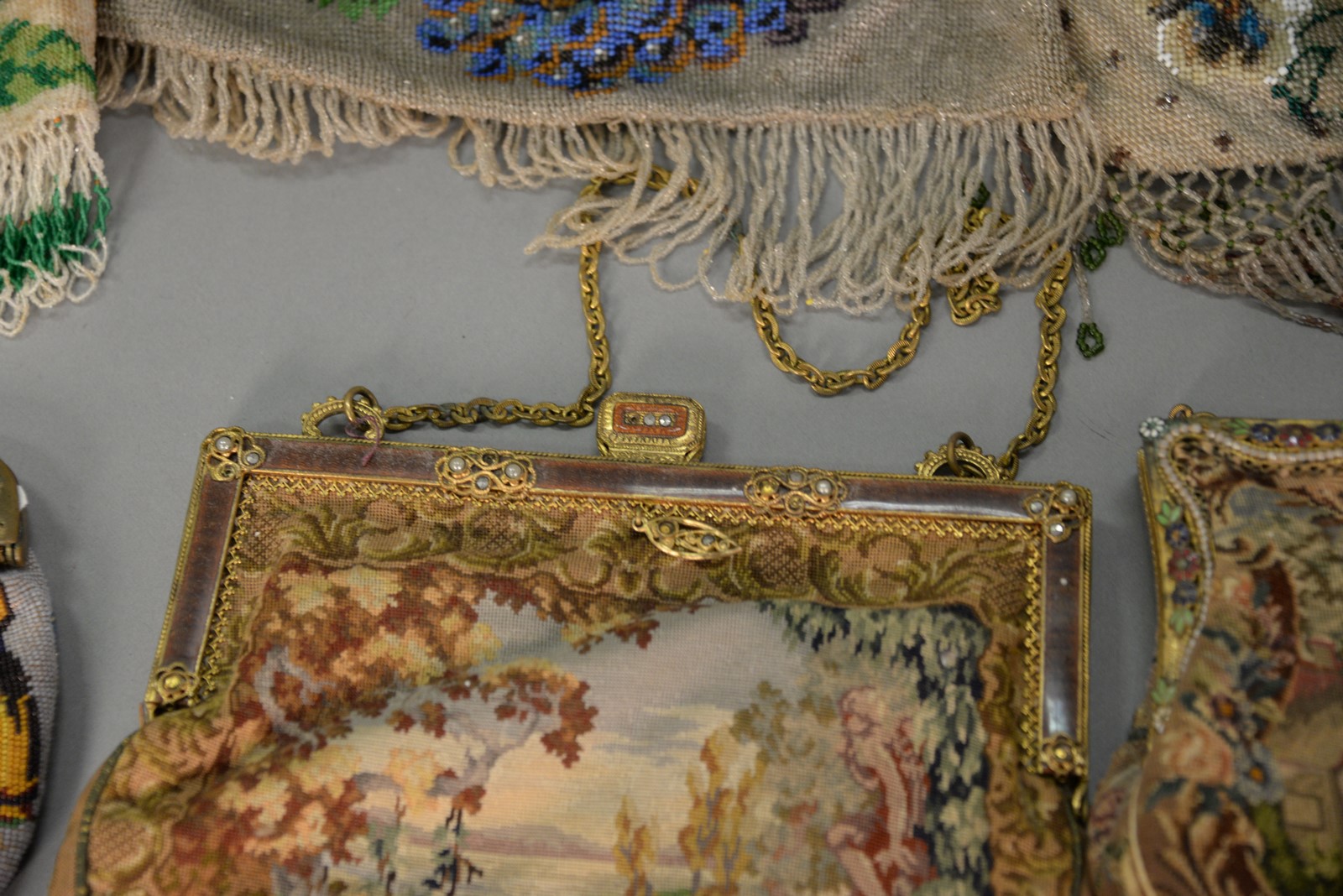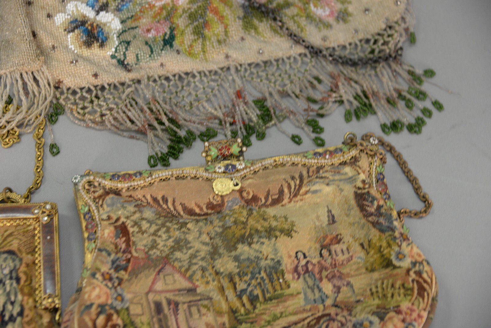 Lot 185: Six vintage purses including four beaded purses and two tapestry purses with enameled clasps.