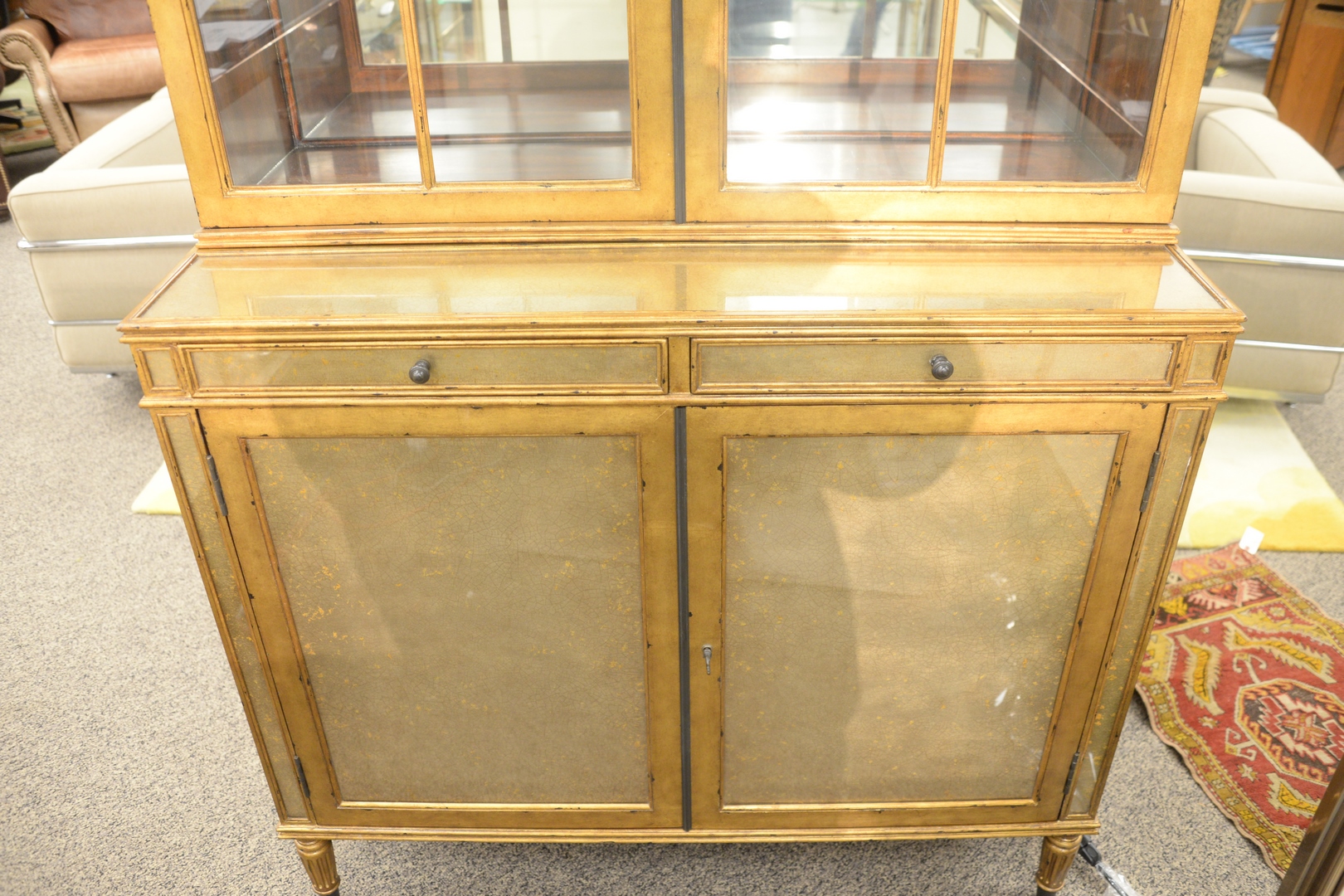 Theodore Alexander Art Deco Style Two-Part Venetian Cabinet, with silver and gold highlights, lighted interior with adjustable shelves, titled “Graceful”, Venetian cabinet, height 88 3/4 inches, width 47 inches, depth 20 inches.