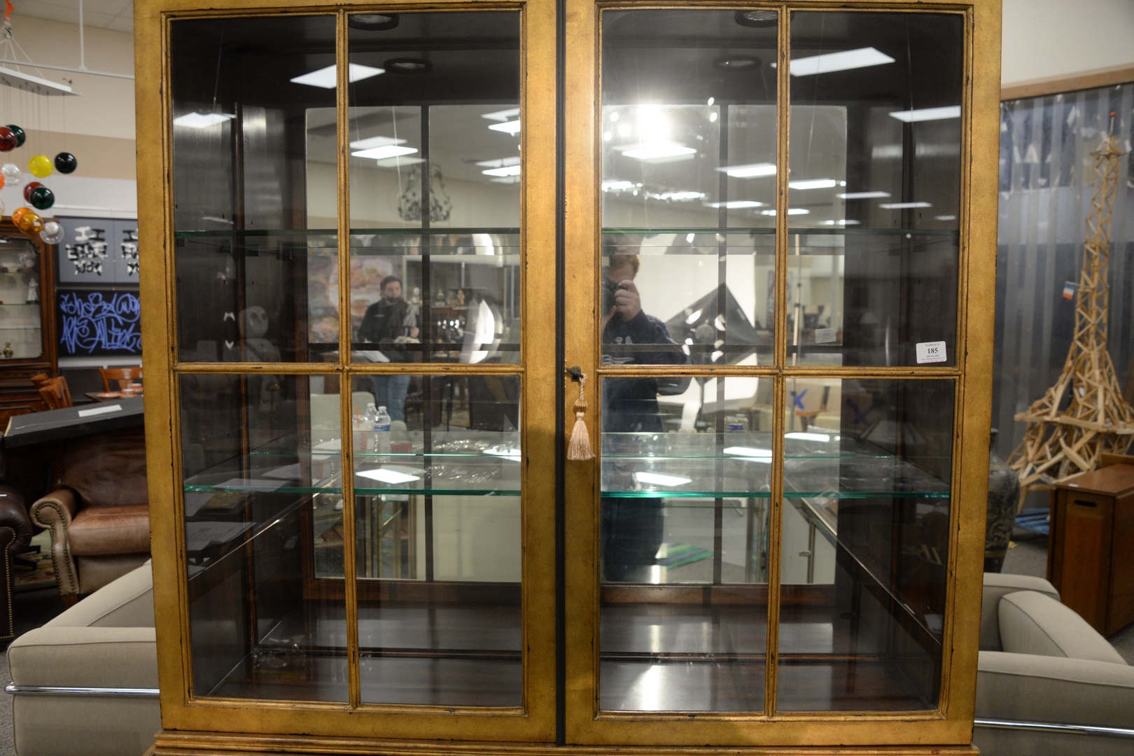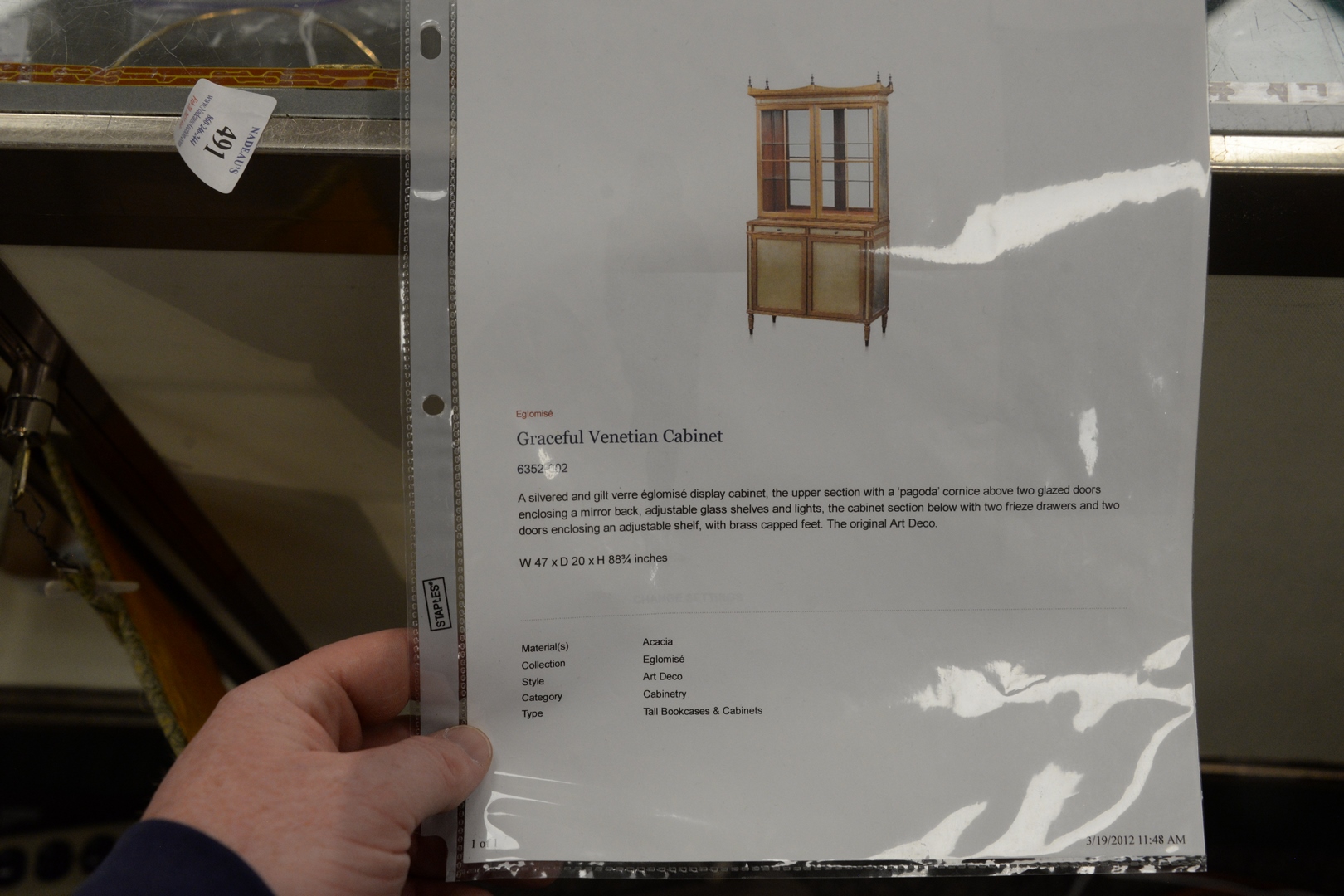 Lot 185: Theodore Alexander Art Deco Style Two-Part Venetian Cabinet, with silver and gold highlights, lighted interior with adjustable shelves, titled “Graceful”, Venetian cabinet, height 88 3/4 inches, width 47 inches, depth 20 inches.