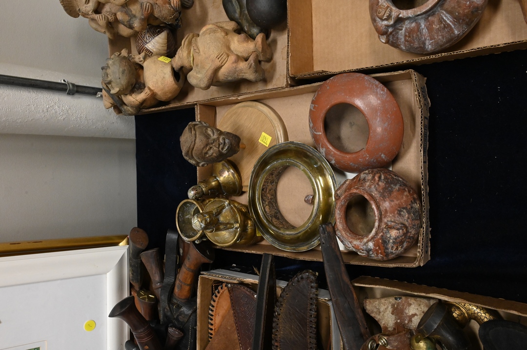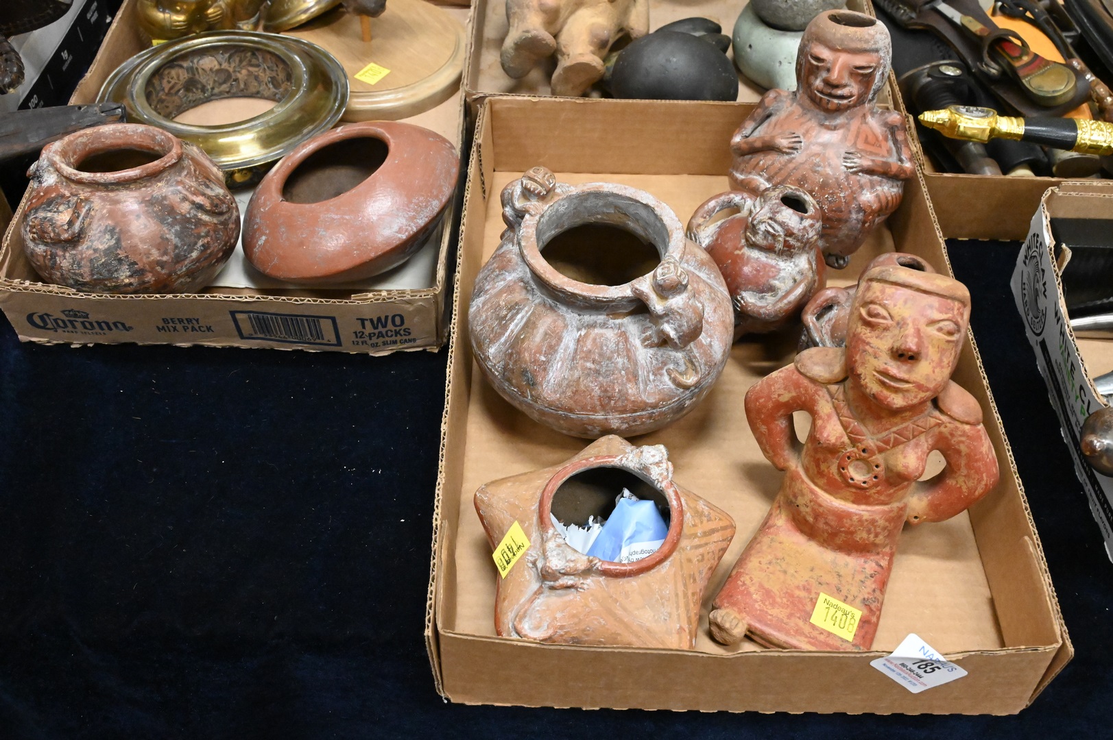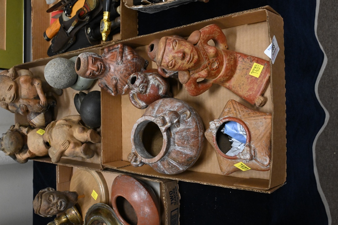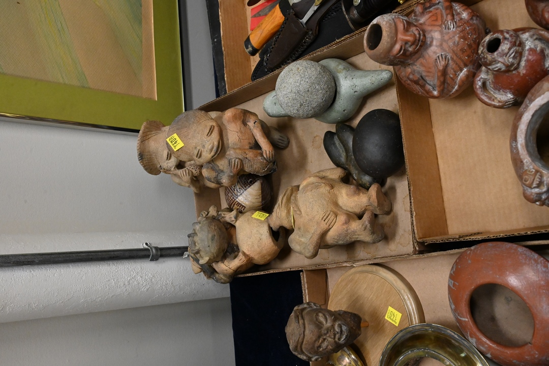 Three Tray Lots of South American and Pre-Columbian Narino Pieces, to include star form vase, seated male and female figures, melon vase with monkey handles, bowls, whistle conch shell, along with brass figures.