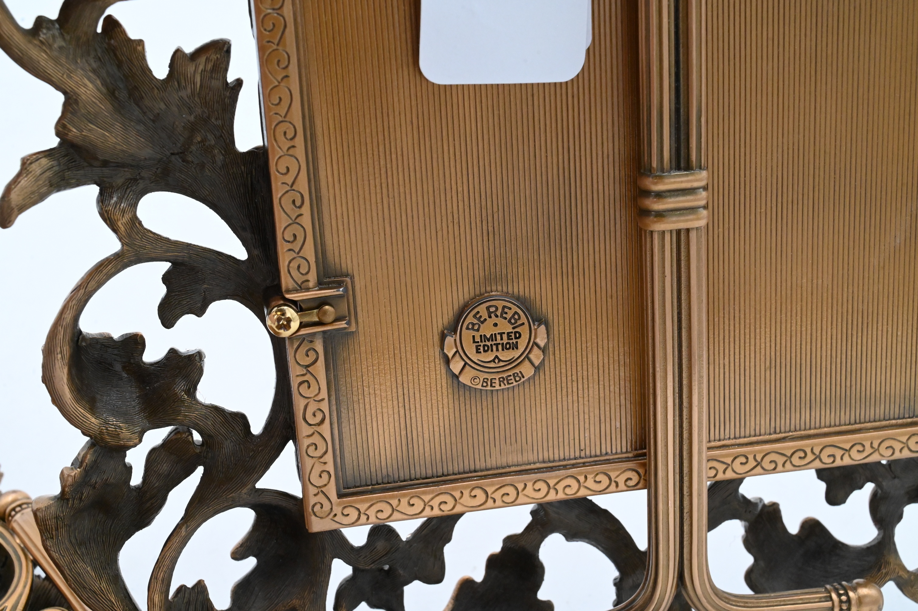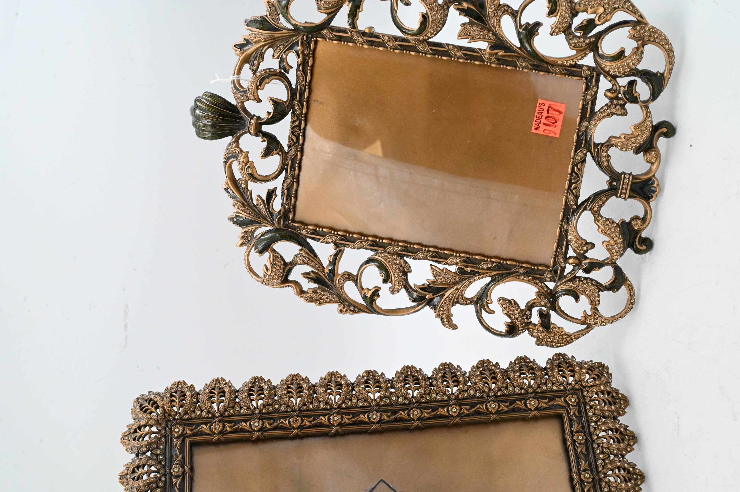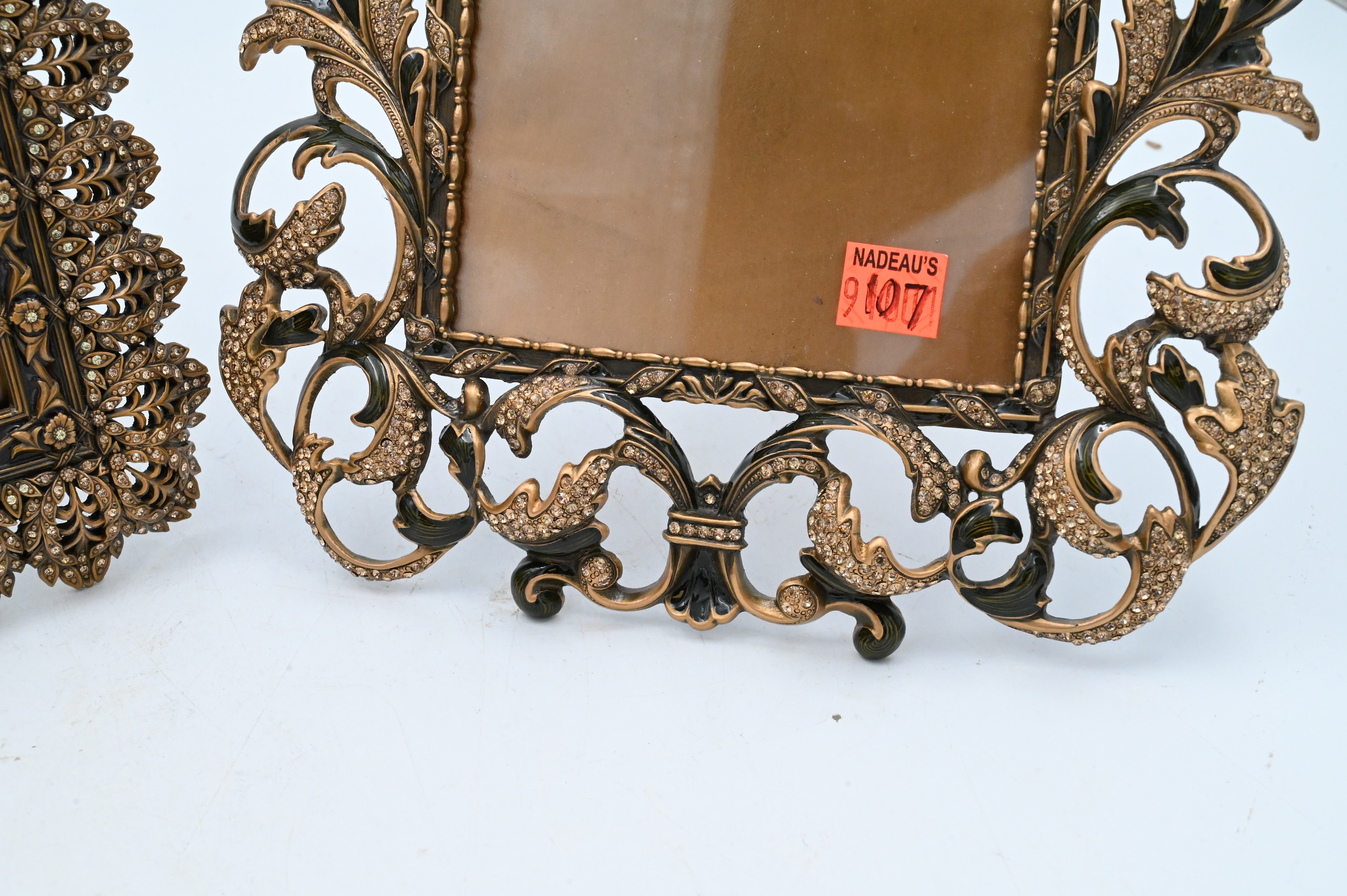 Art Nouveau style frame having scrolling foliate erinite green frame with topaz color stones No.7439, 11 1/2″ x 9″, along with Roman Holiday frame in museum gold No.7457 4261-1, 12″ x 10″ marked on verso Berebi Limited Edition