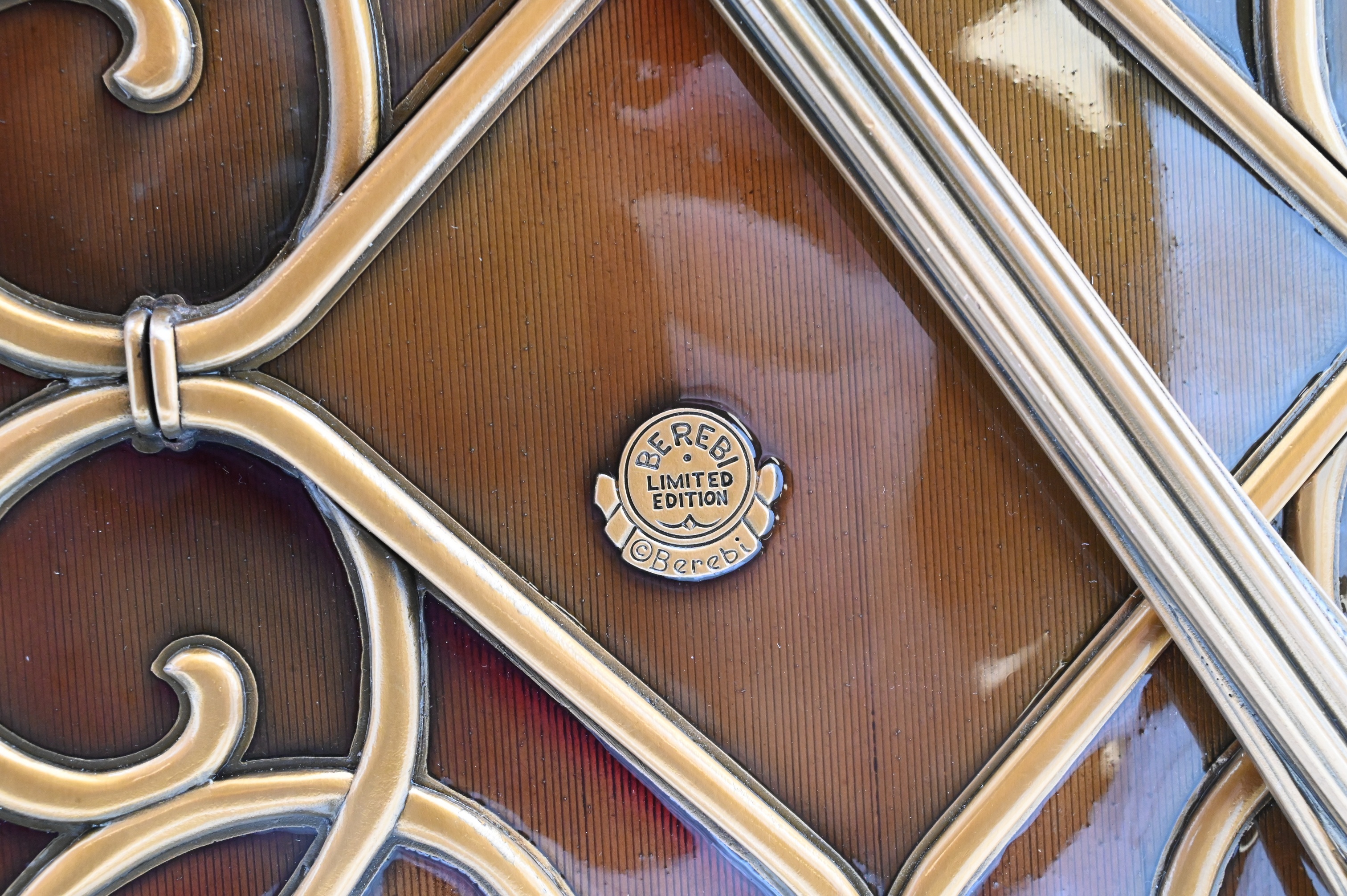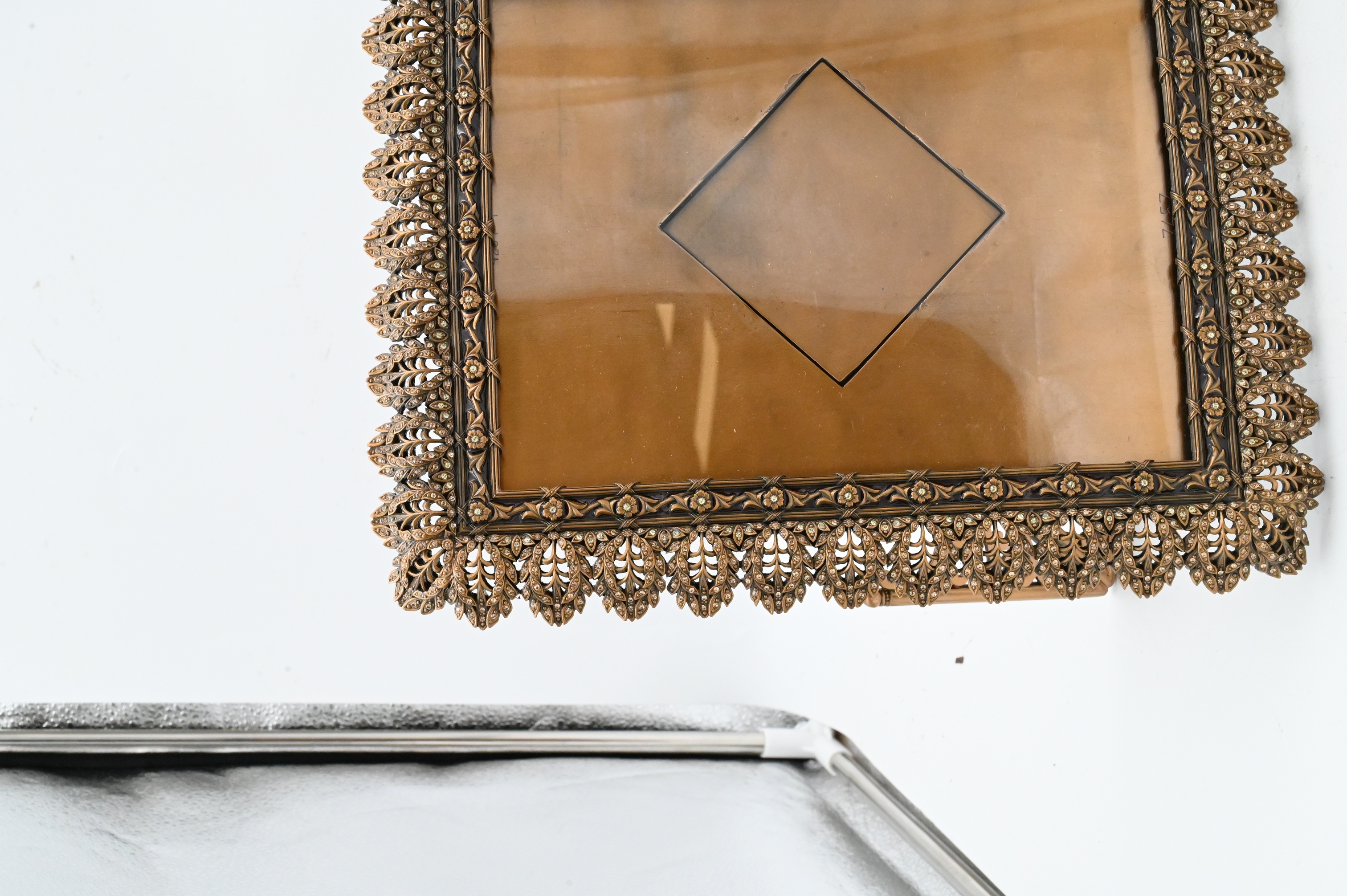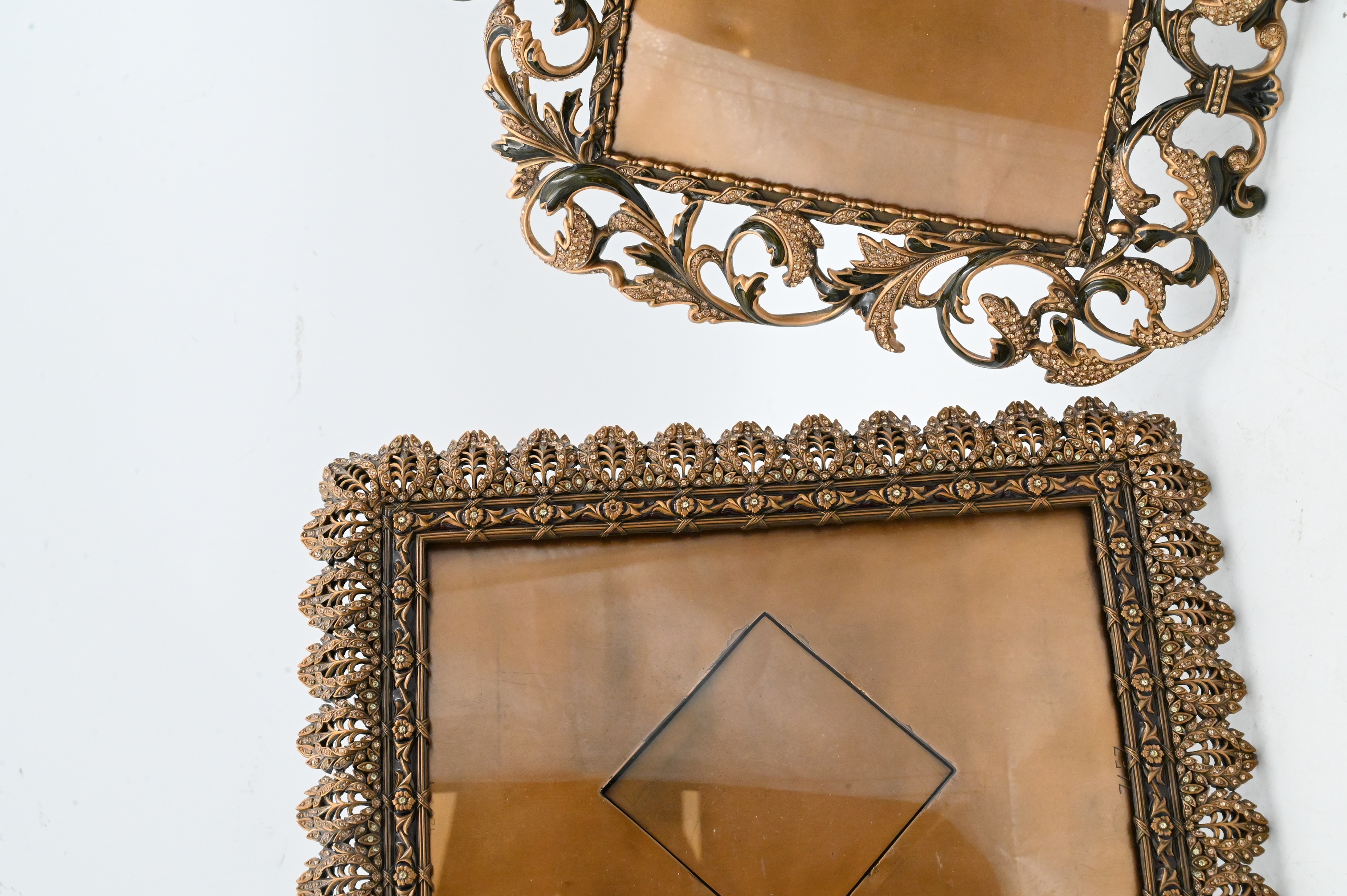 Art Nouveau style frame having scrolling foliate erinite green frame with topaz color stones No.7439, 11 1/2″ x 9″, along with Roman Holiday frame in museum gold No.7457 4261-1, 12″ x 10″ marked on verso Berebi Limited Edition