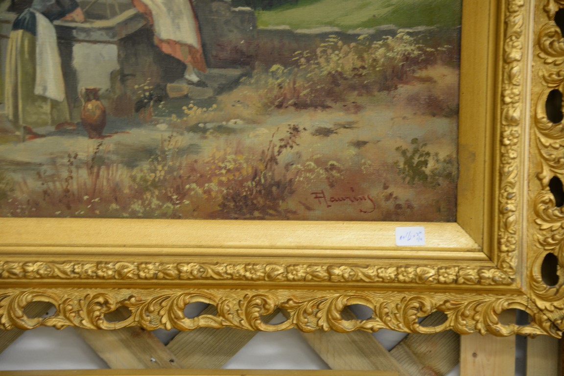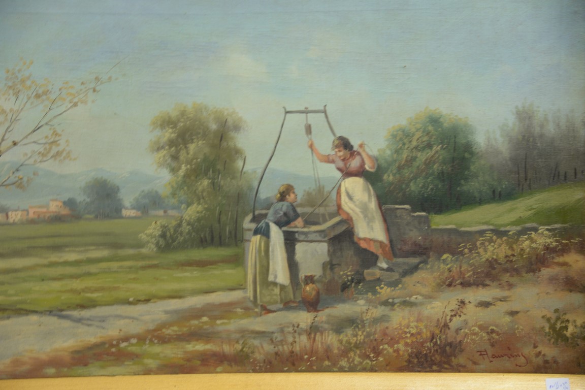 Lot 185: Two oil on canvas landscapes including two girls at a well signed F. Lauring 14 x 24 and a landscape signed AM Severance 1885 9…