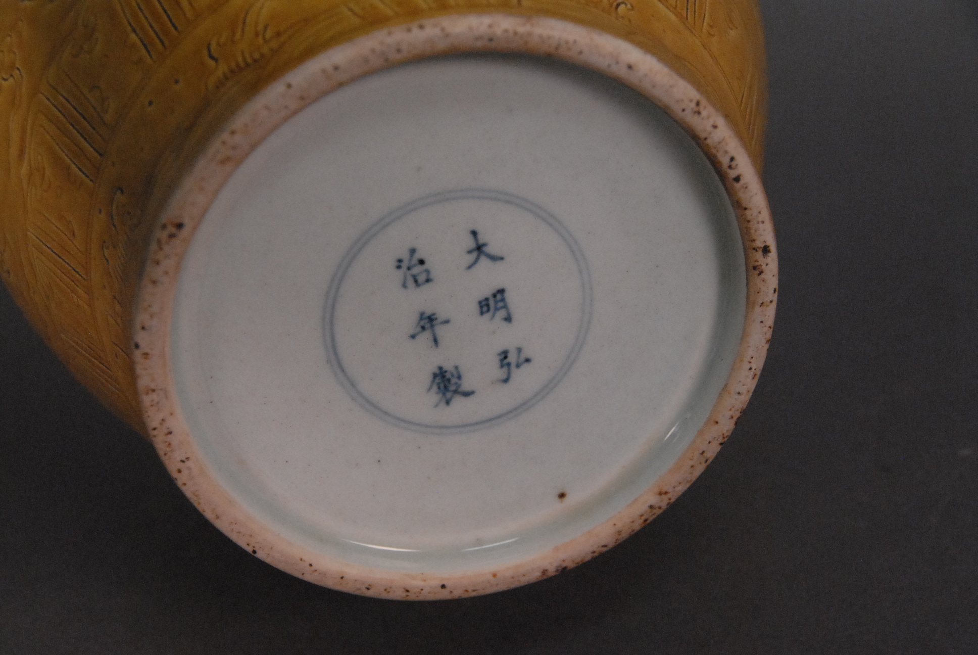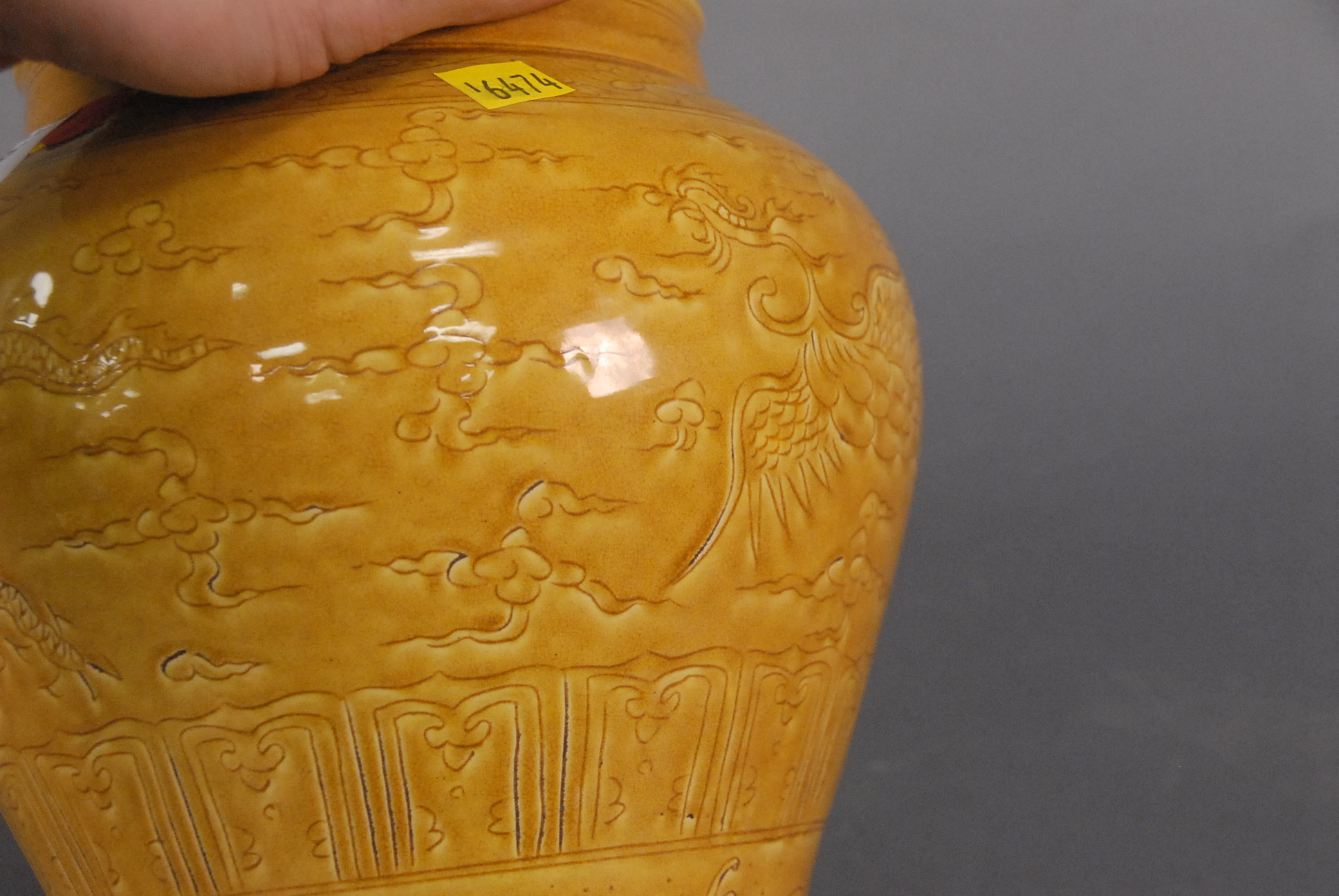 Yellow glazed five claw dragon vase having incised flying dragon with flaming clouds and underglazed blue six character mark, ht. 8 1/2in. as is