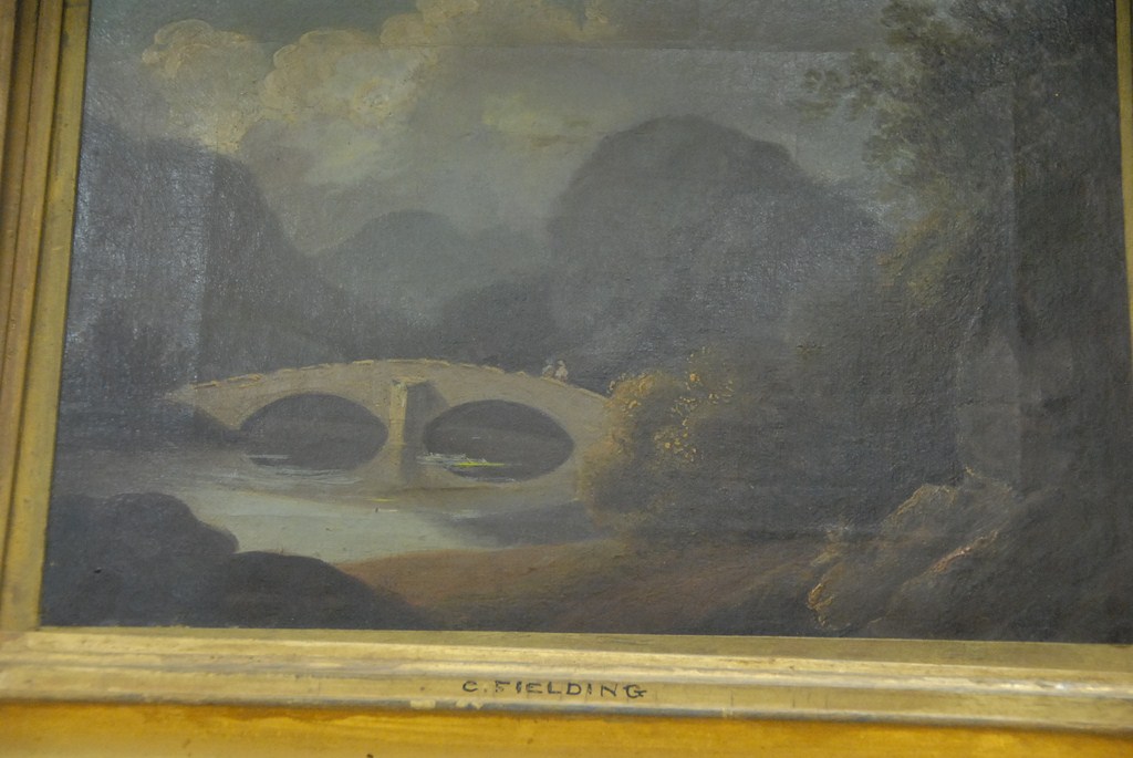 Lot 186: Anthony Van Dyke Copley Fielding 1787-1855 oil on canvas landscape with bridge signed lower right C. Fielding, 9 x 12 1/2.