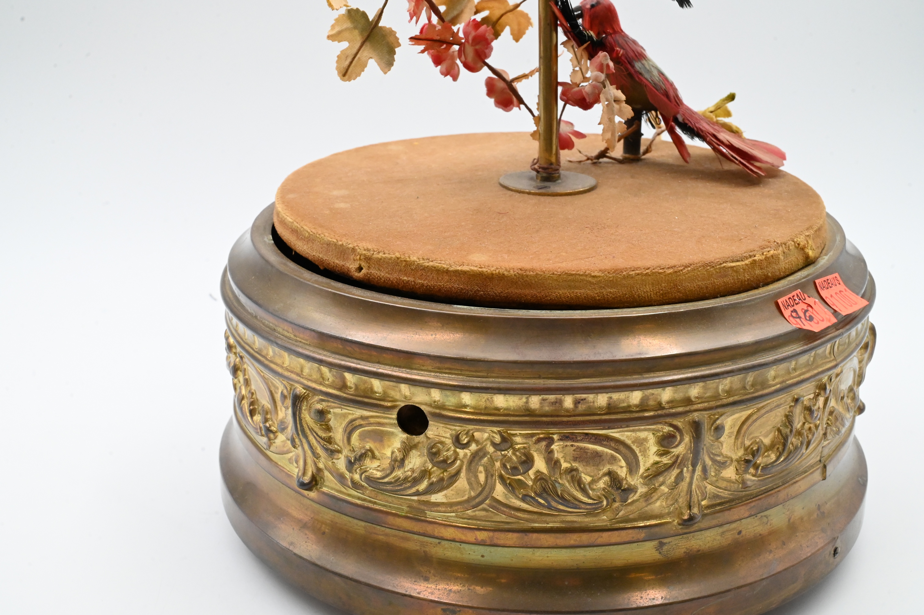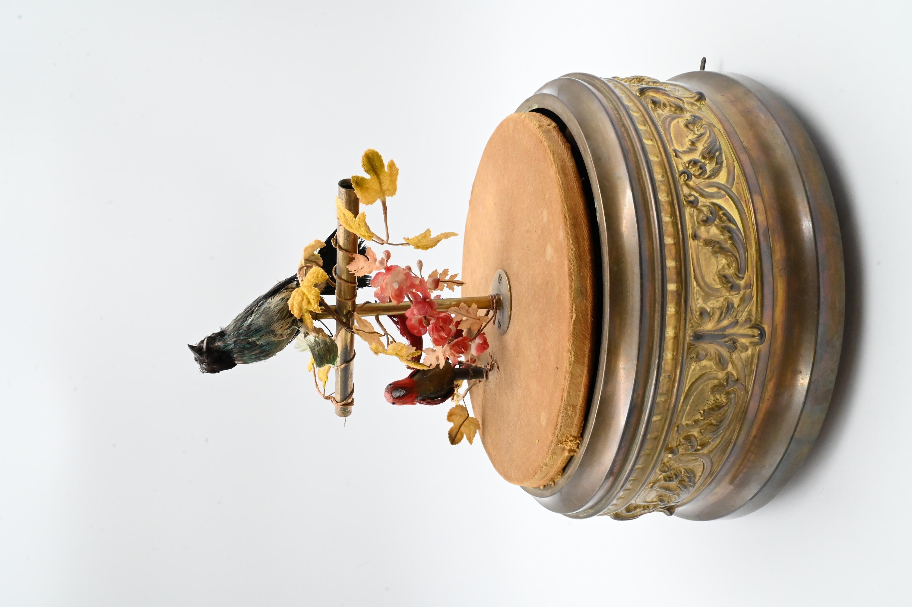 gilt-brass bird cage automaton featuring two feathered birds perched on a naturalistic branch, one in bright red plumage and the other in blue, the cylindrical gilt-metal base is richly cast with scrolling acanthus ornament, supporting a domed cage with ring handle, when wound, the birds move and “sing” via internal bellows and clockwork mechanism marked on base “Made in France” with serial number 321