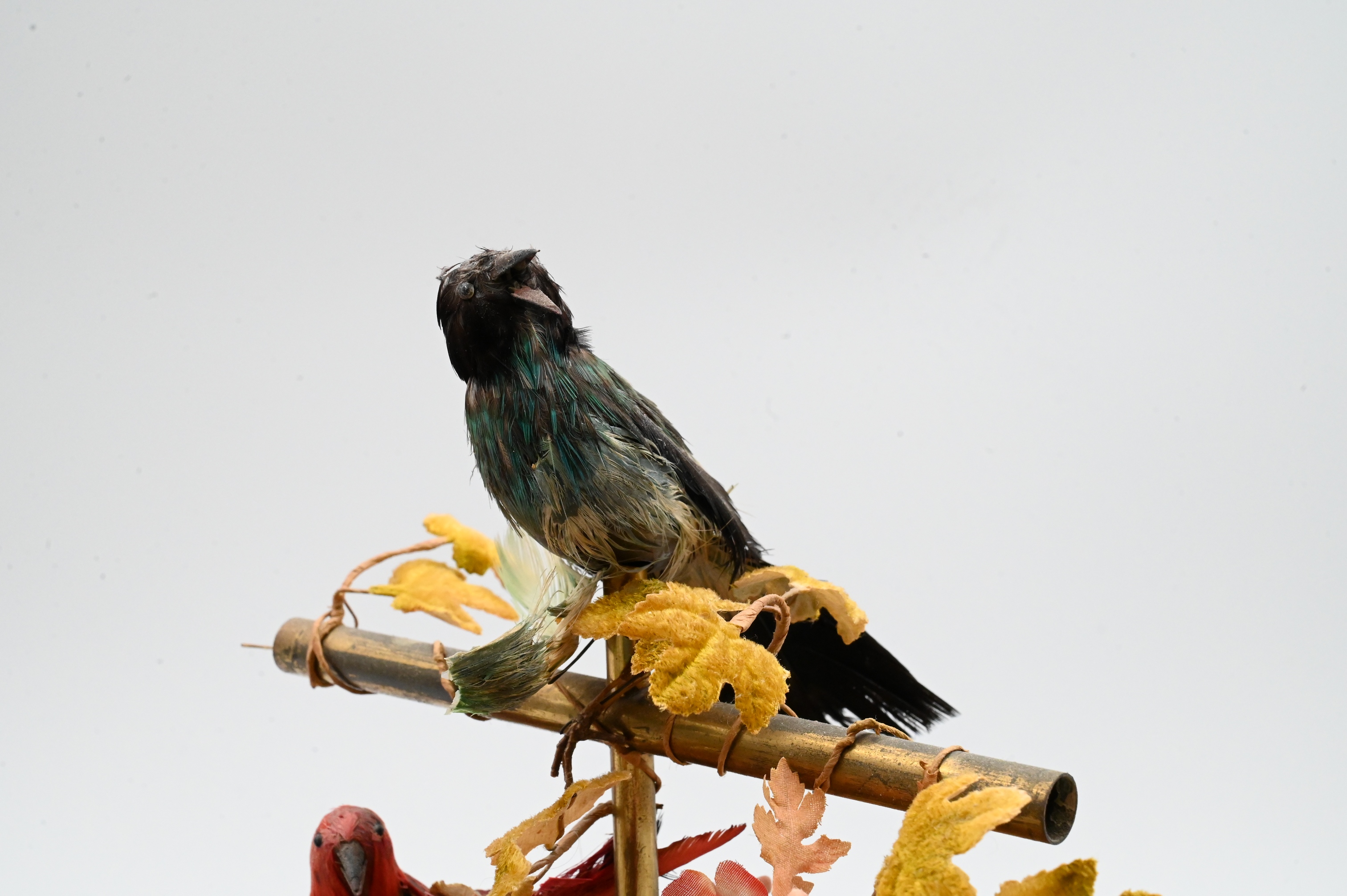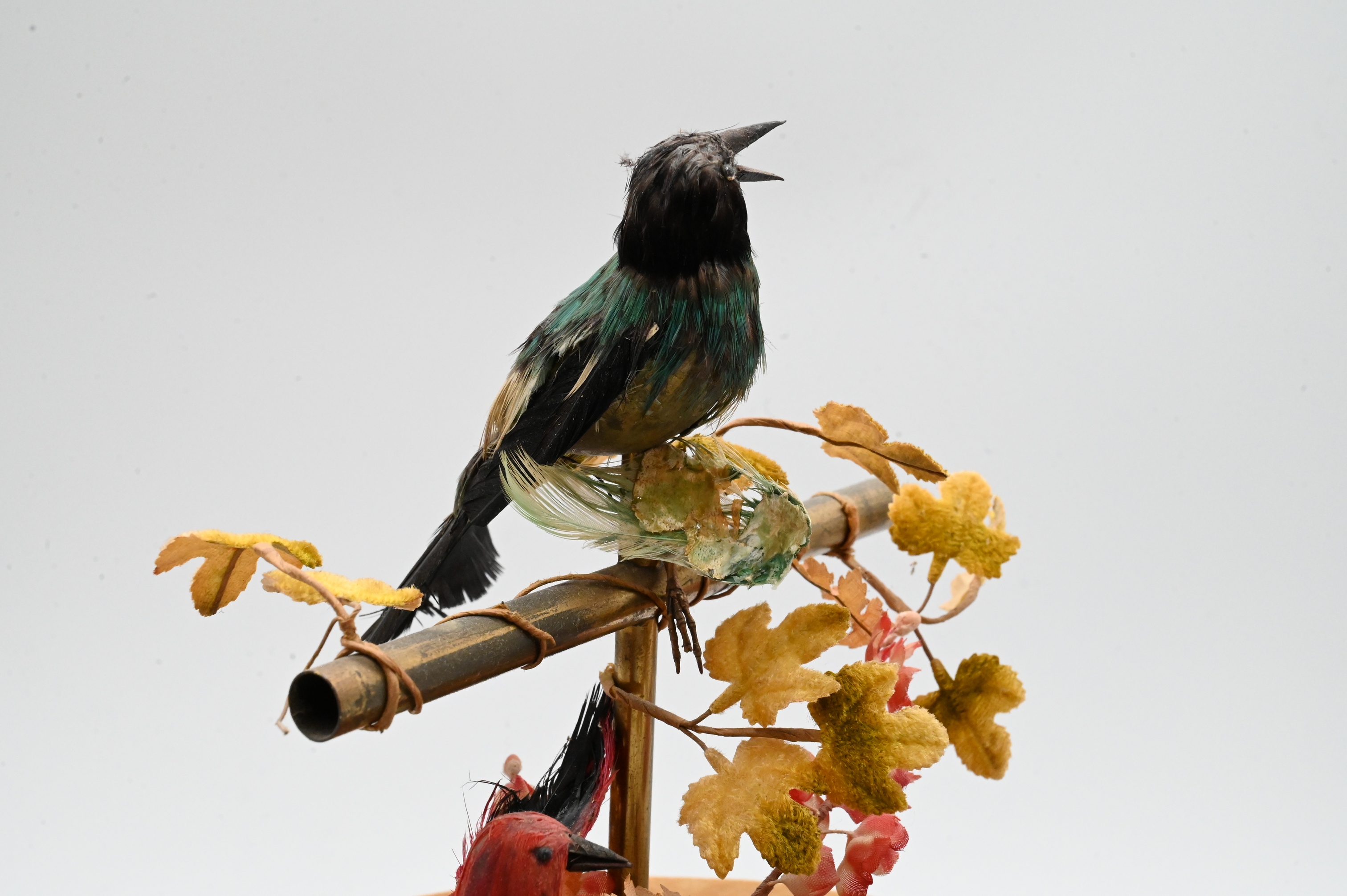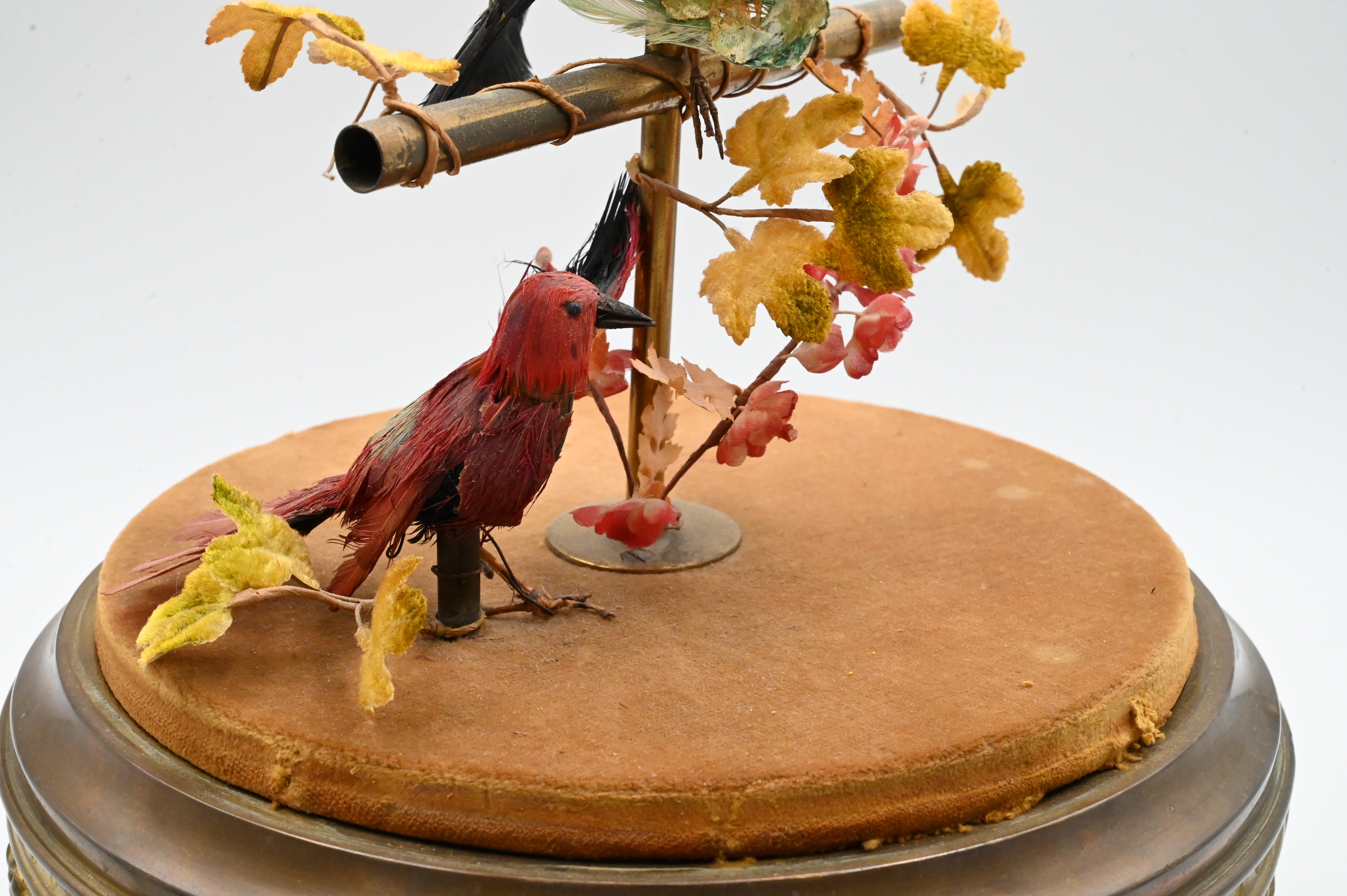 Presents well, birds’ feathers with losses and some detached, felt has some stains and small rips along the edges, top of cage not attached, lifts off base