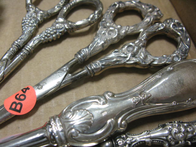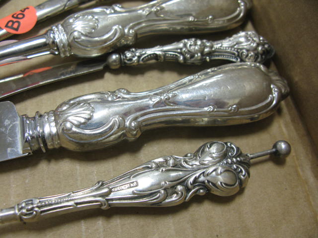 Box lot with sterling handled pieces, knives, shears and crystal jar