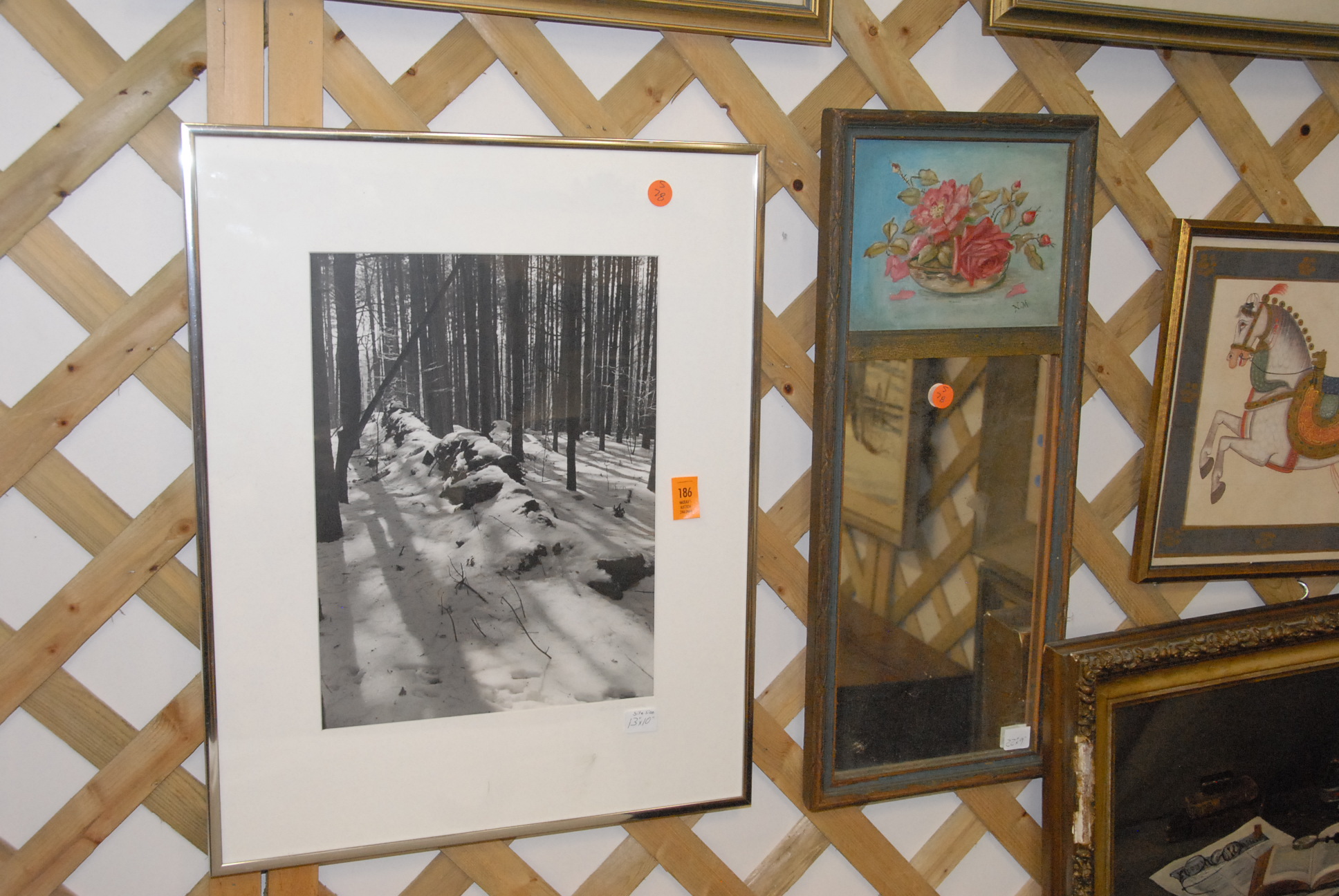 Five piece lot including two needle work pictures of birds, a mirror, horse figure, horse picture, and a photograph signed E.R Schade.