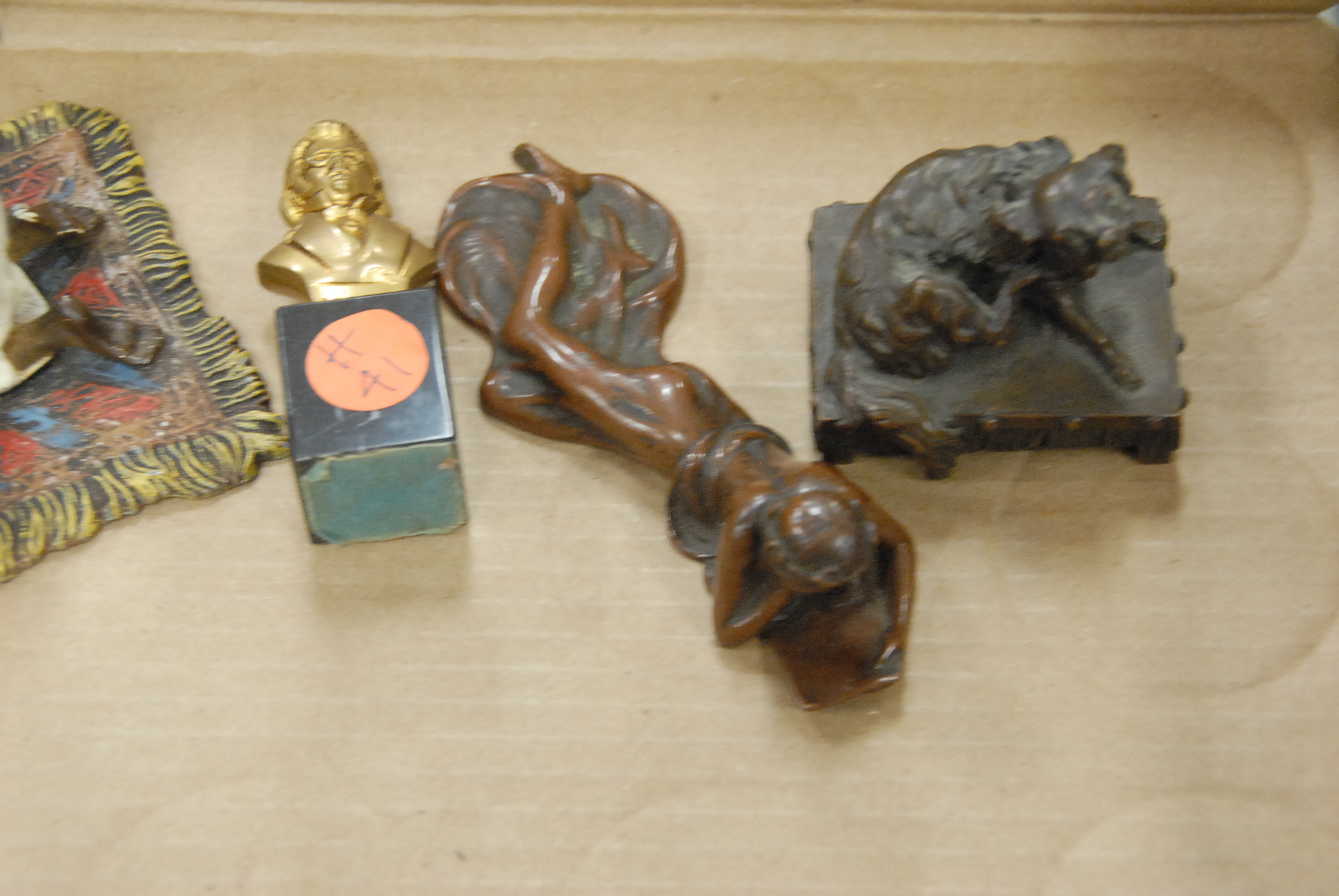Four piece lot including a bronze of a nude woman, bronze dog, bronze bust, and a white metal Mid Eastern figure.