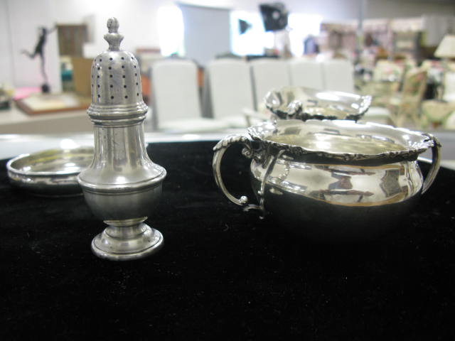 Four sterling silver pieces to include small porringer, creamer, sugar and salt
