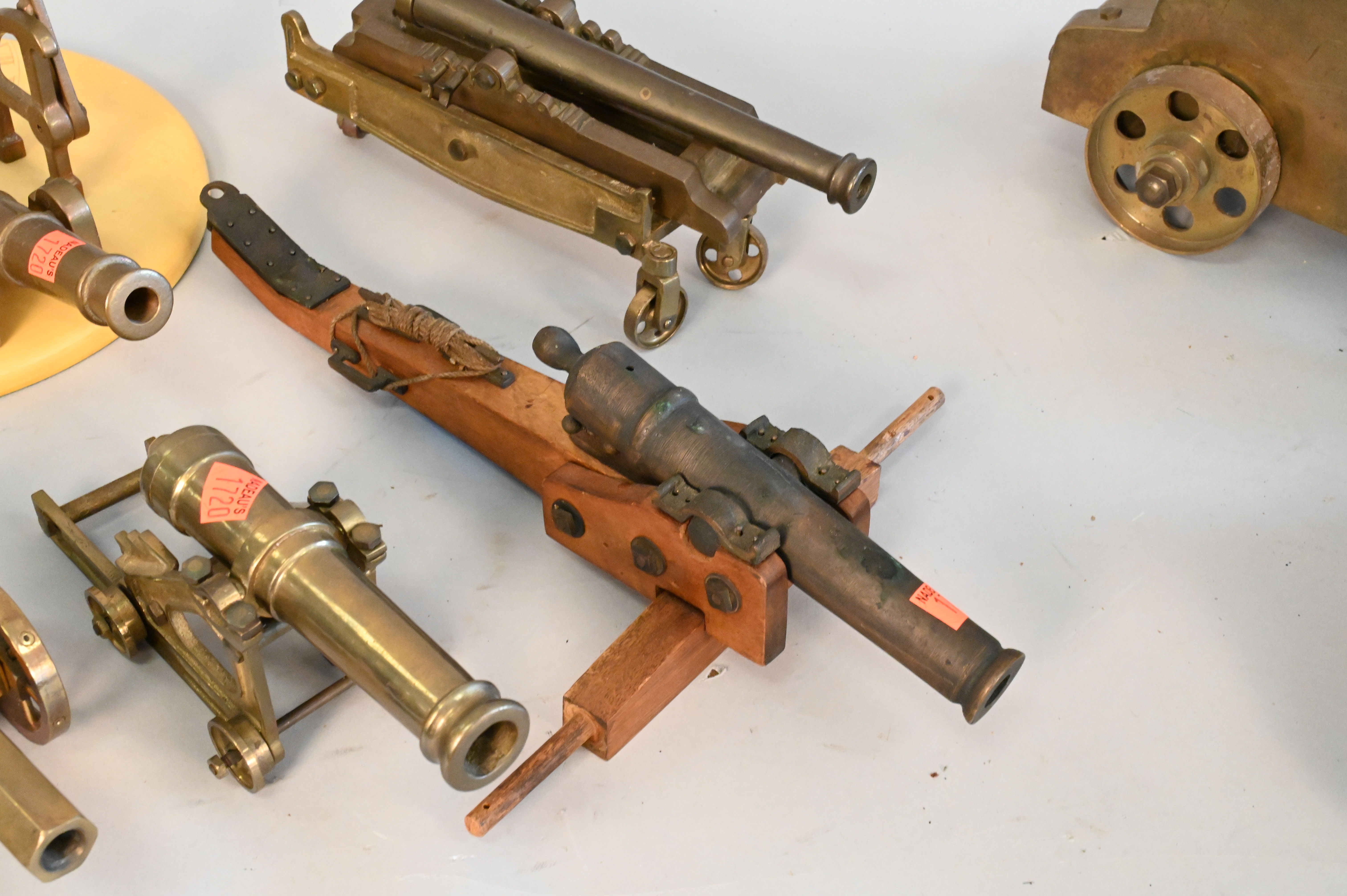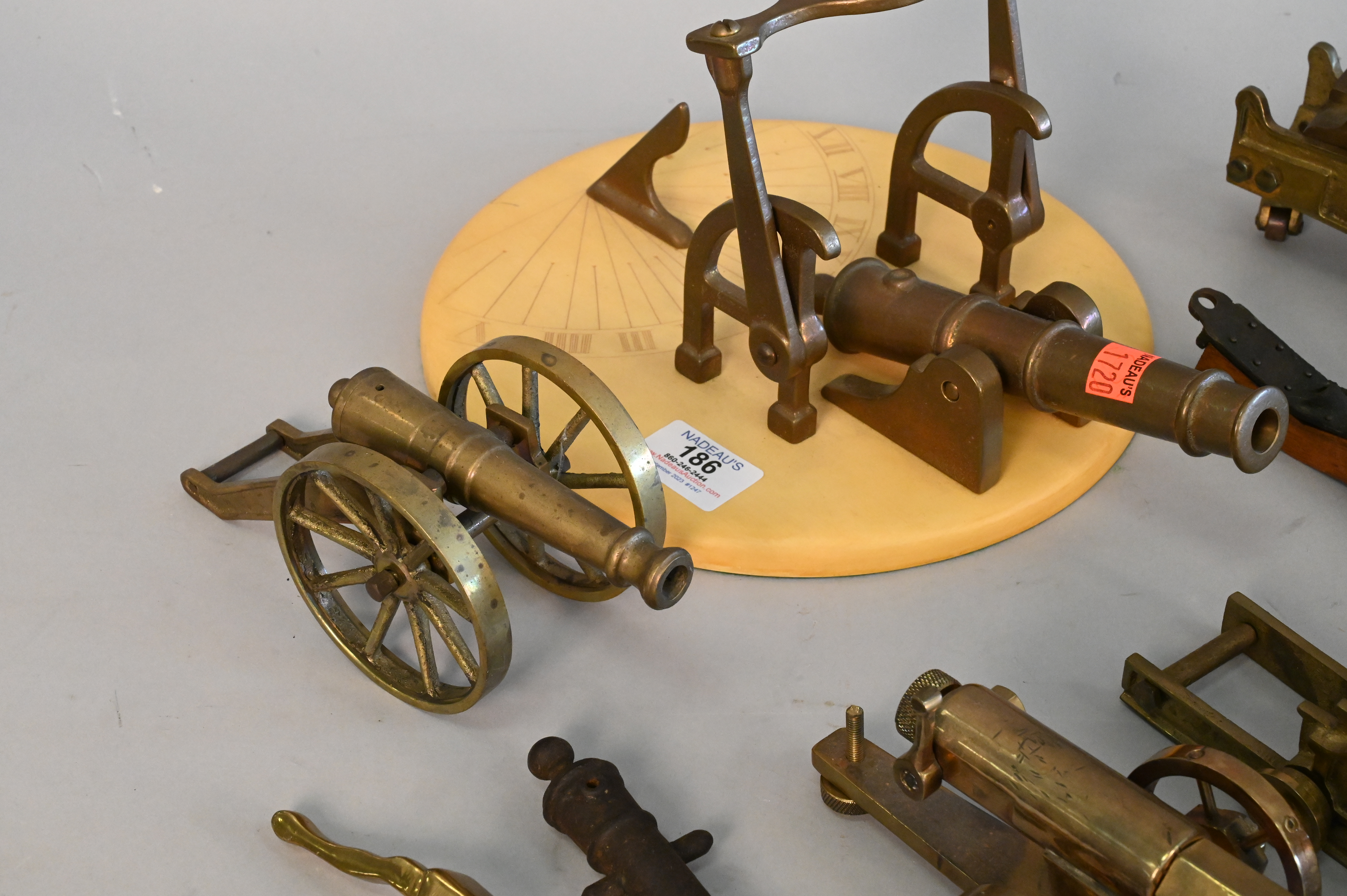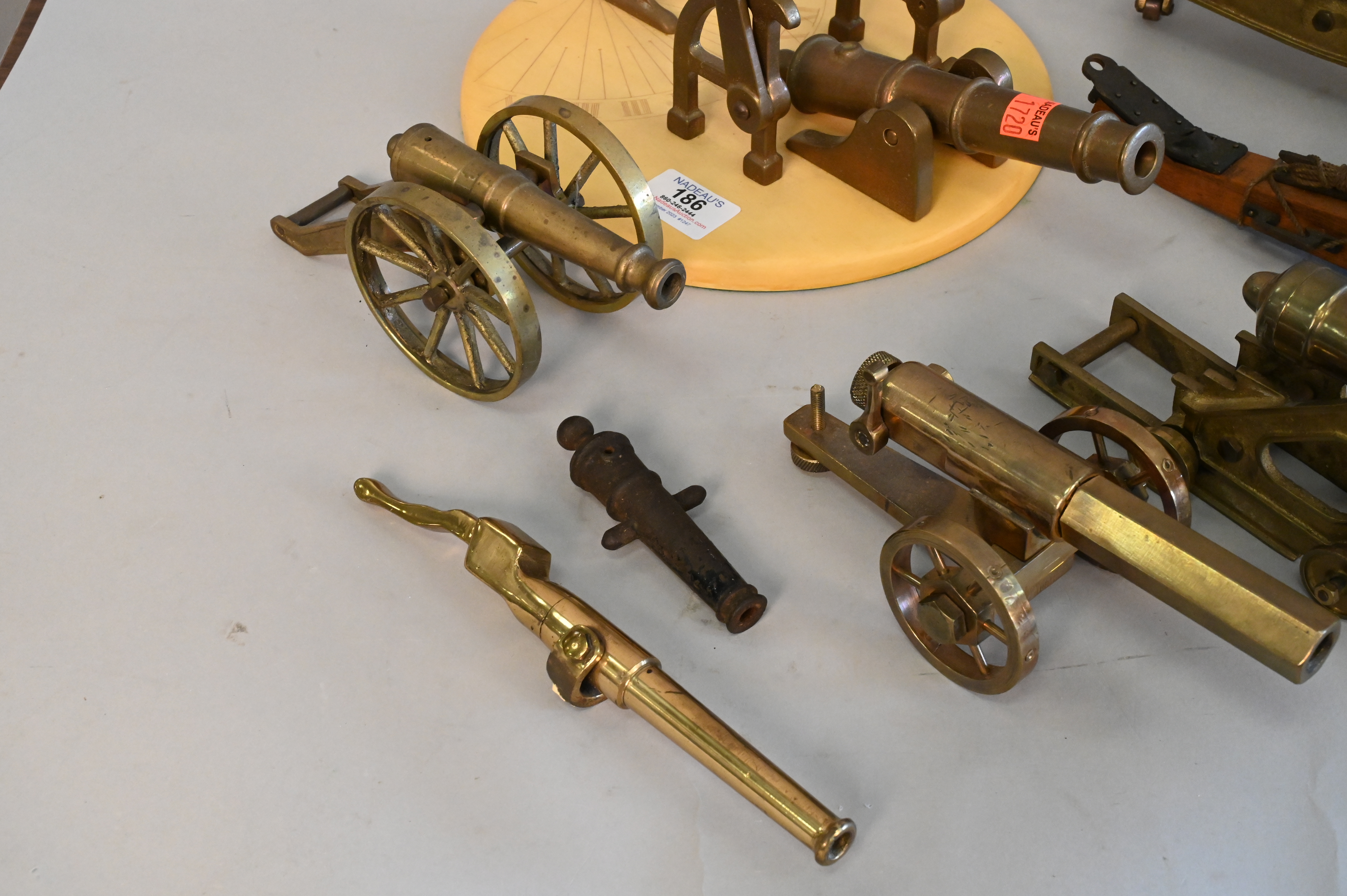 Group of Eight Miniature Brass, Iron and Wood Cannons, some on wheels, one turned into a sundial, largest length 15 inches.