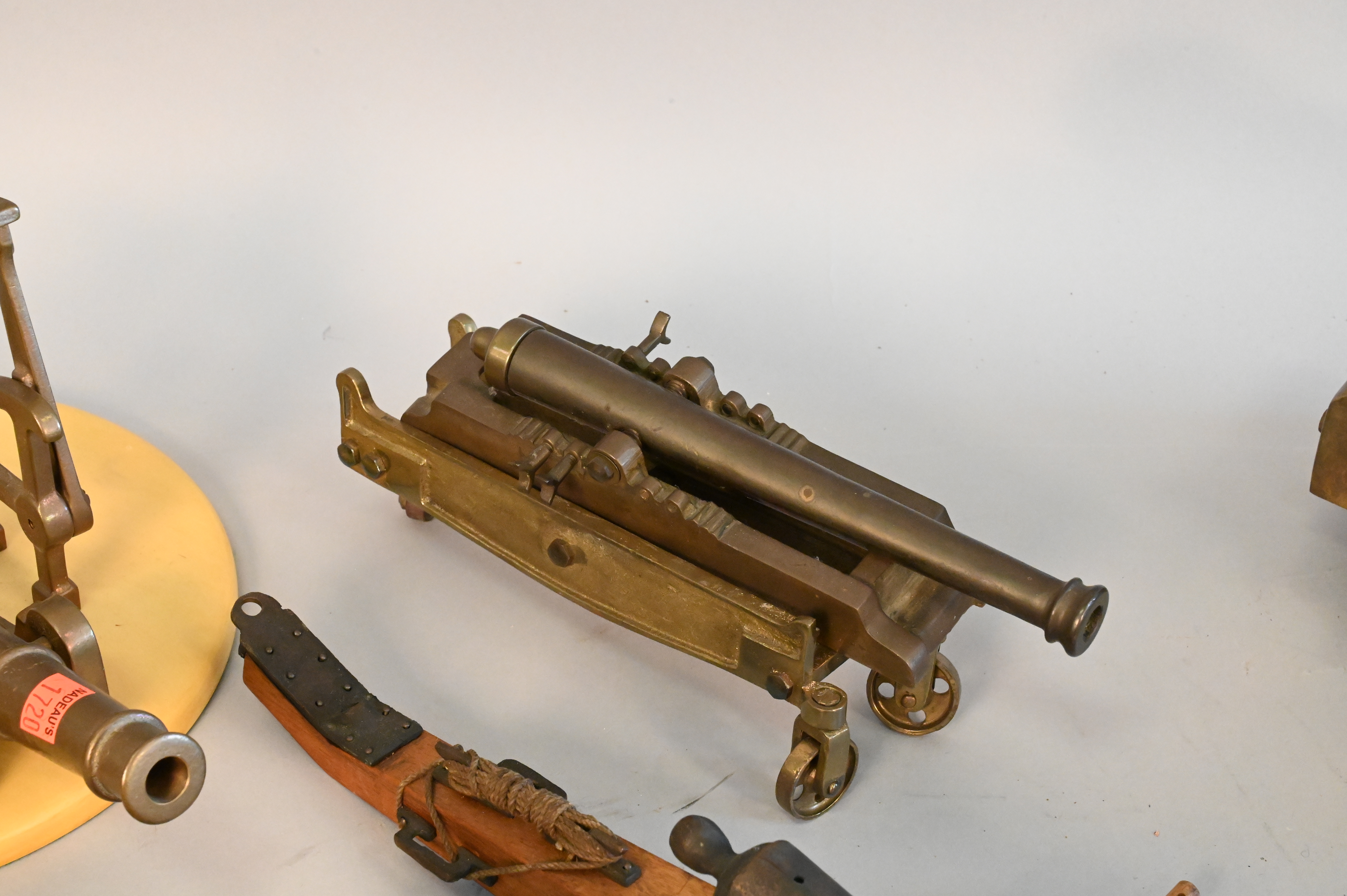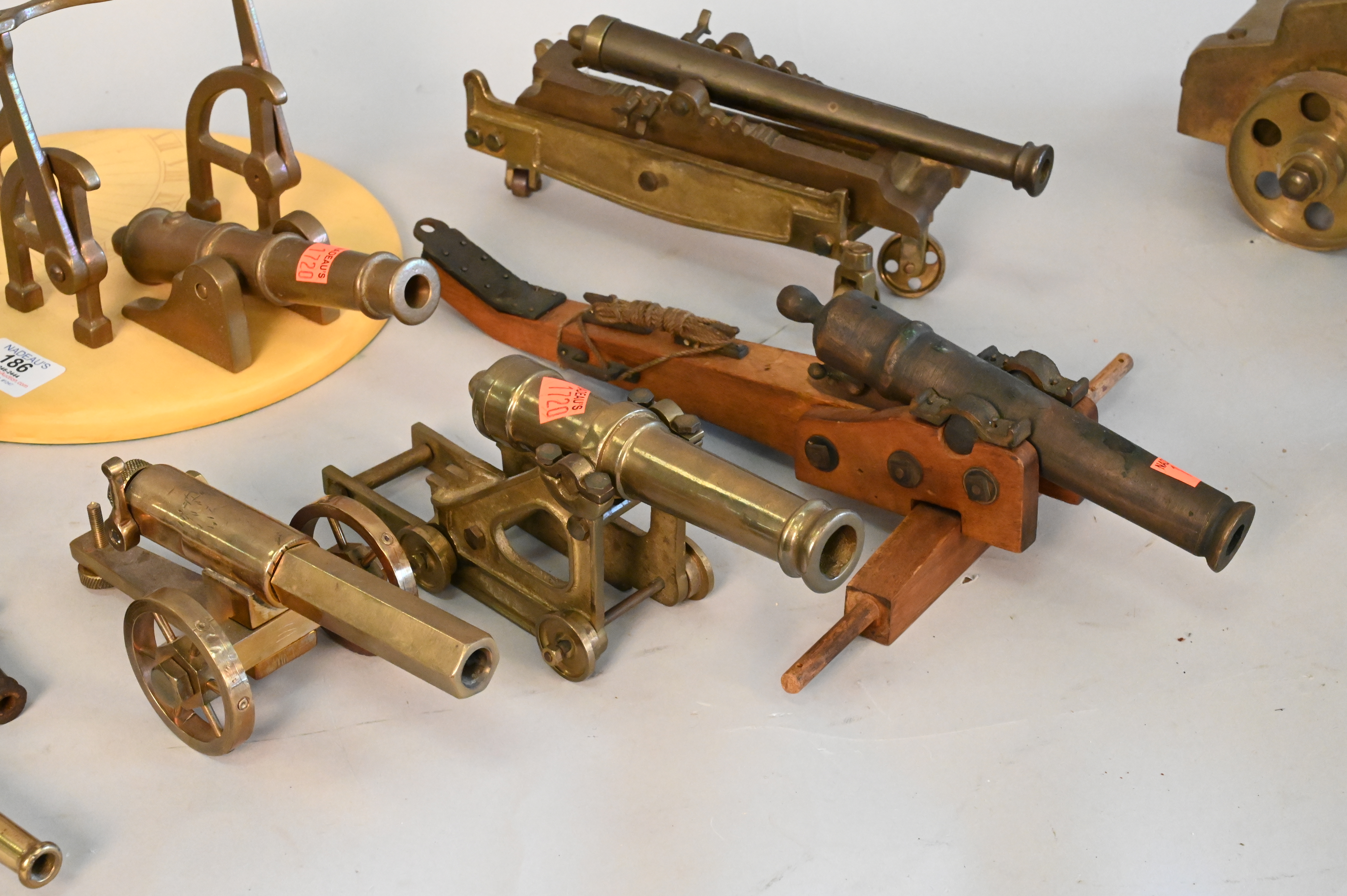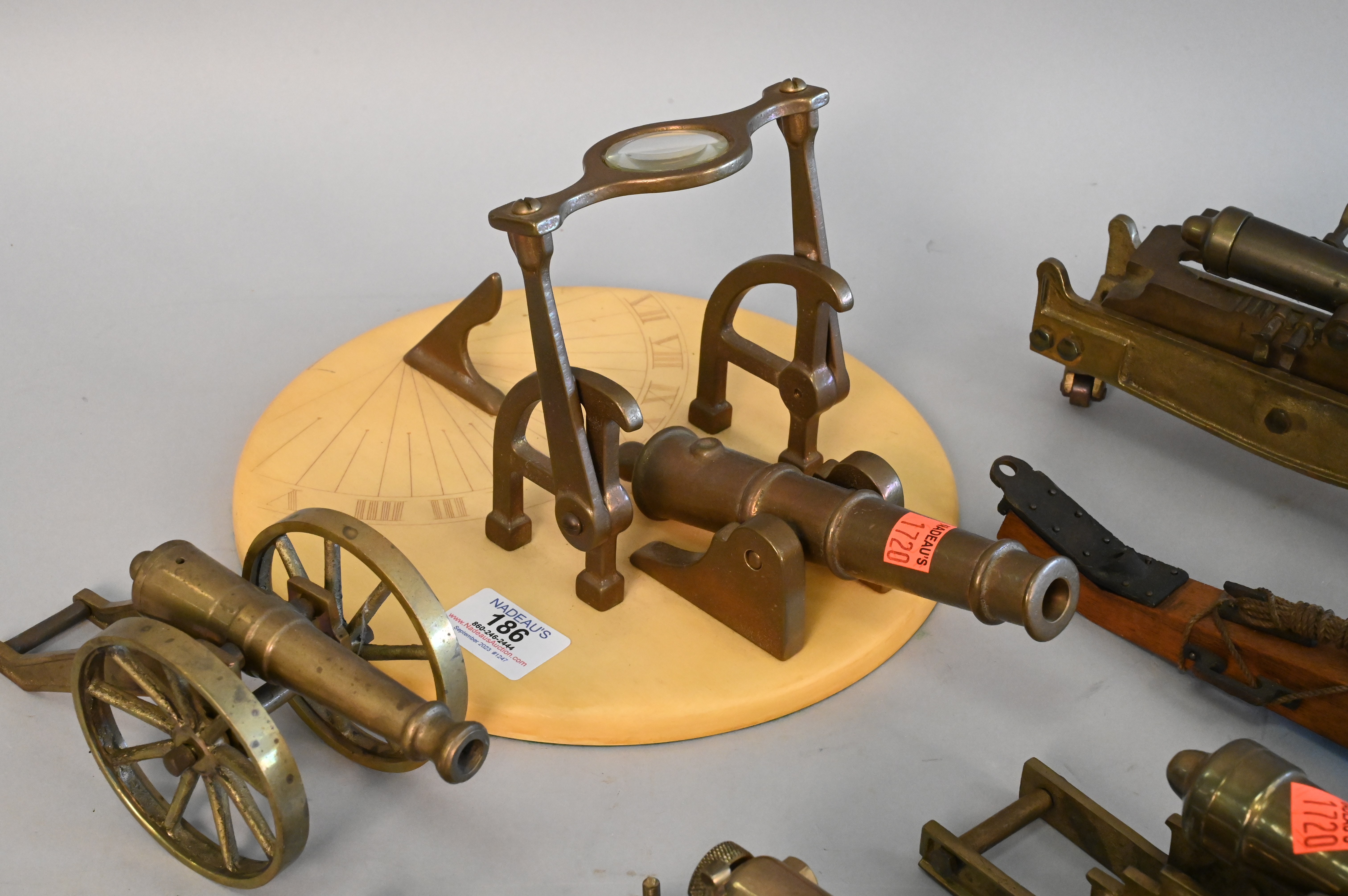 Group of Eight Miniature Brass, Iron and Wood Cannons, some on wheels, one turned into a sundial, largest length 15 inches.