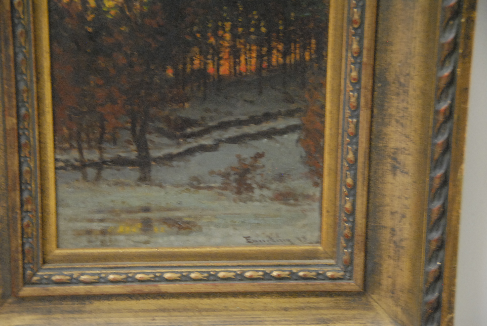 John Joseph Enneking 1841-1916 WINTER LANDSCAPE WITH SUNSET signed lower right Enneking 8 1/2 x 7 1/4