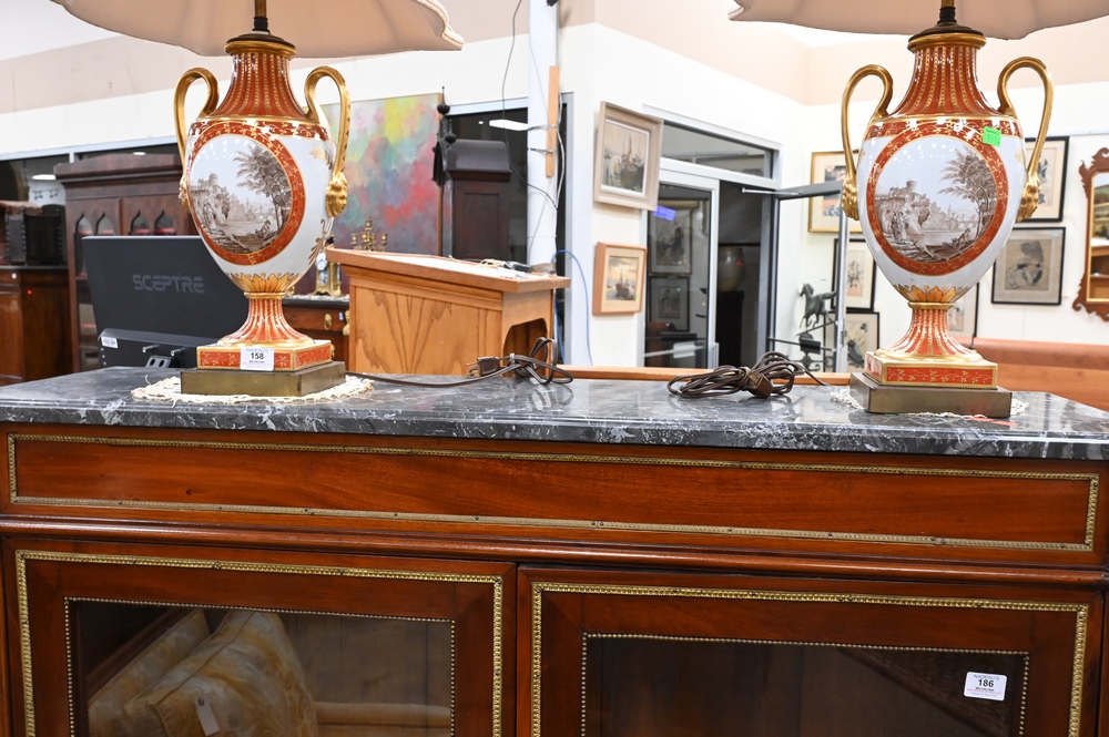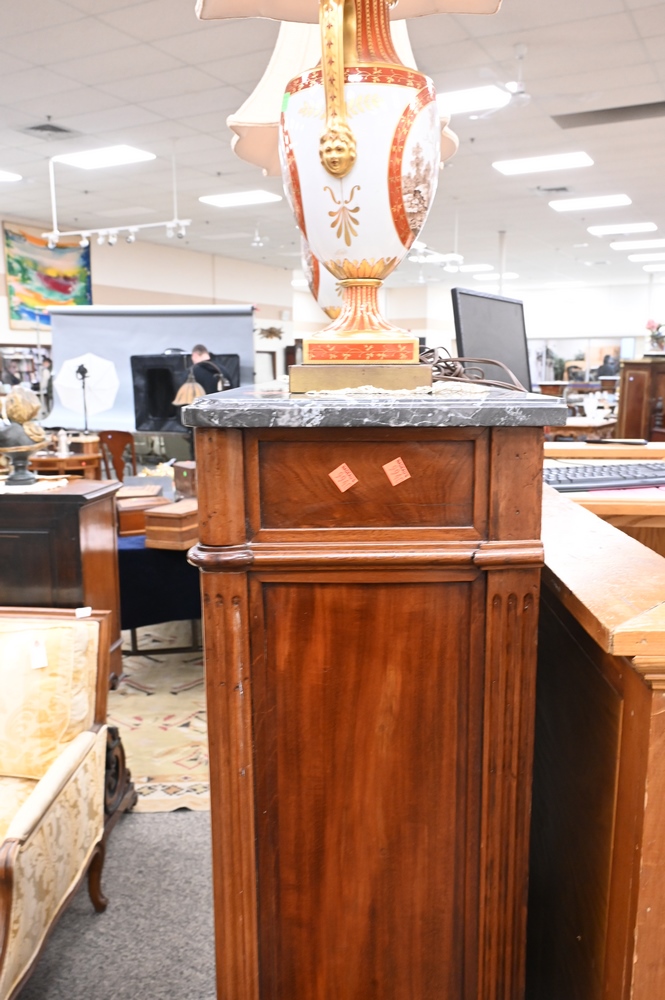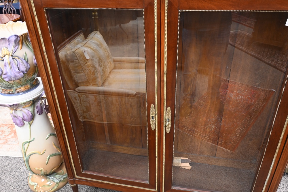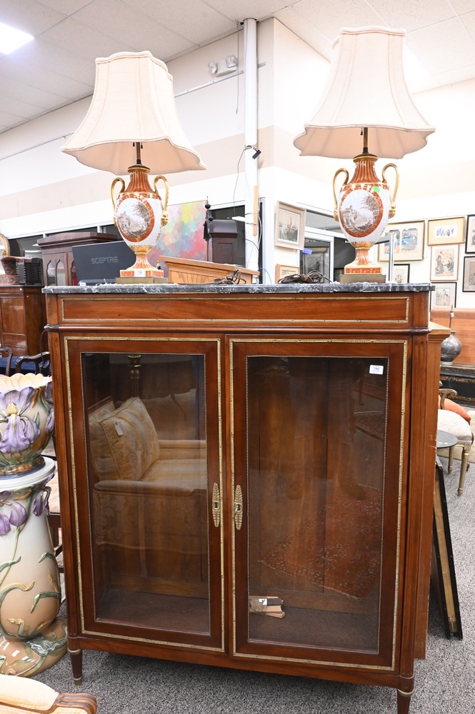 Lot 186: Louis XVI Style Bookcase, having grey marble top over two glass doors, (no shelves), height 58 inches, top 13″ x 49 1/2″.