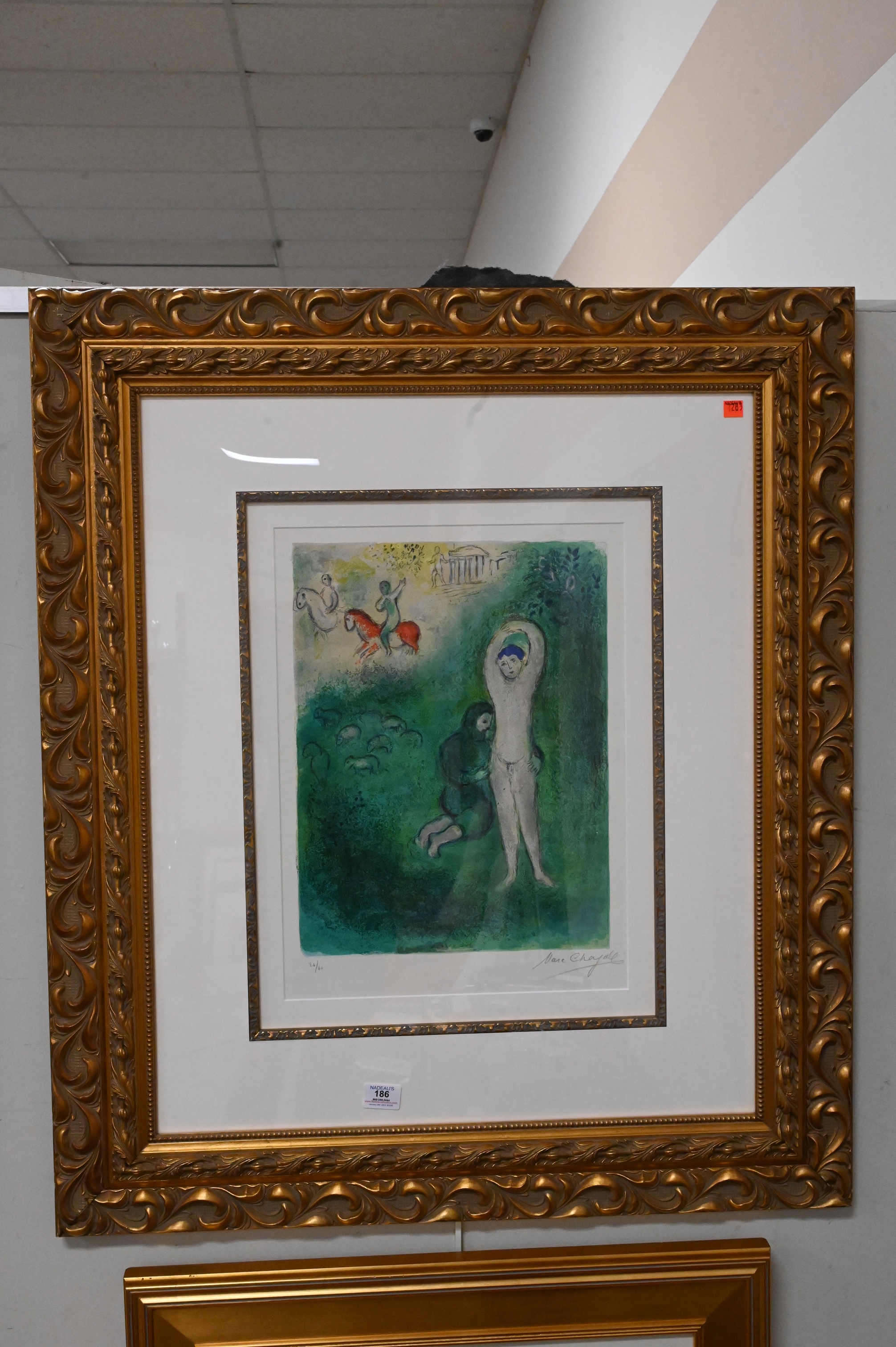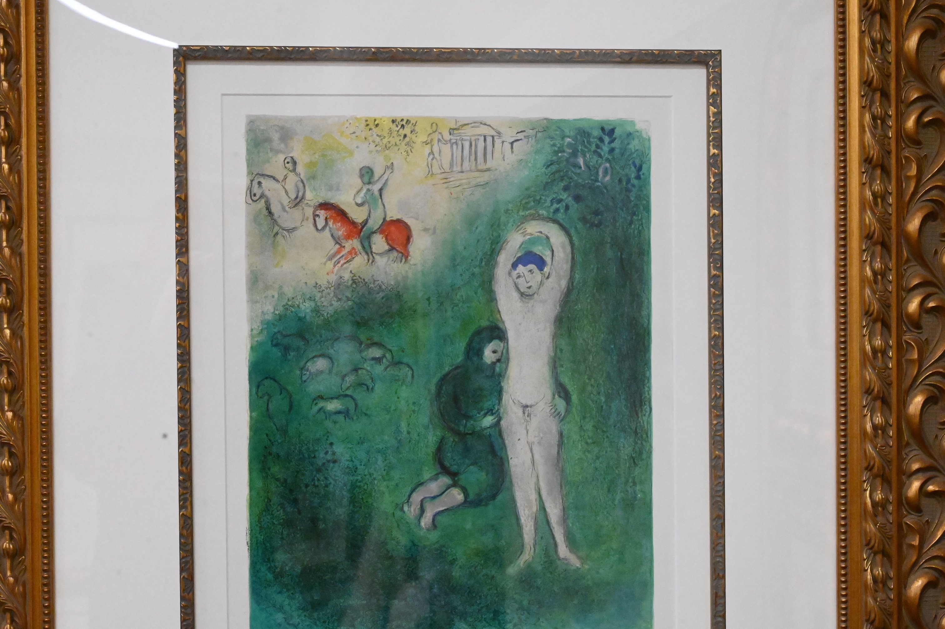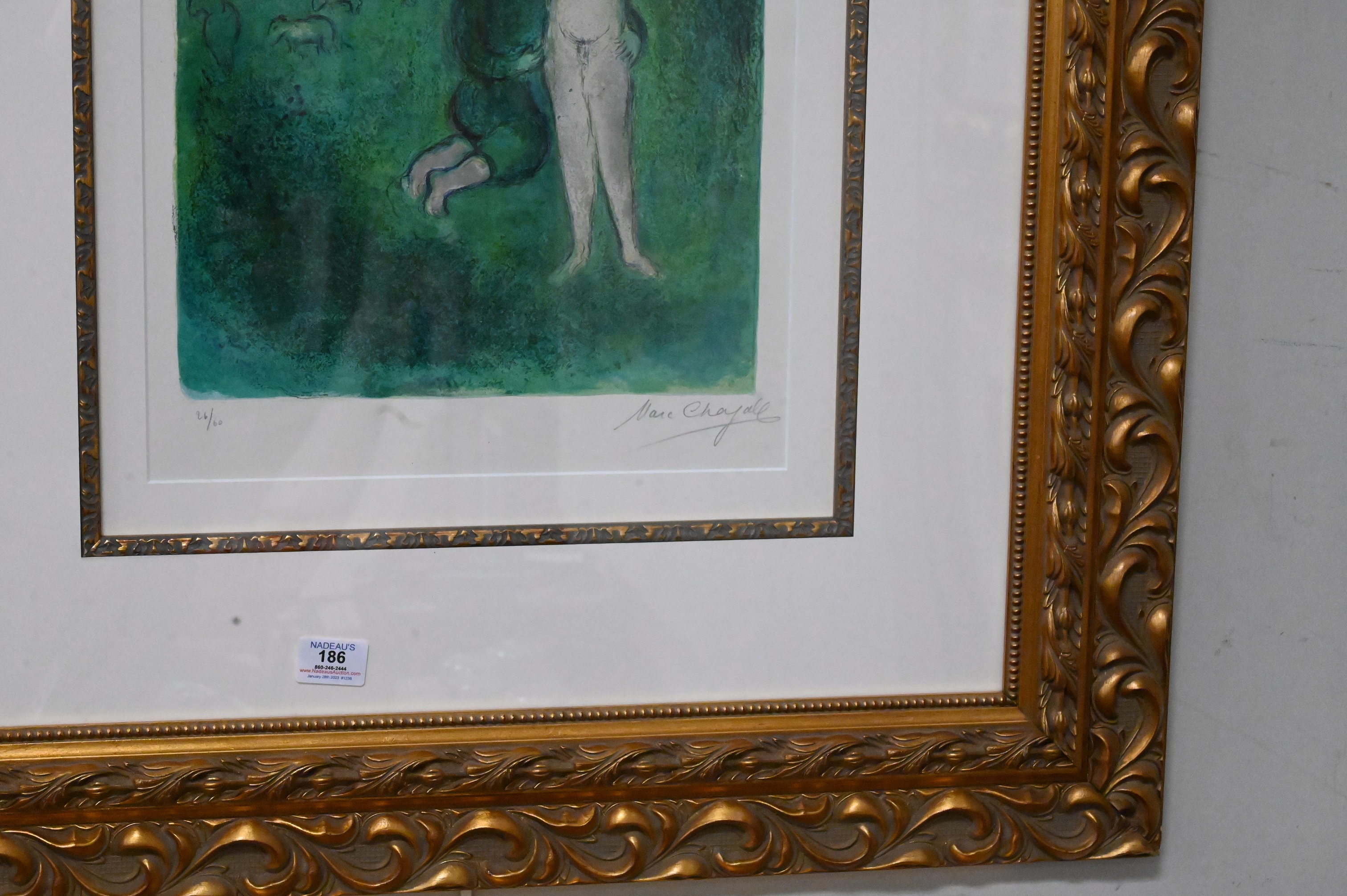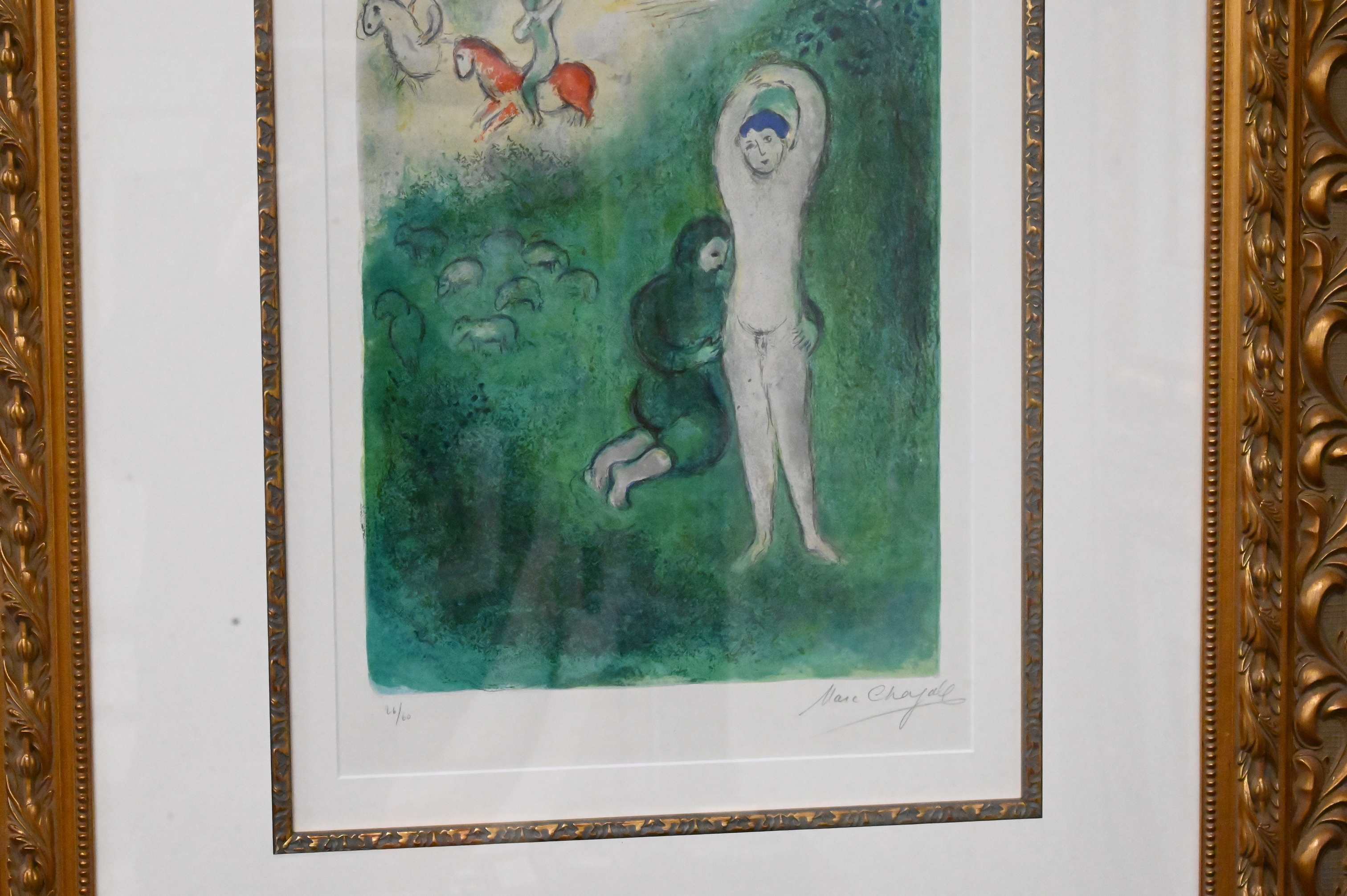 Marc Chagall (1887 – 1985), lithograph in colors, “Daphnis et Grathon”, signed lower right, numbered lower left 26/60, sight size 19″ x 14″, paper having Arc watermark for Arches paper.