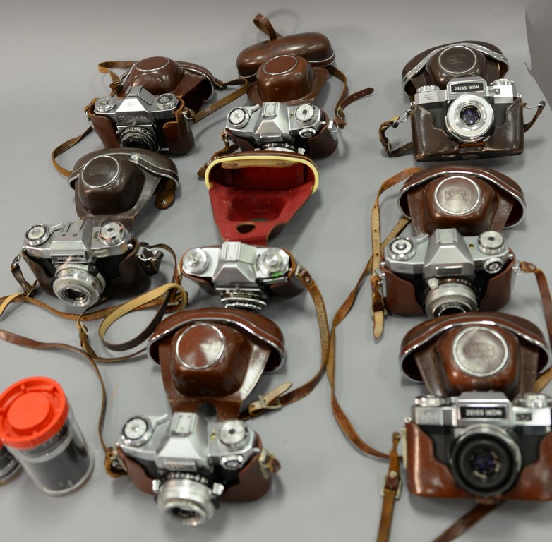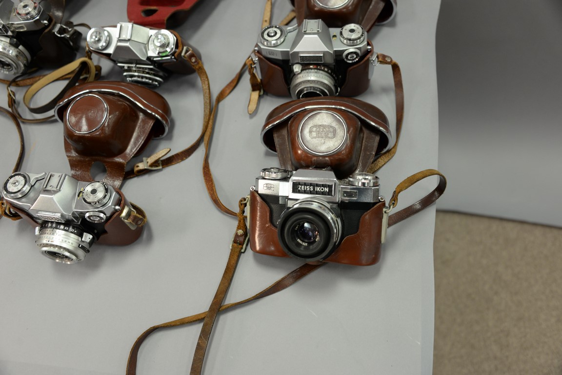 One box lot: Group lot of Zeiss Contaflex camera lenses including 3 Contaflex Super new style with cases, Contaflex II with case, 3 Contaflex Super with cases, Contaflex I, Contaflex 126 lens Distagon 32/2.8, and Contaflex 126 lens Tele Tessar 135/4.