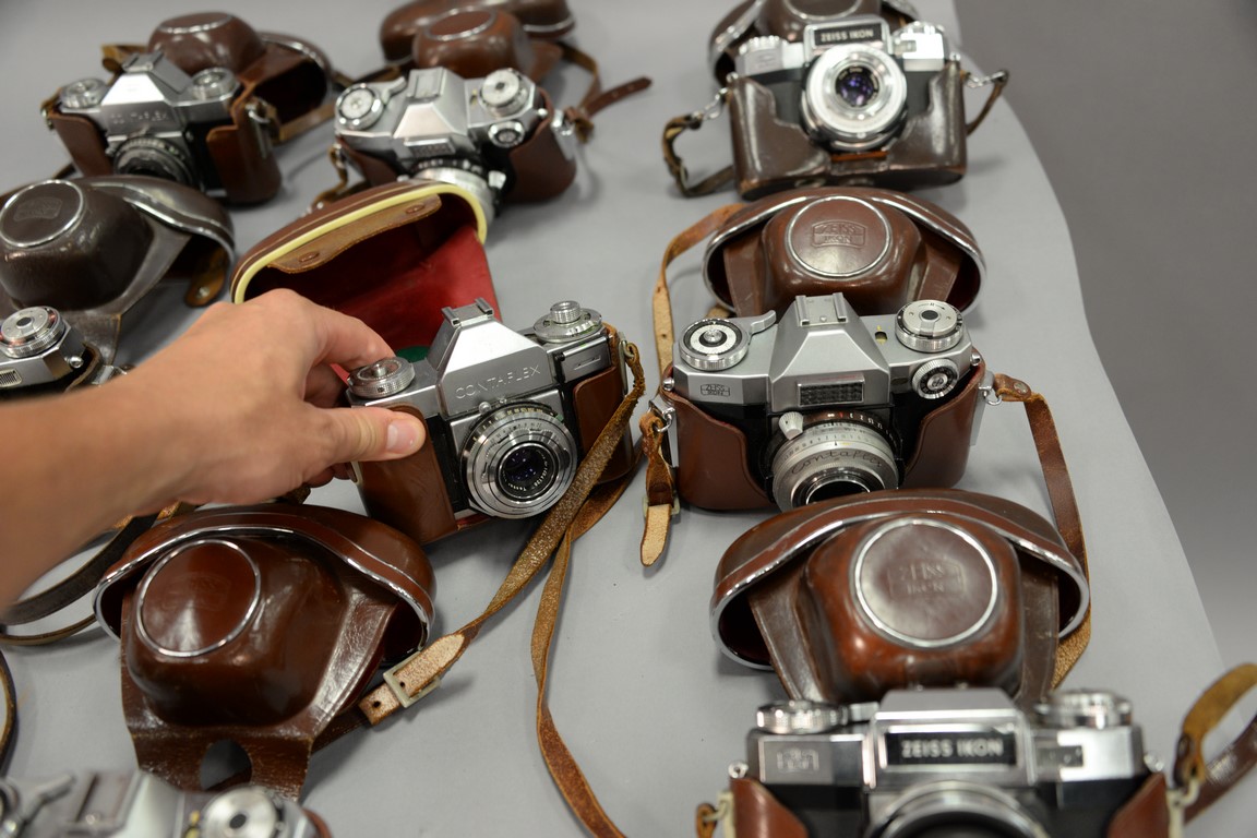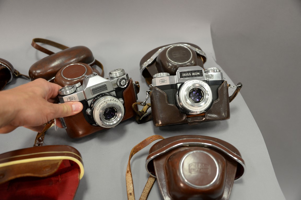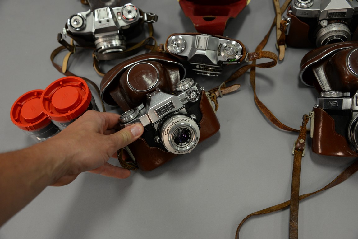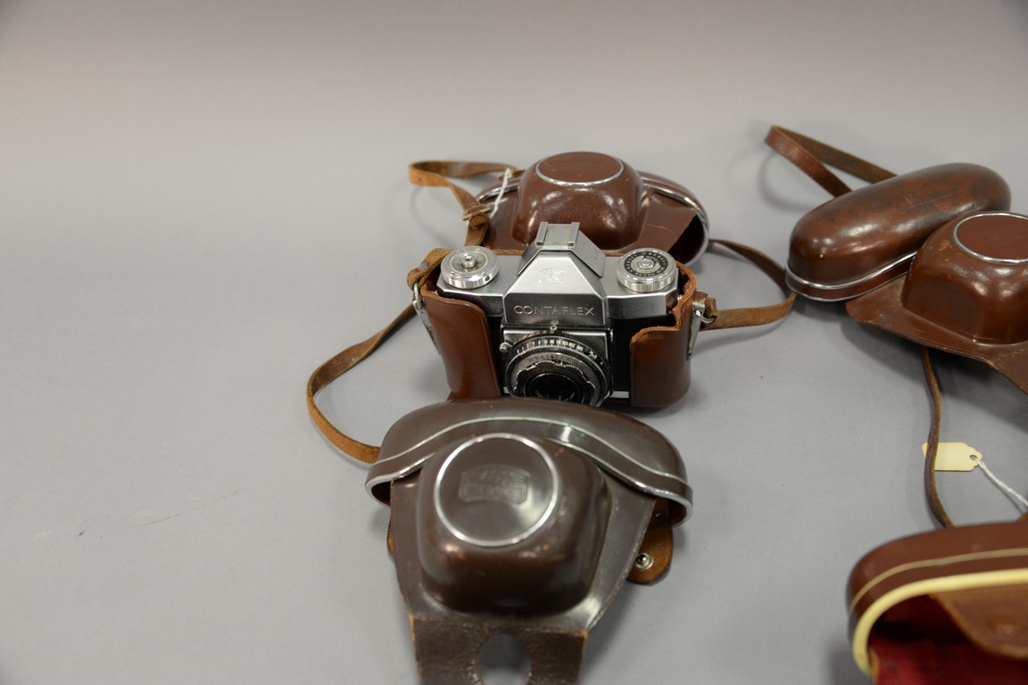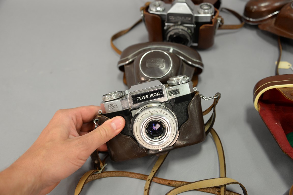 Lot 186: One box lot: Group lot of Zeiss Contaflex camera lenses including 3 Contaflex Super new style with cases, Contaflex II with cas…