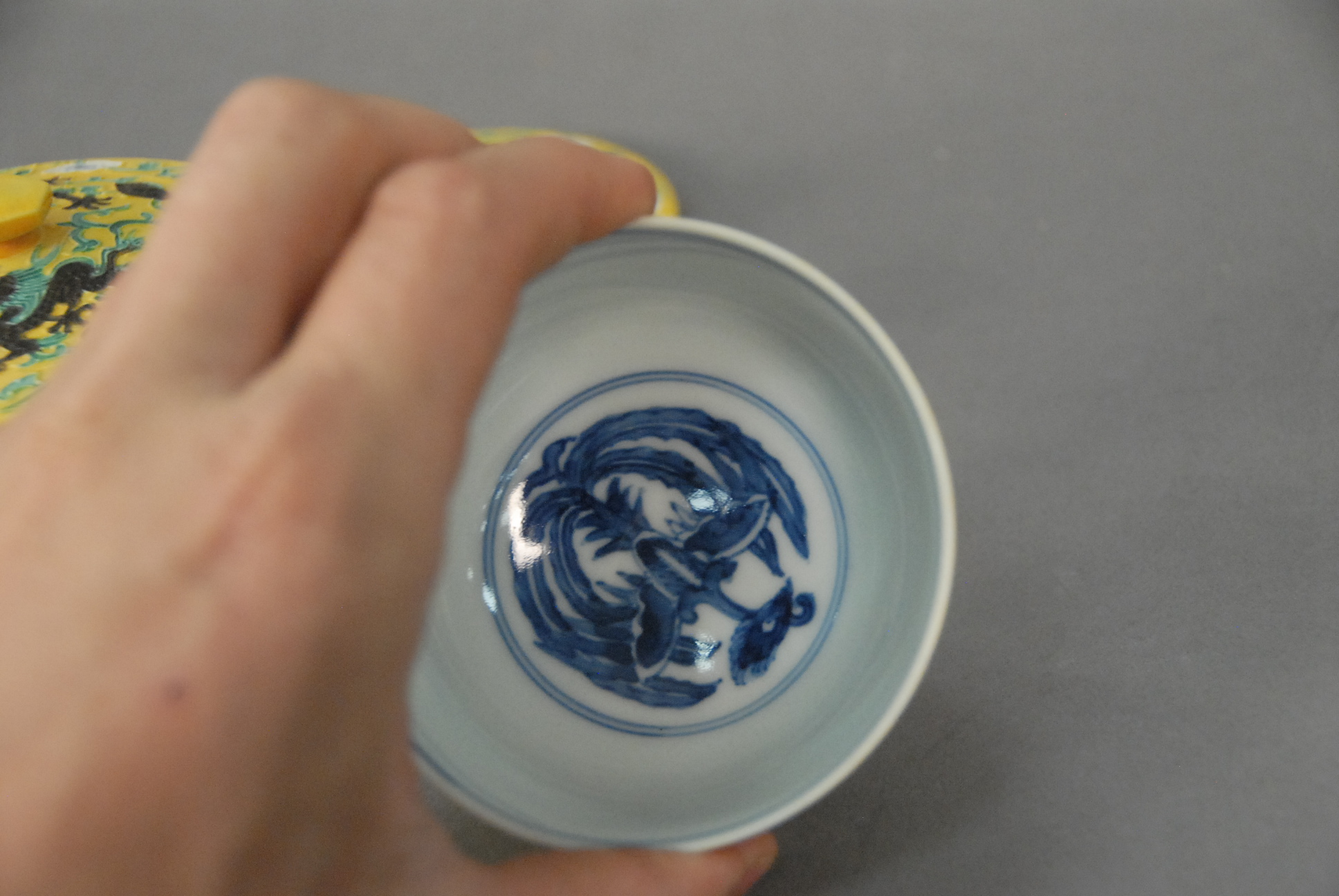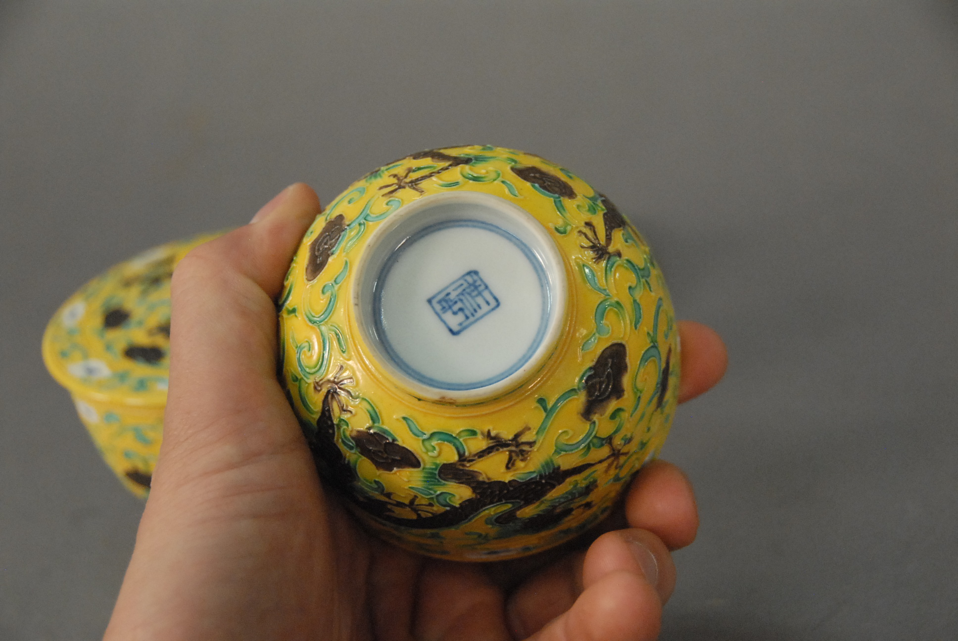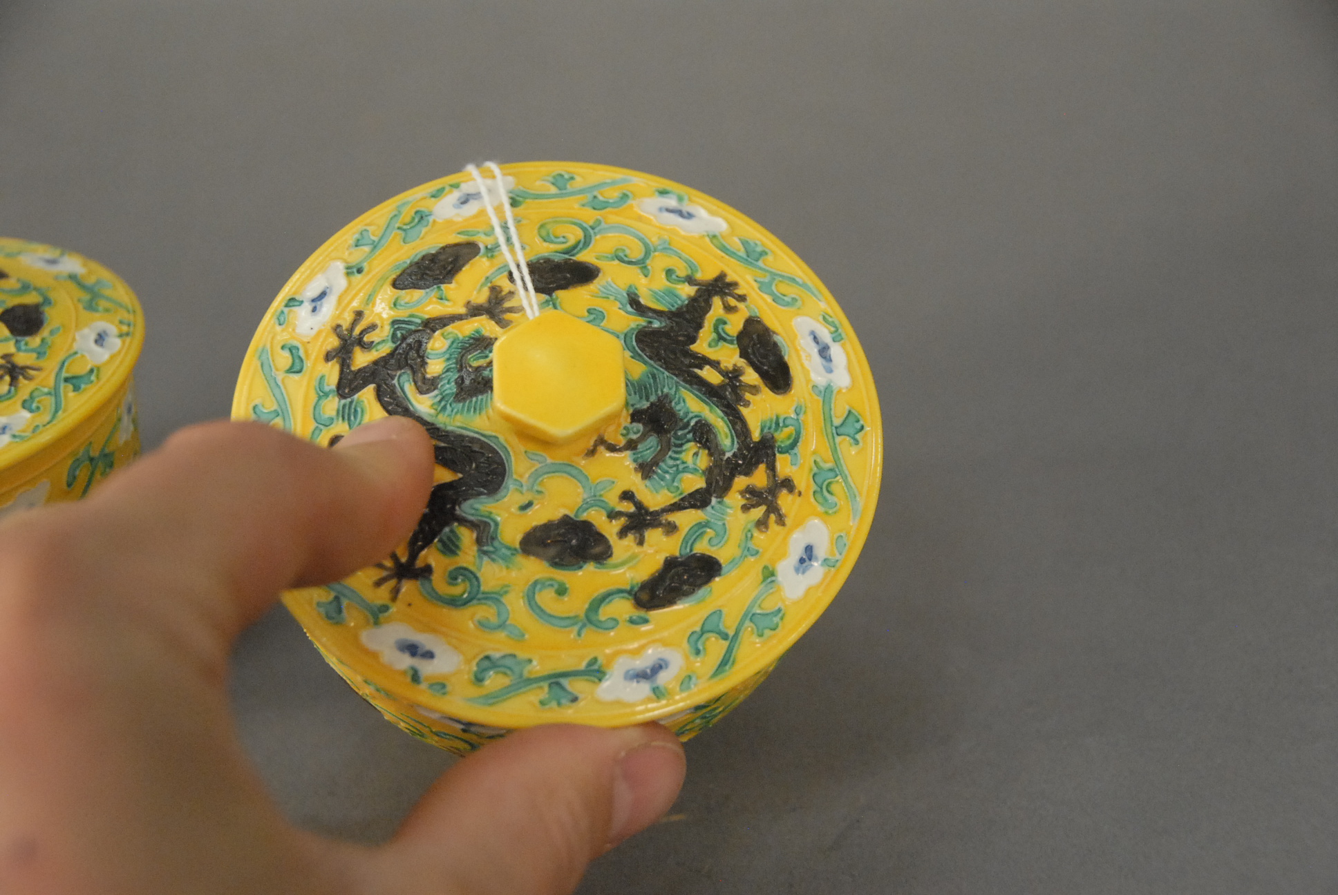 Lot 186: Pair of Chinese porcelain covered bowls with five claw dragon and scrolling vine design having blue seal mark on bottom. ht. 2 1/2 in.