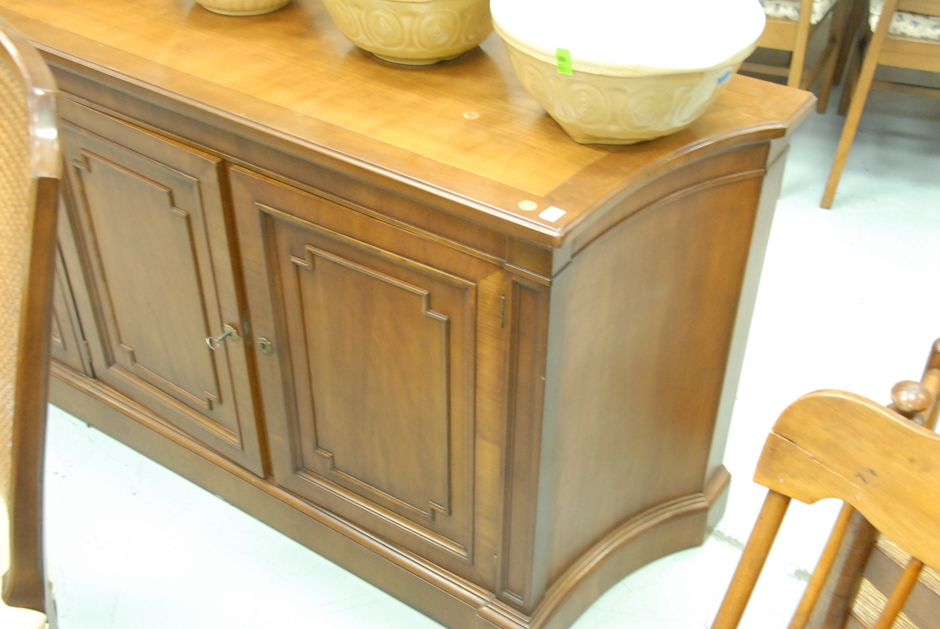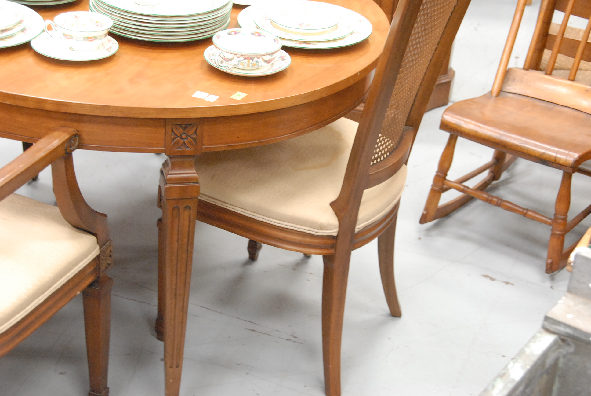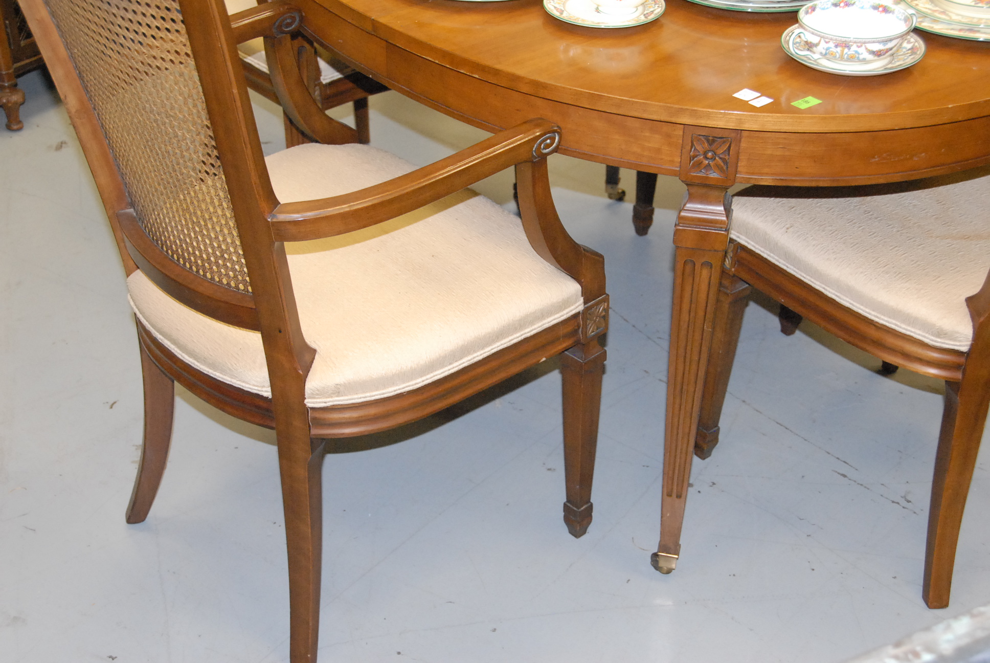 Six piece dining set with four king back chairs, a table with three leaves, and a credenza.