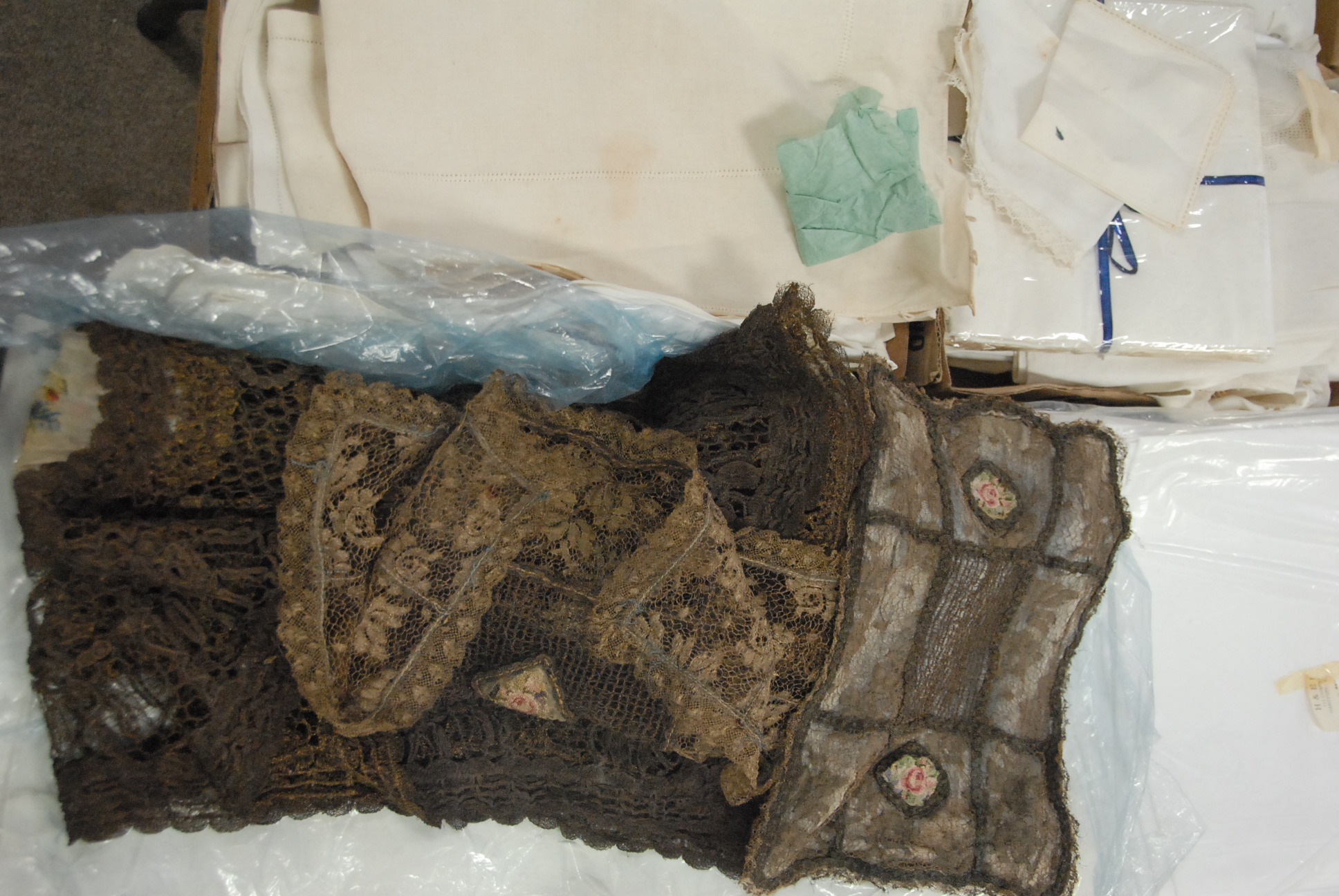 Ten flats of quality linens, including several doilies made with metal threading.