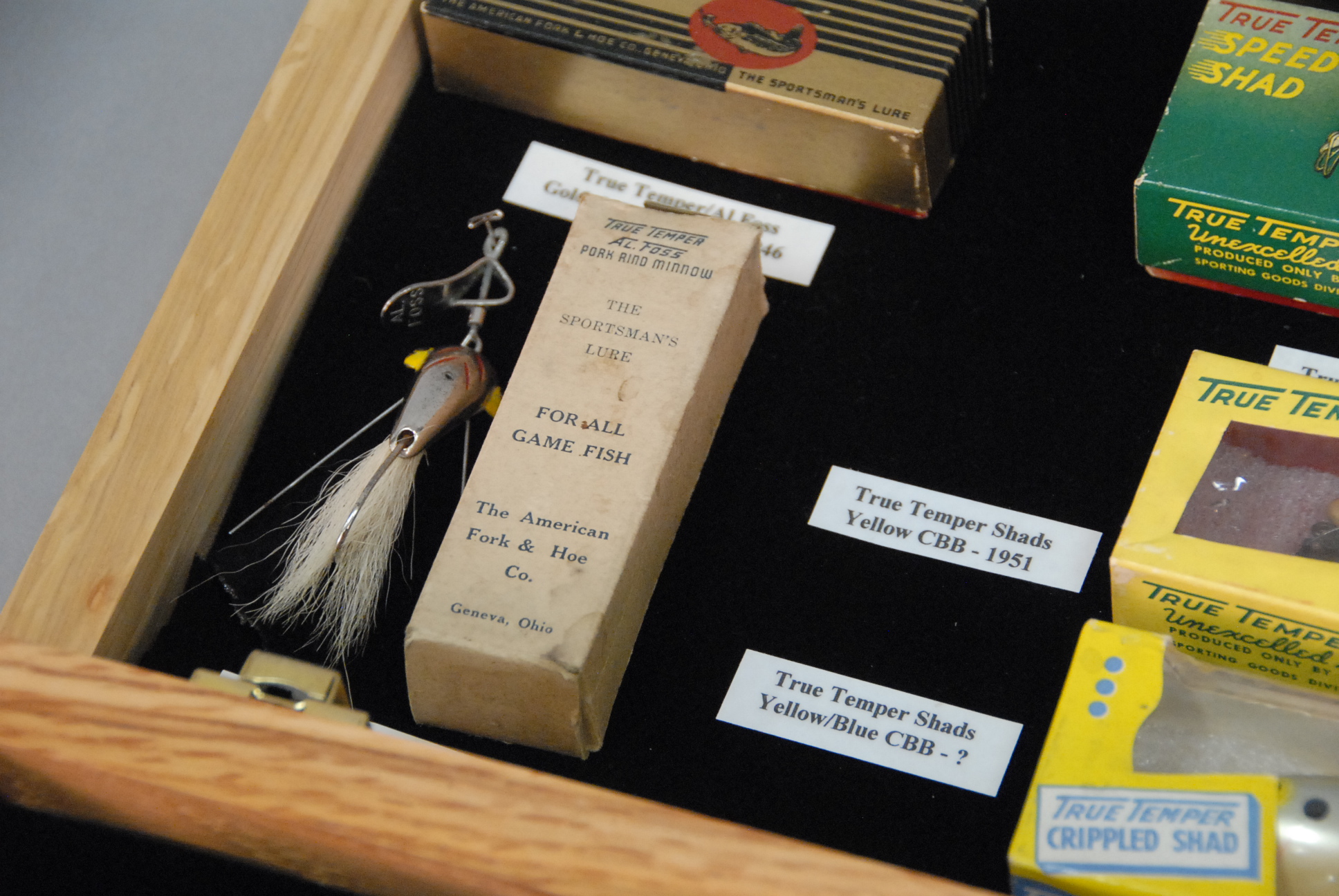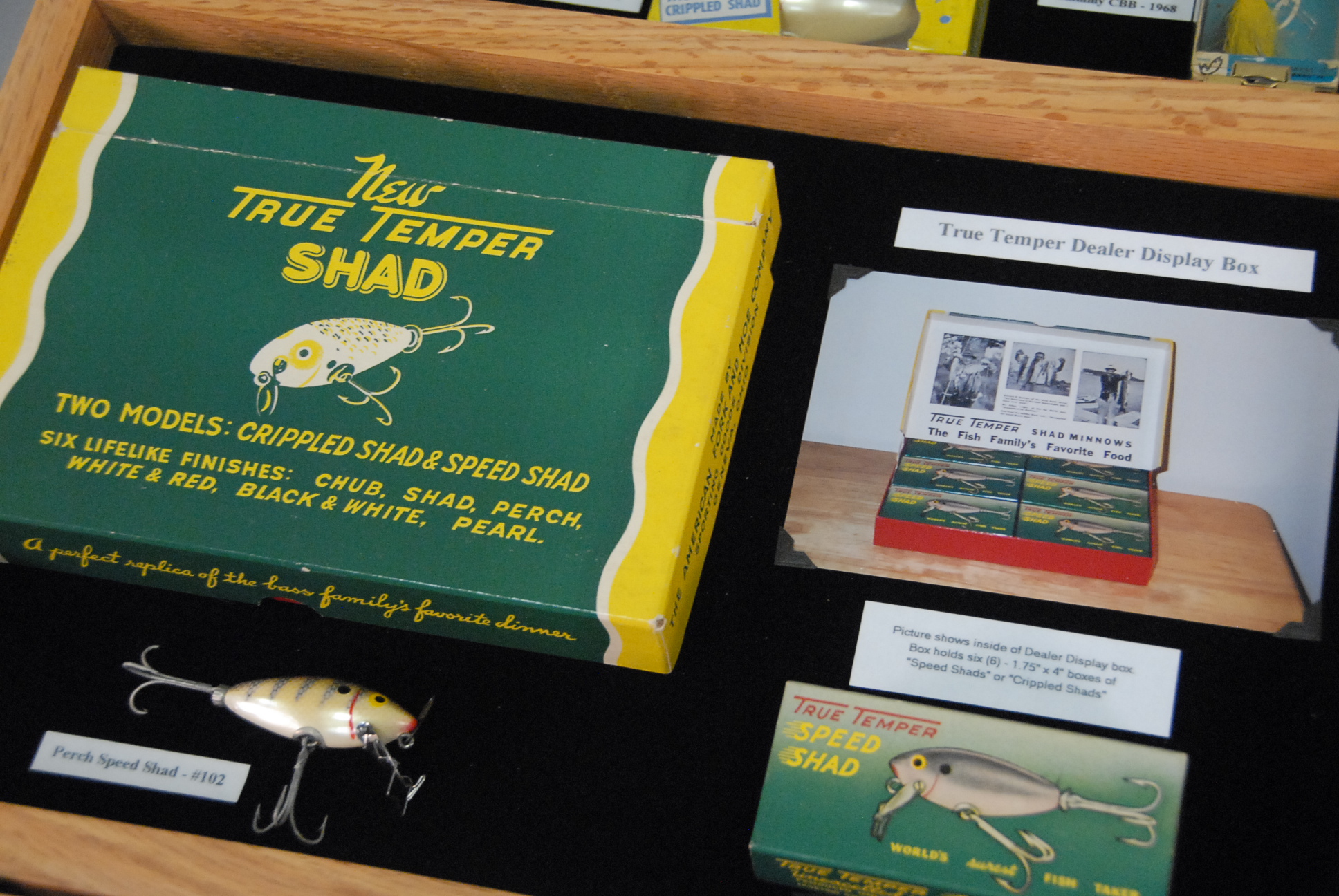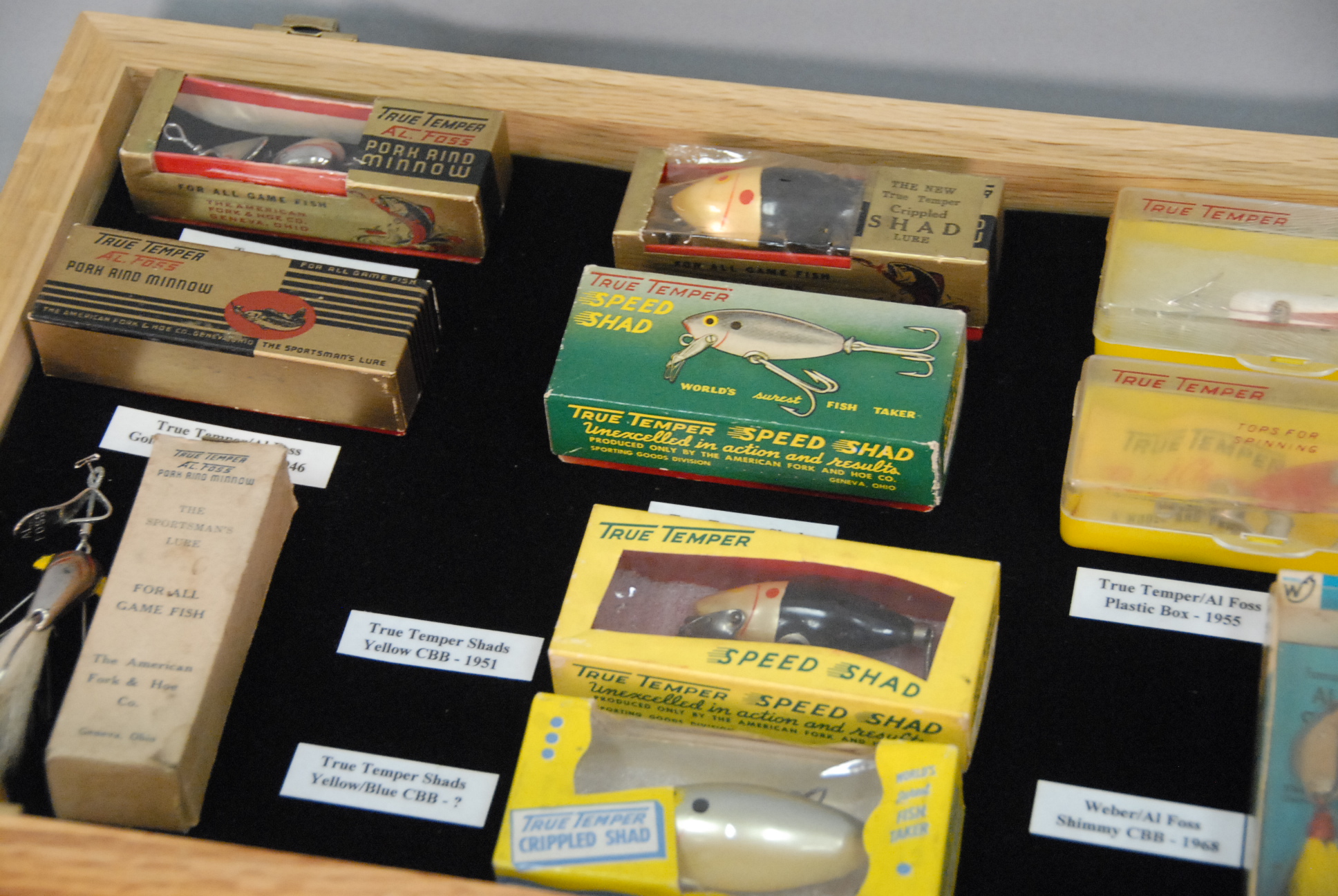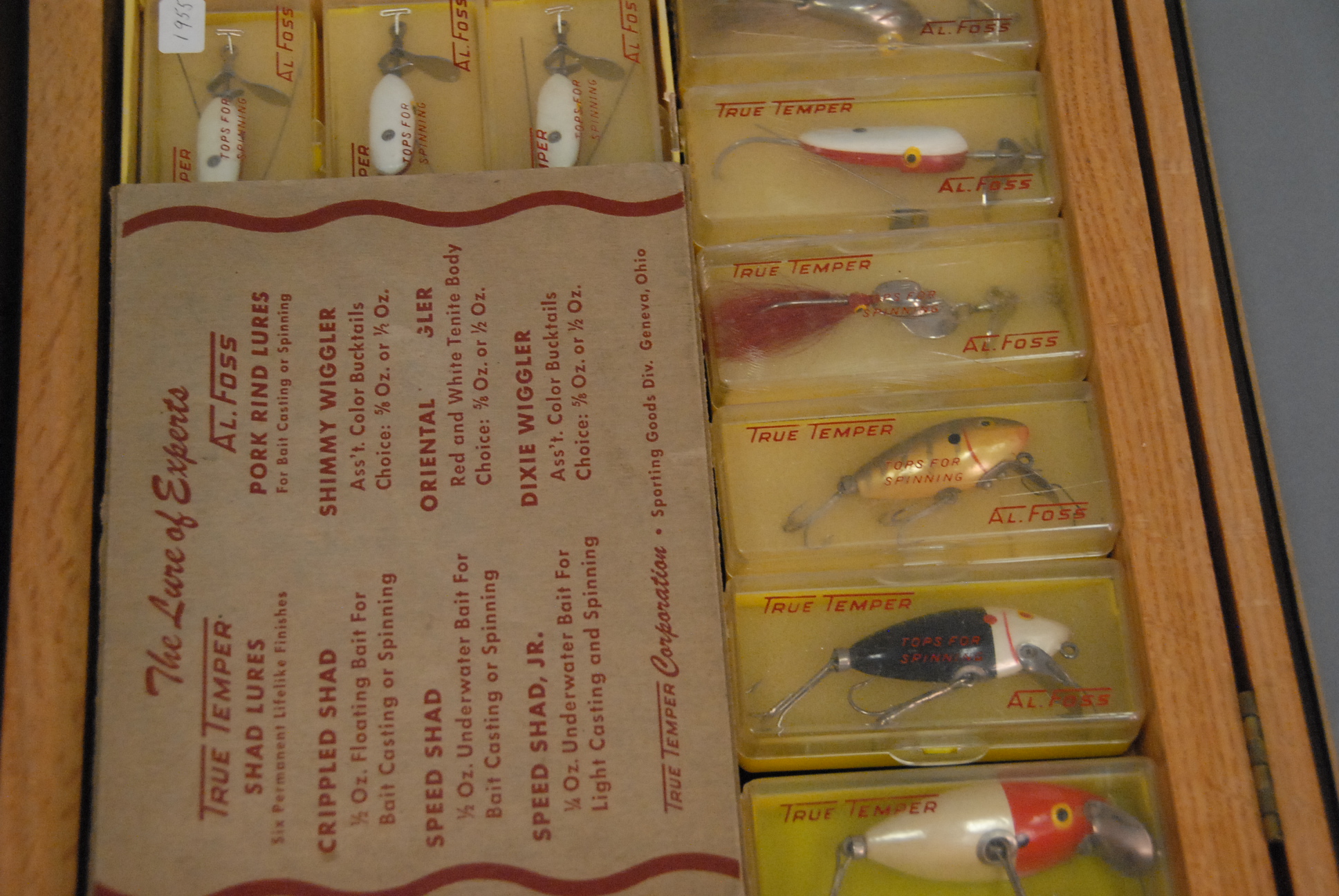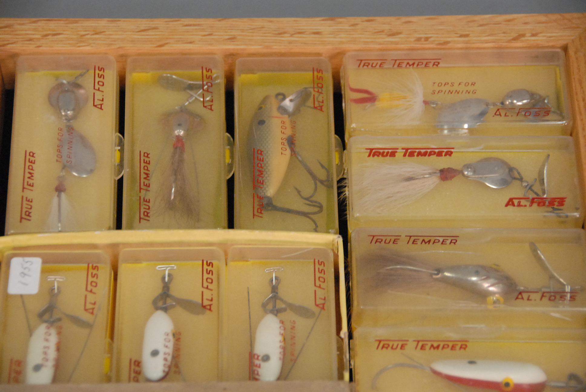 Three custom cases with twenty-three True Temper Al Foss Lures with original boxes, one case with Progression 1940 through 1968 with boxes, a dealer display box with one lure and a box, and 1955 box having an assortment of True Temper lures, shad lures, and pork rind lures.