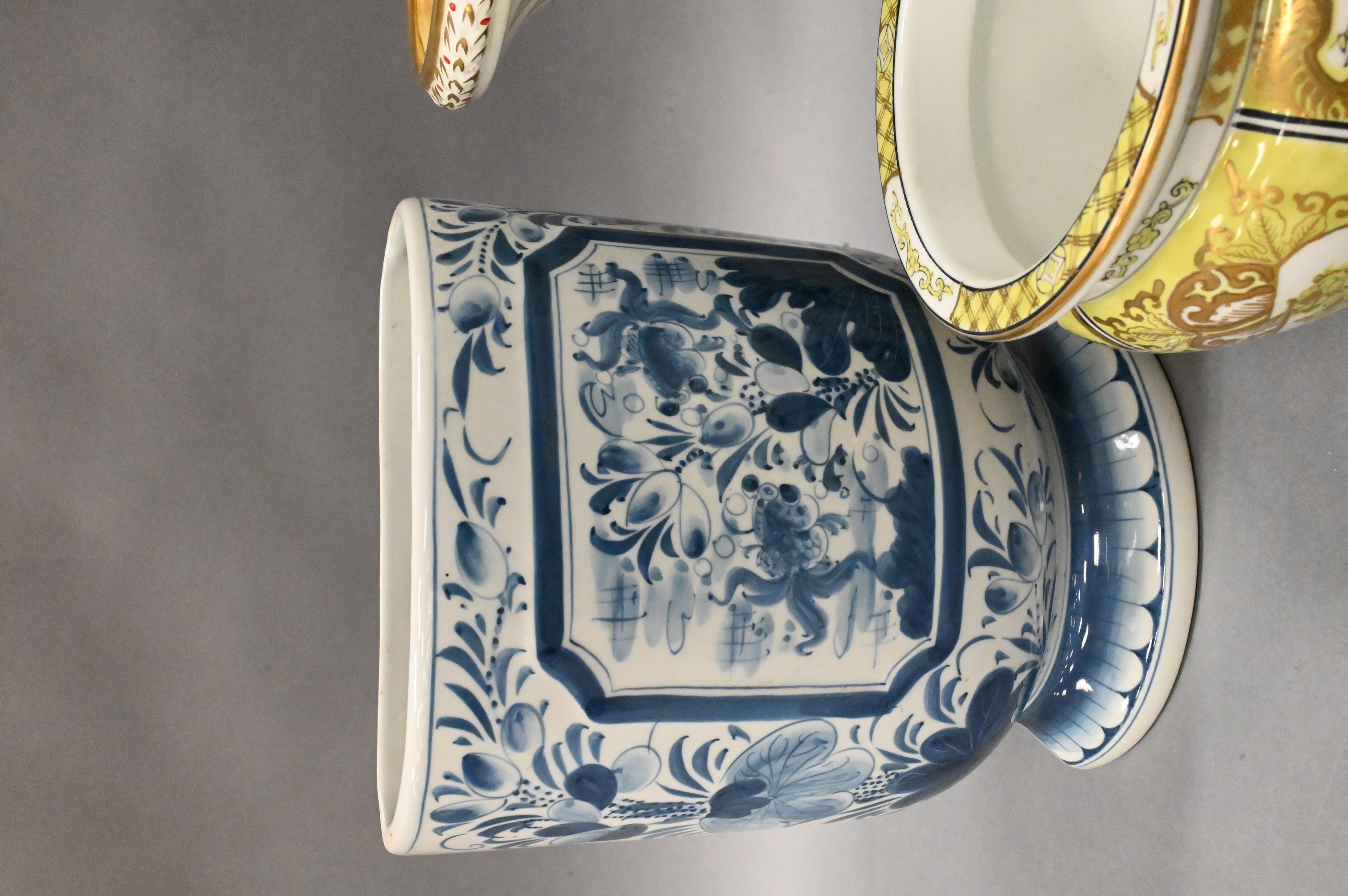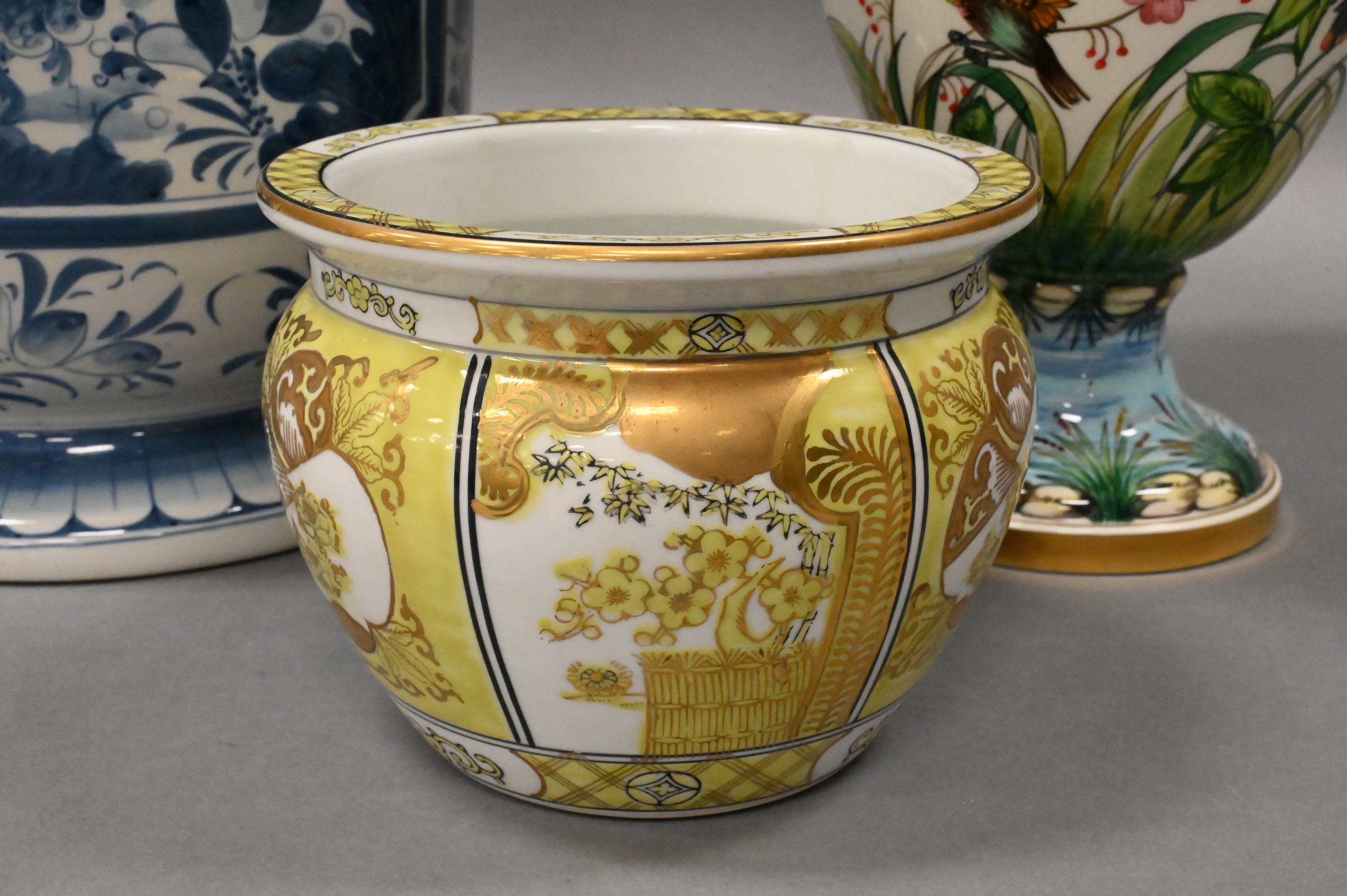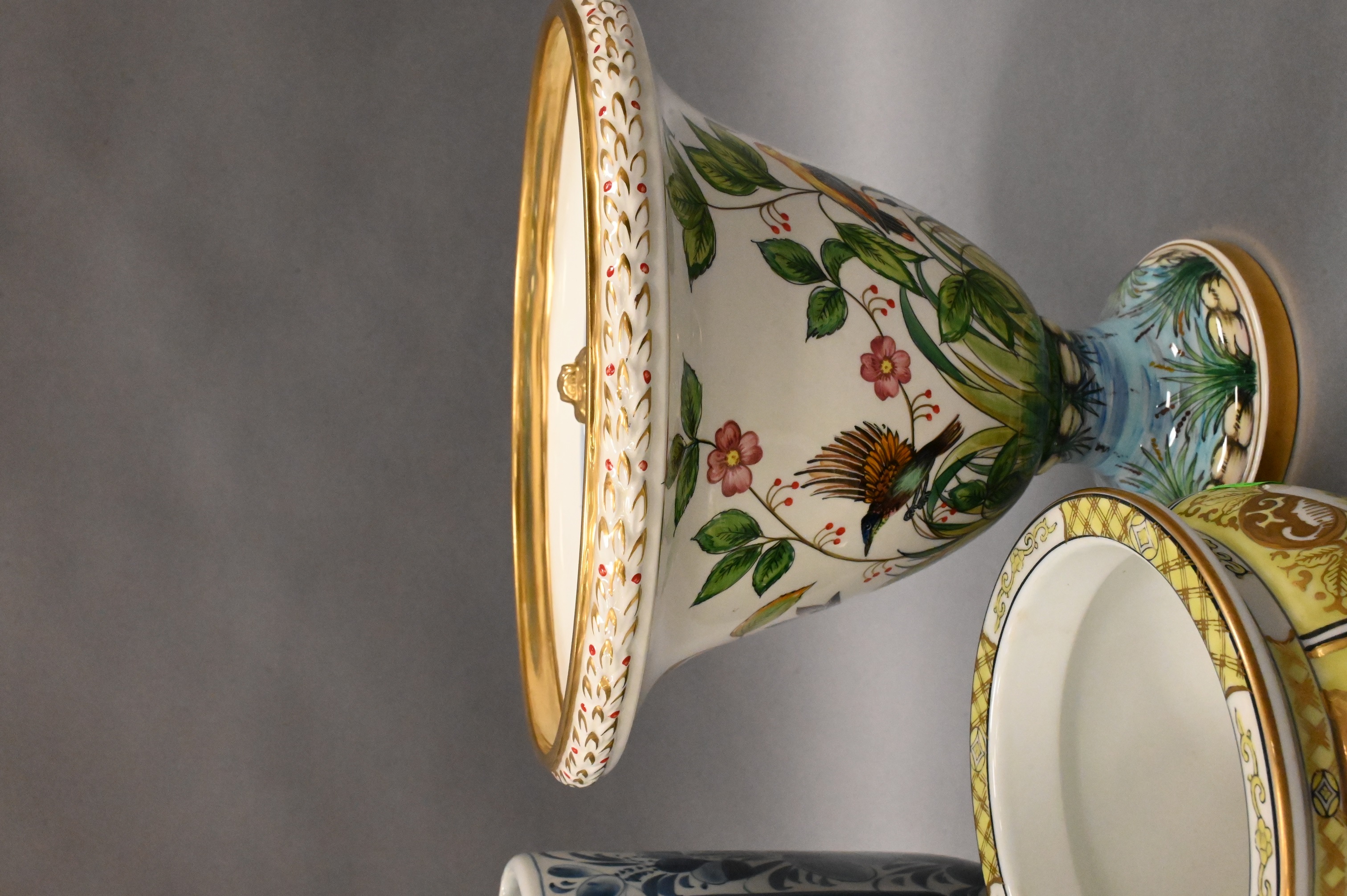 to include hand painted gold Imari vase, hand painted frog urn, and a blue and white Maitland Smith urn