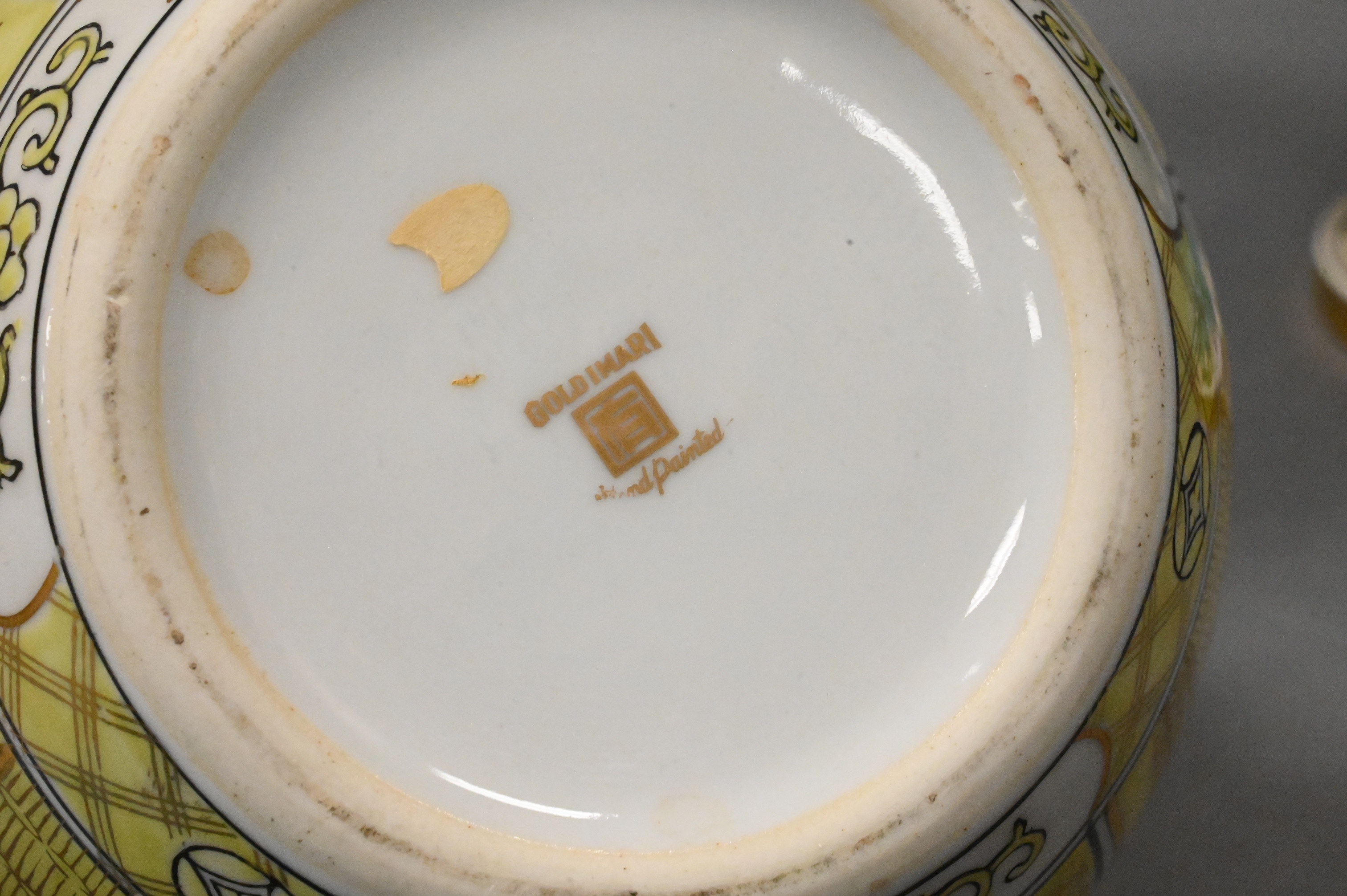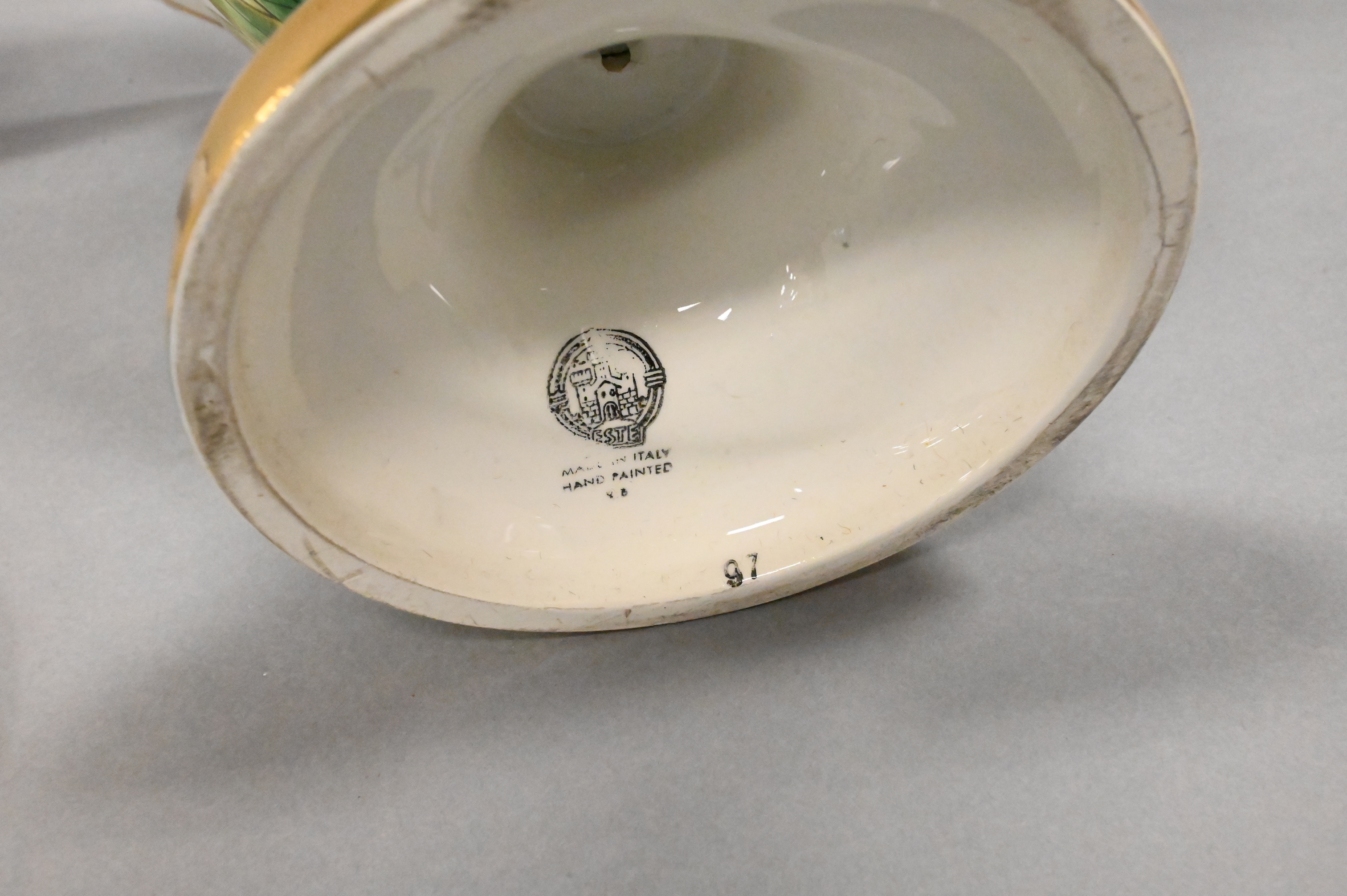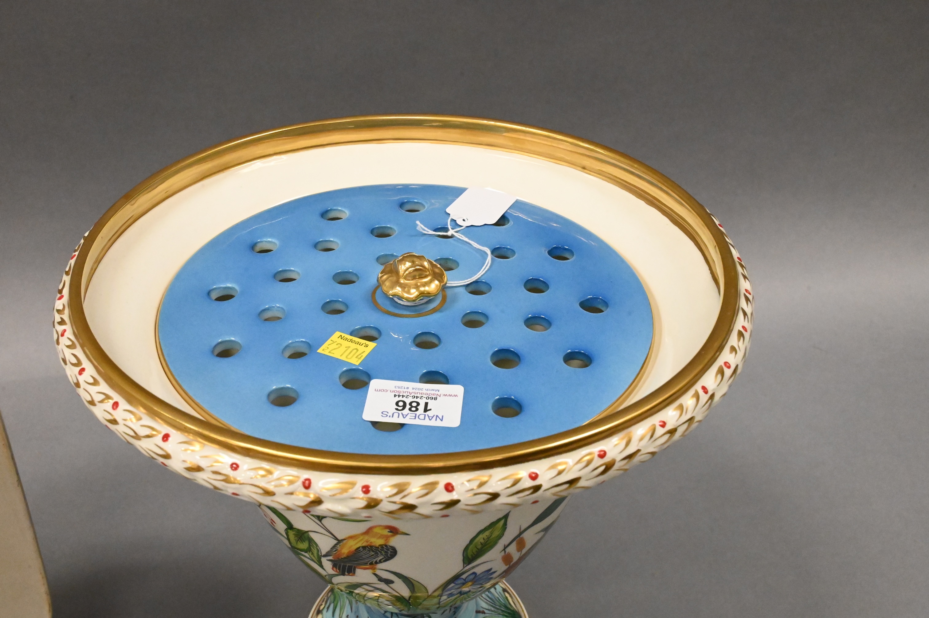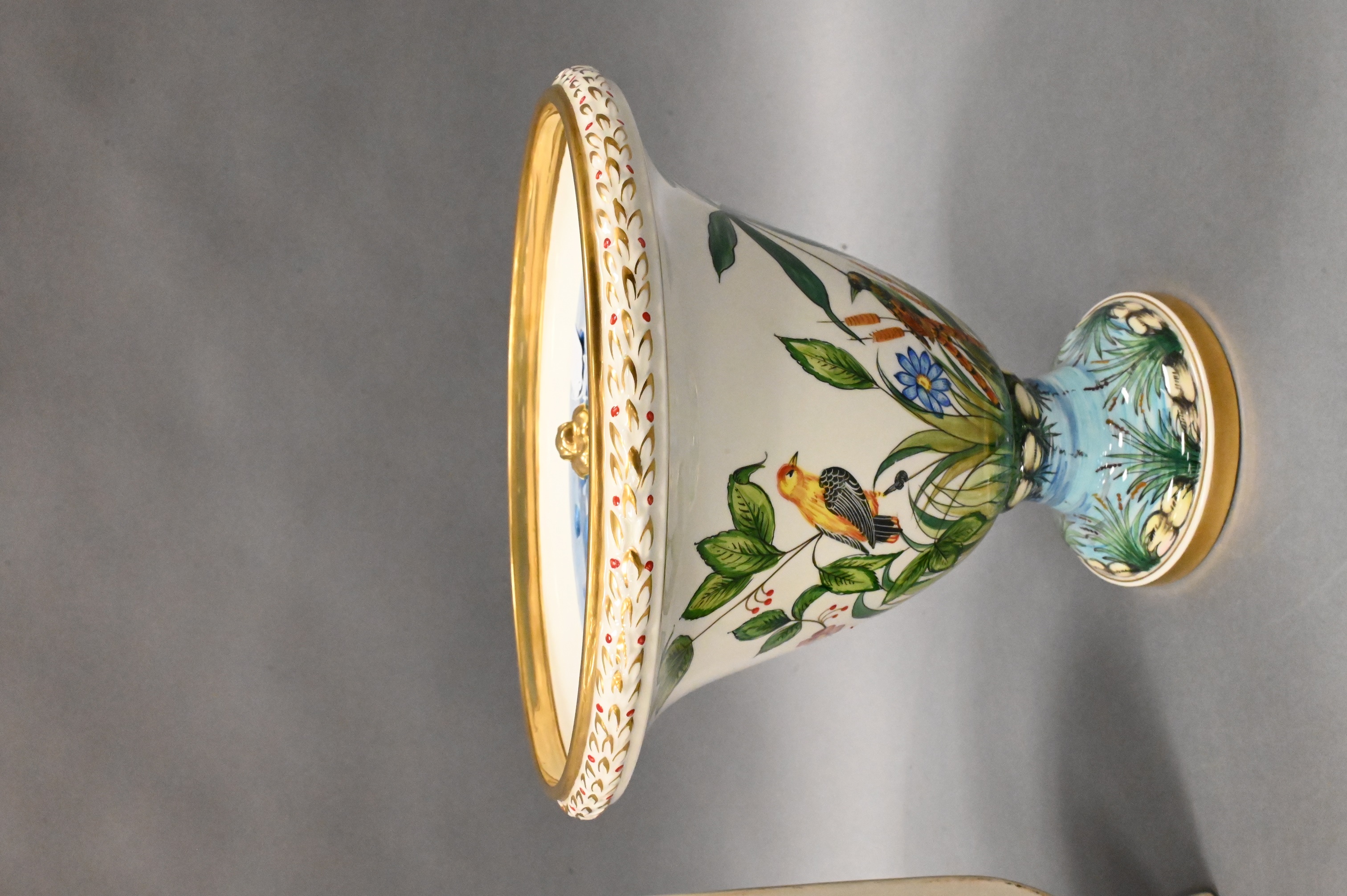 to include hand painted gold Imari vase, hand painted frog urn, and a blue and white Maitland Smith urn