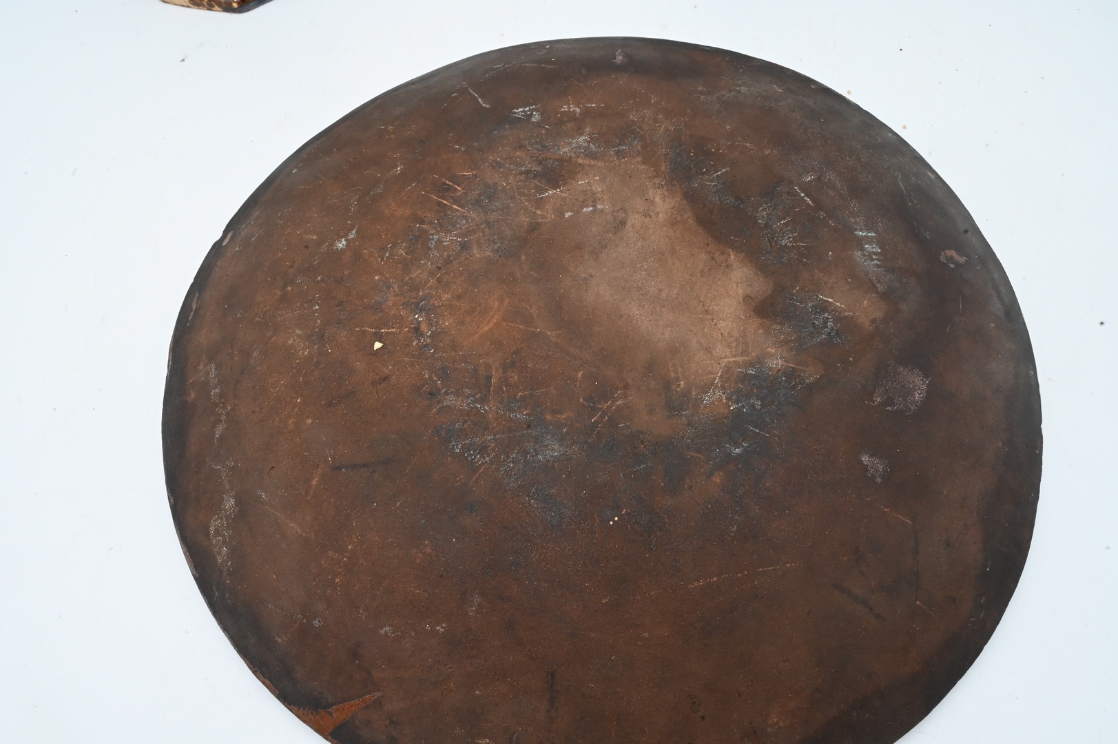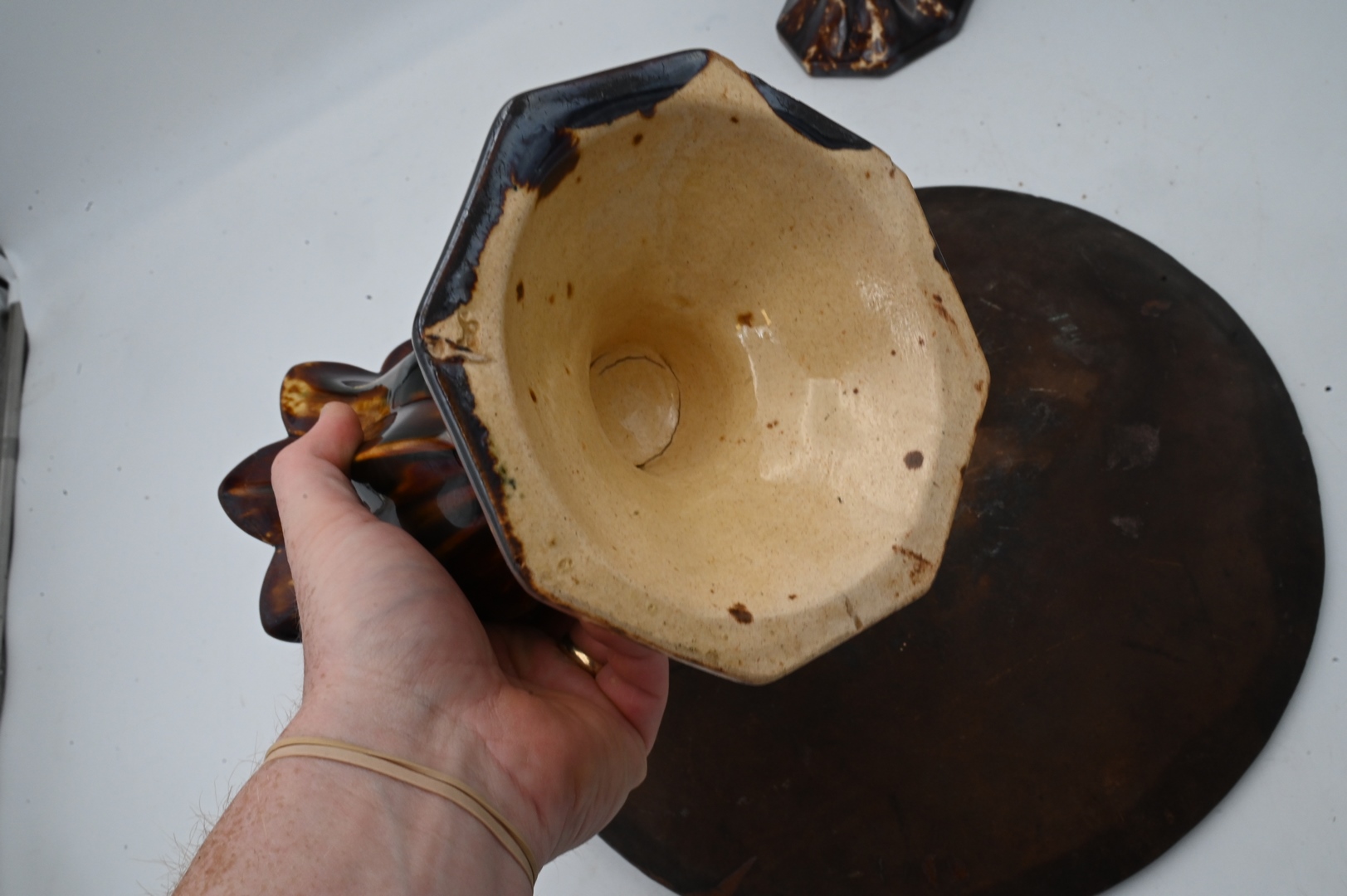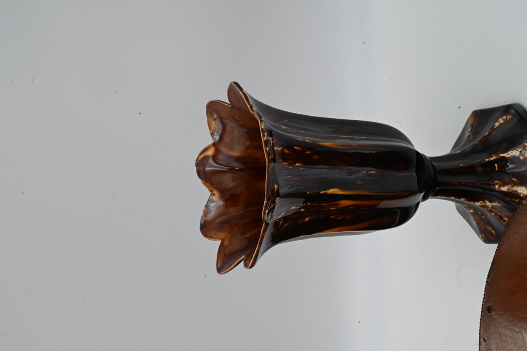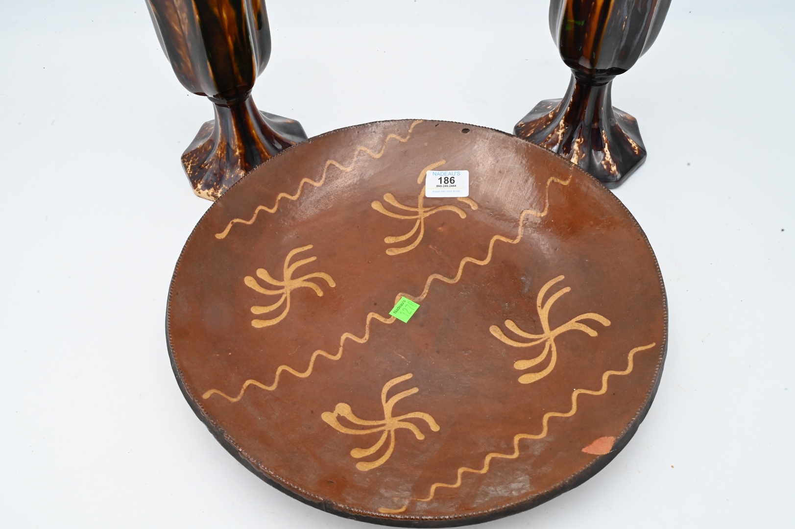 Three Piece Pottery Group, redware slipware charger in brown with yellow decoration, along with tulip form pottery flower vases, charger diameter 15 inches, tulip height 10 inches. Provenance: Estate of Peter Tillou, Litchfield, Connecticut.
