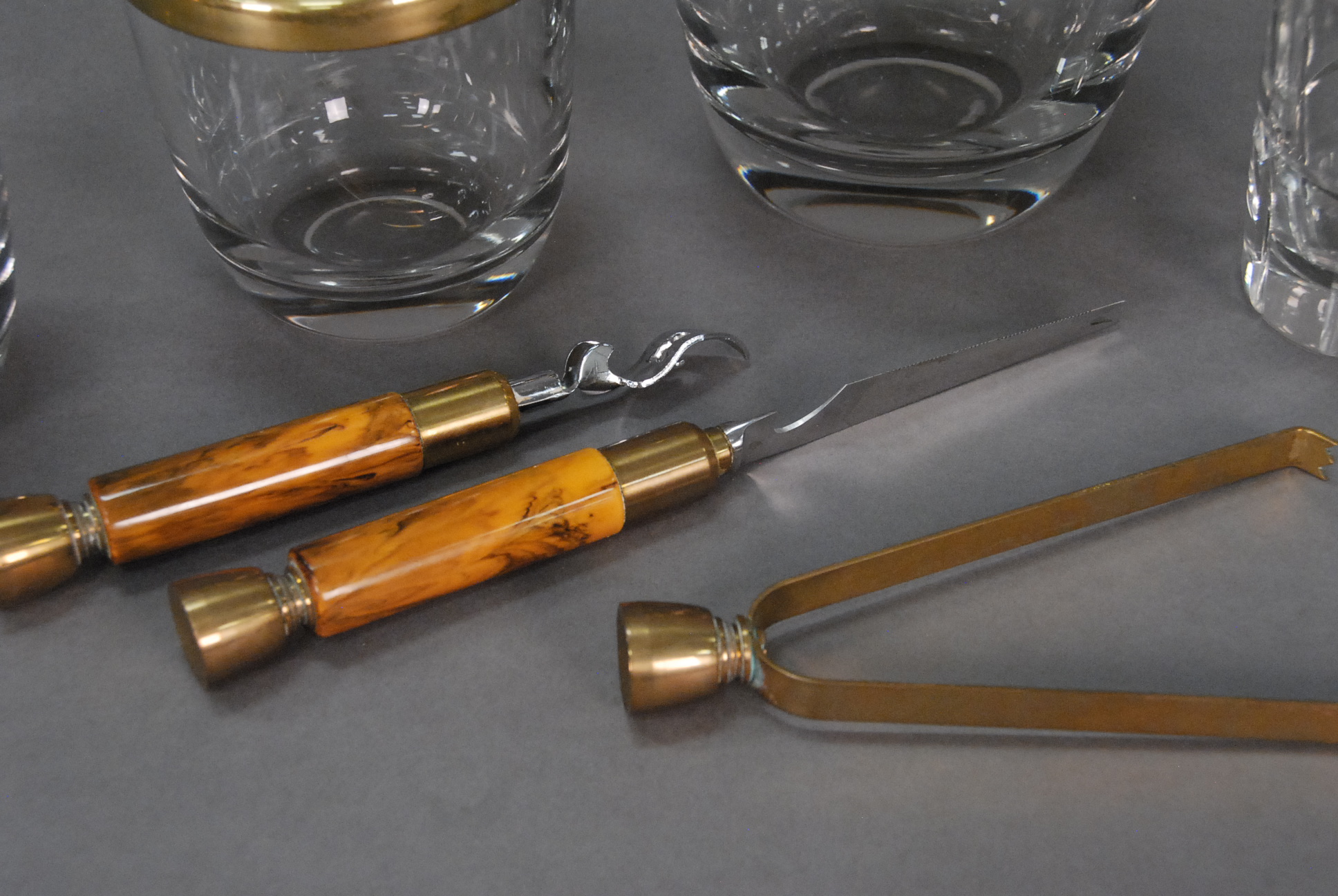 Tommi Parzinger style seven piece lot to include three thick wall crystal containers with incised brass tops and turned finials, a crystal cocktail shaker with brass top, and three matched accessory pieces ice tongs, opener, and hors d’oeuvre knife, each with faux burl bakelite handles and brass tops.