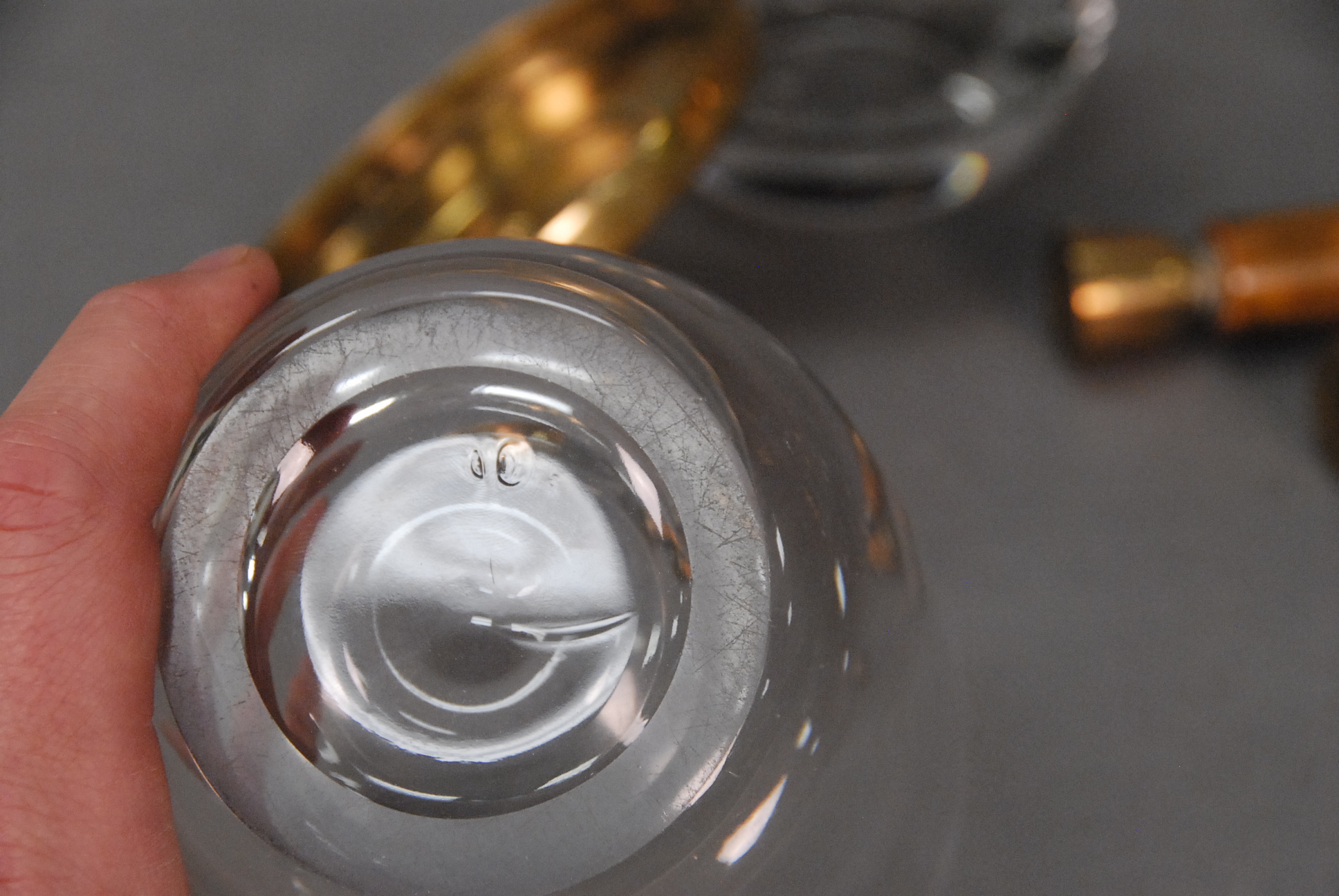 Lot 186: Tommi Parzinger style seven piece lot to include three thick wall crystal containers with incised brass tops and turned finials, a…