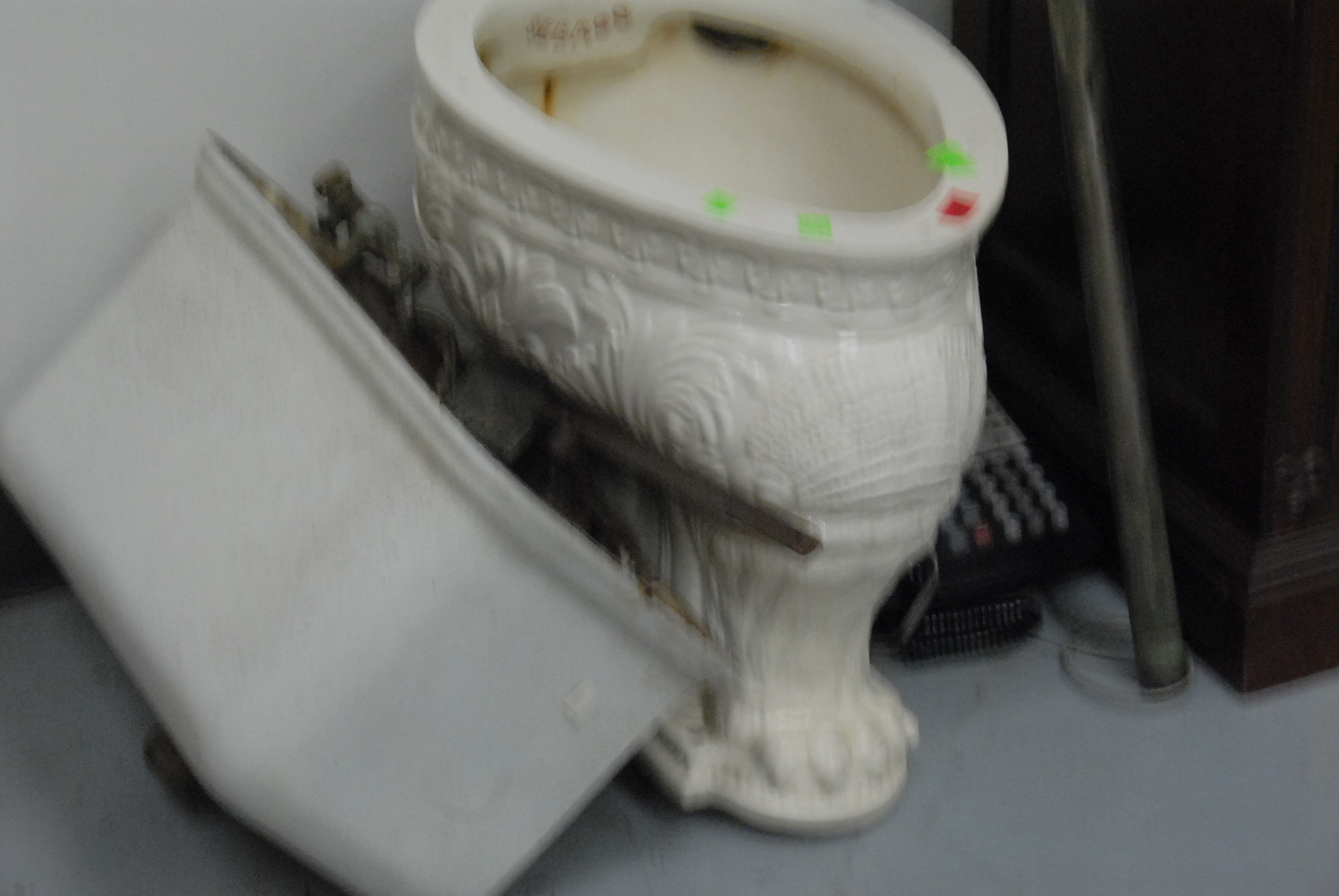 Lot 186: Unusual Sebago toilet bowl and high wall mount tank marked George Woodman & Co. Boston Mass with claw foot and shell embossed porcel…