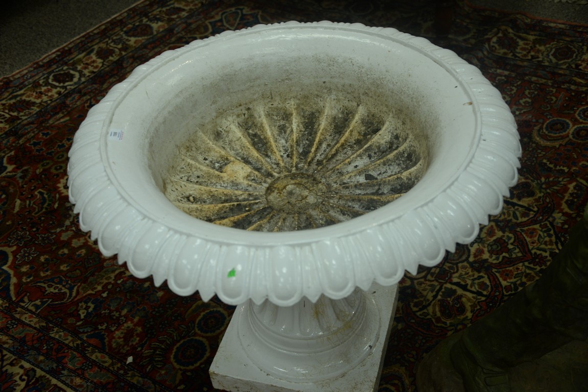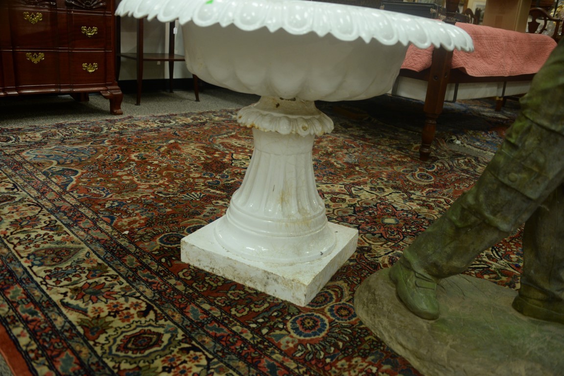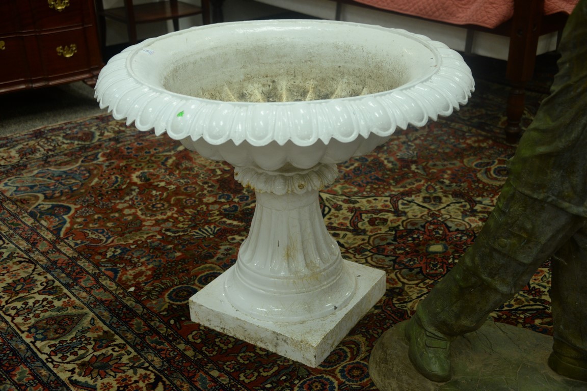 Lot 186: Victorian iron urn with scalloped edge on fluted pedestal set on plain square base, 19th century. ht. 28in., dia. 35in.