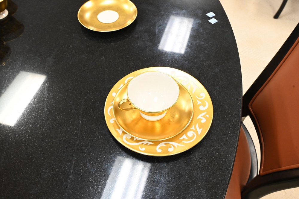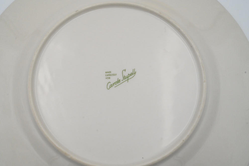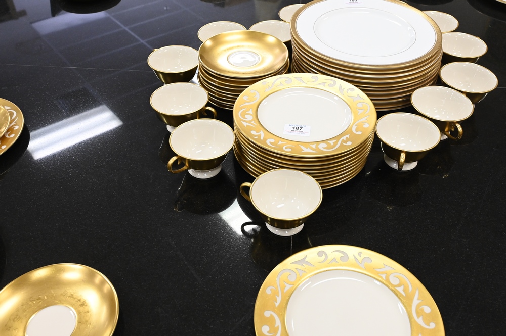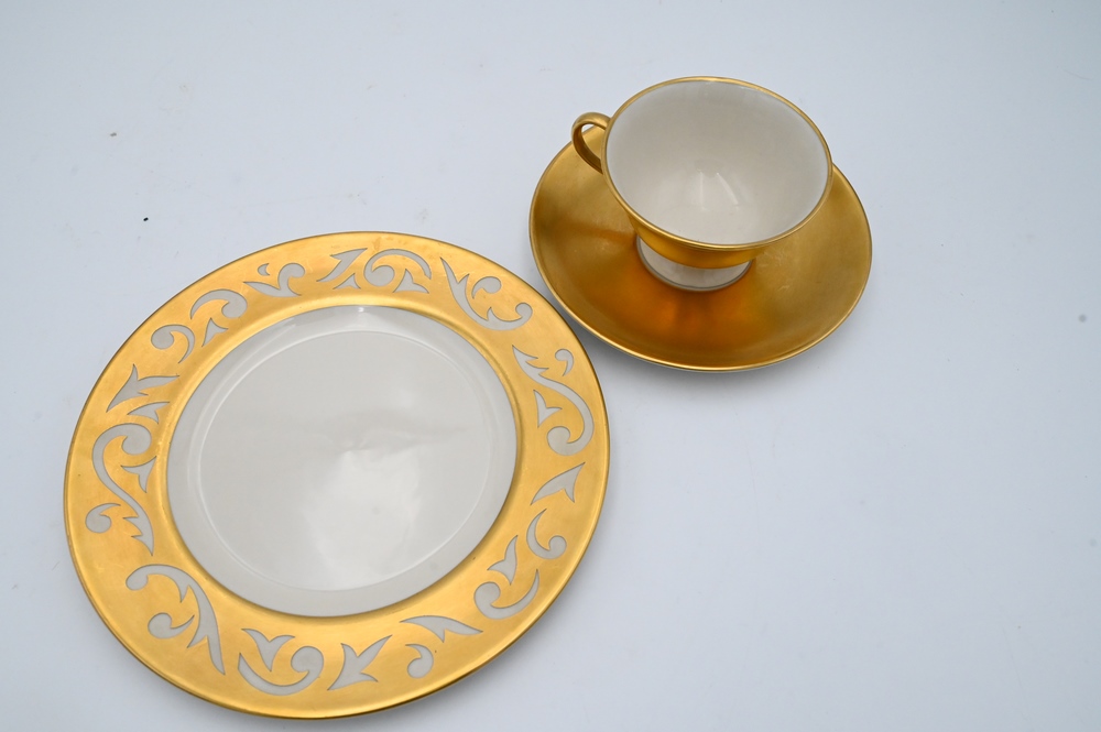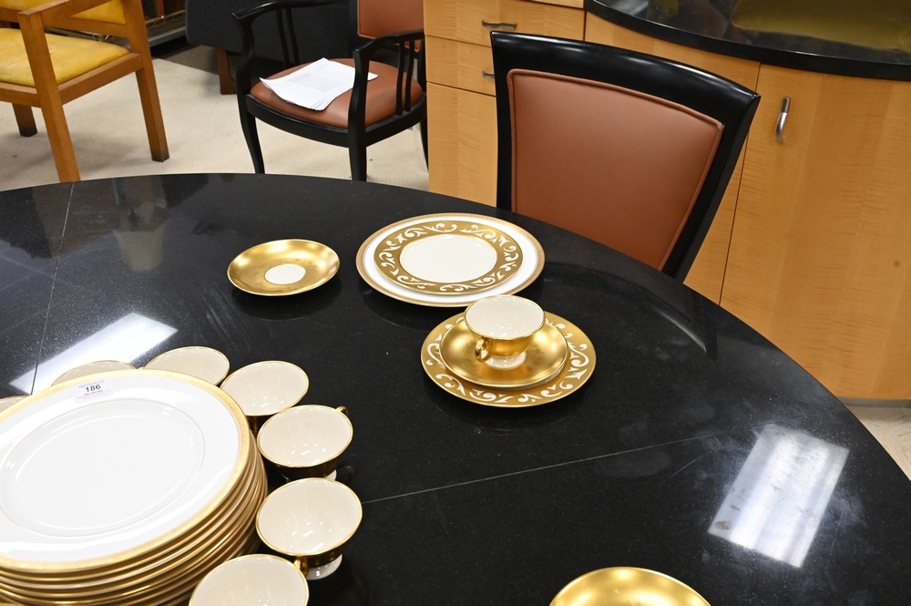 Lot 187: 54 Piece Carole Stupell Porcelain Luncheon Set, to include 18 luncheon plates, 18 cups, 18 saucers, with heavy gilt gold design.