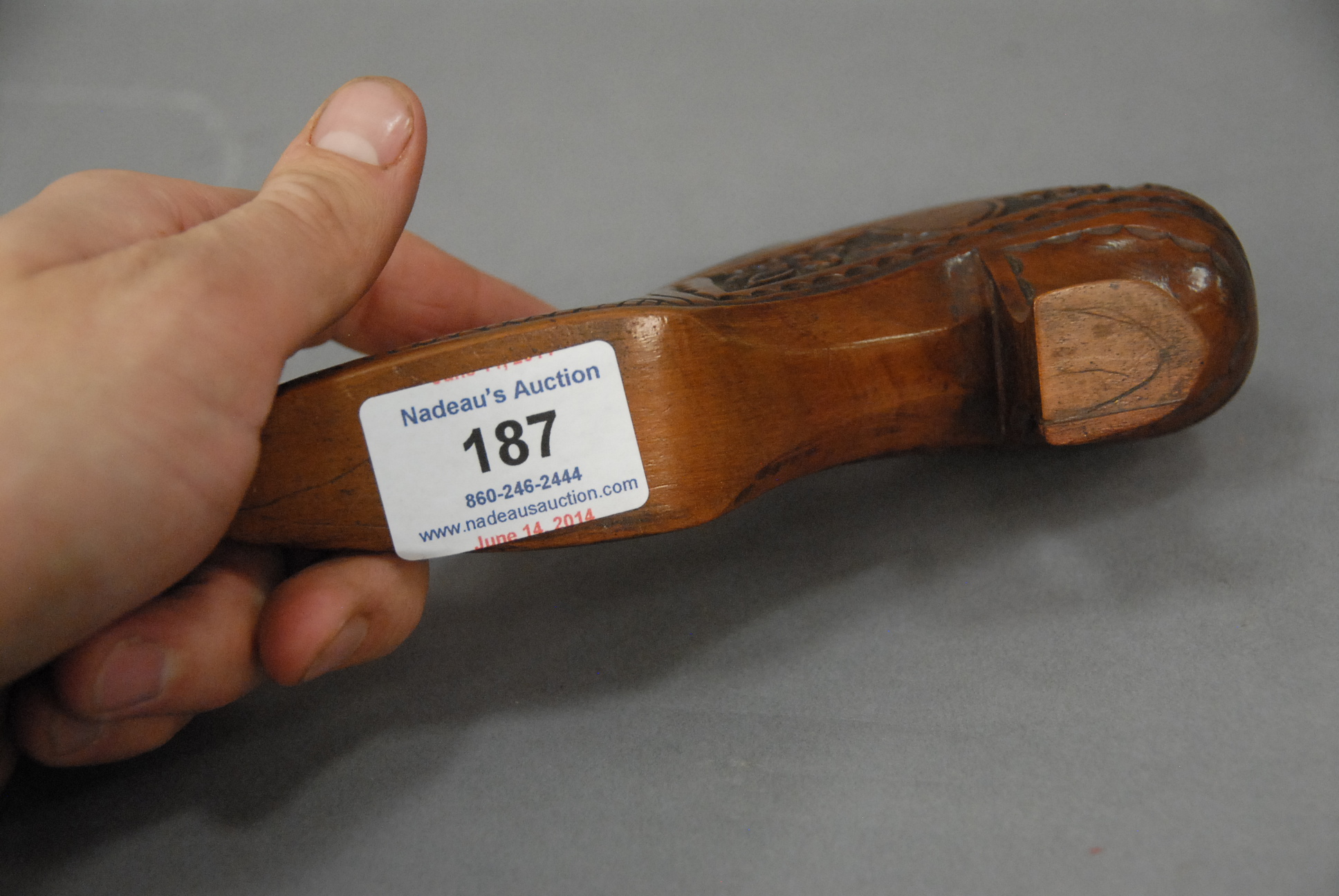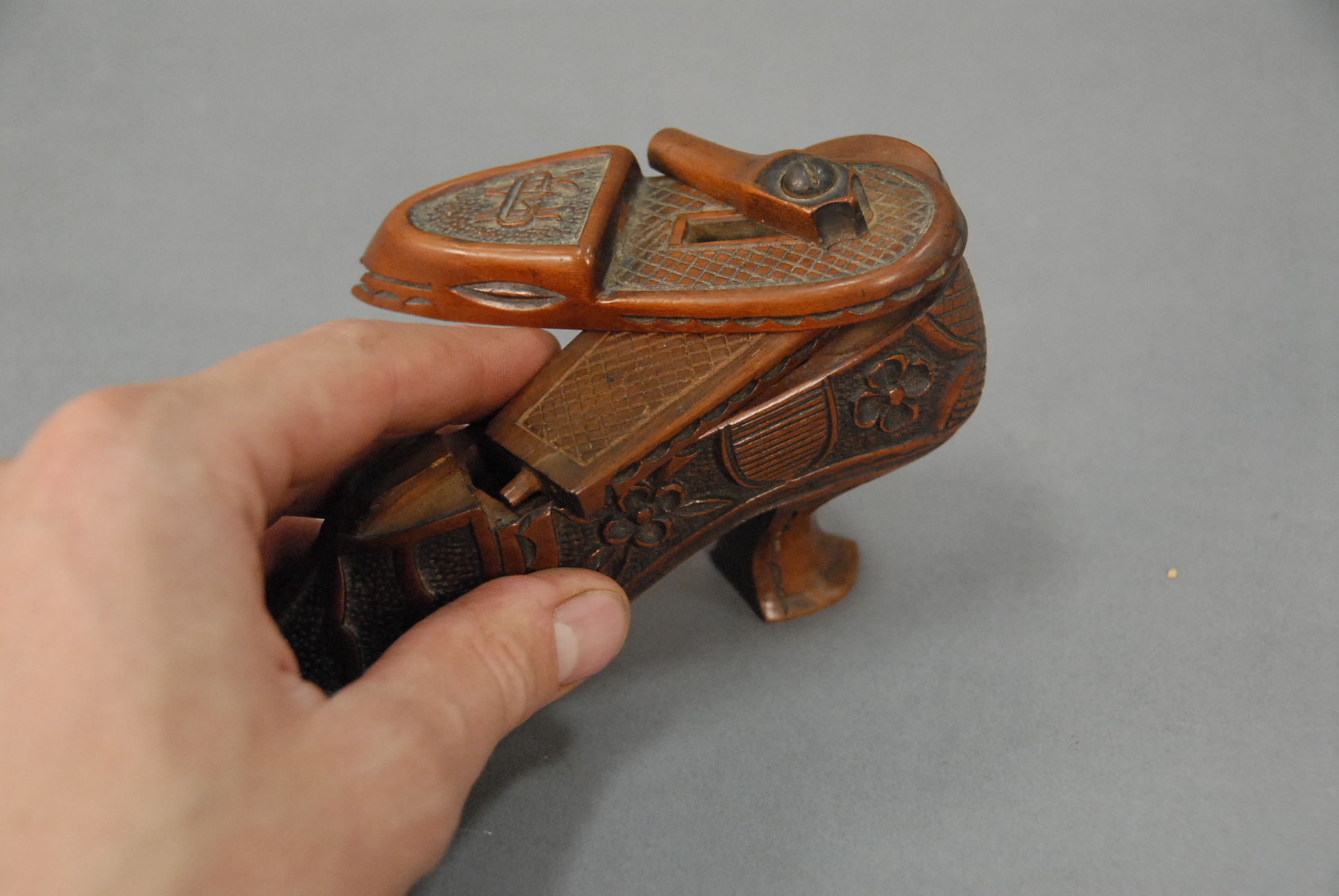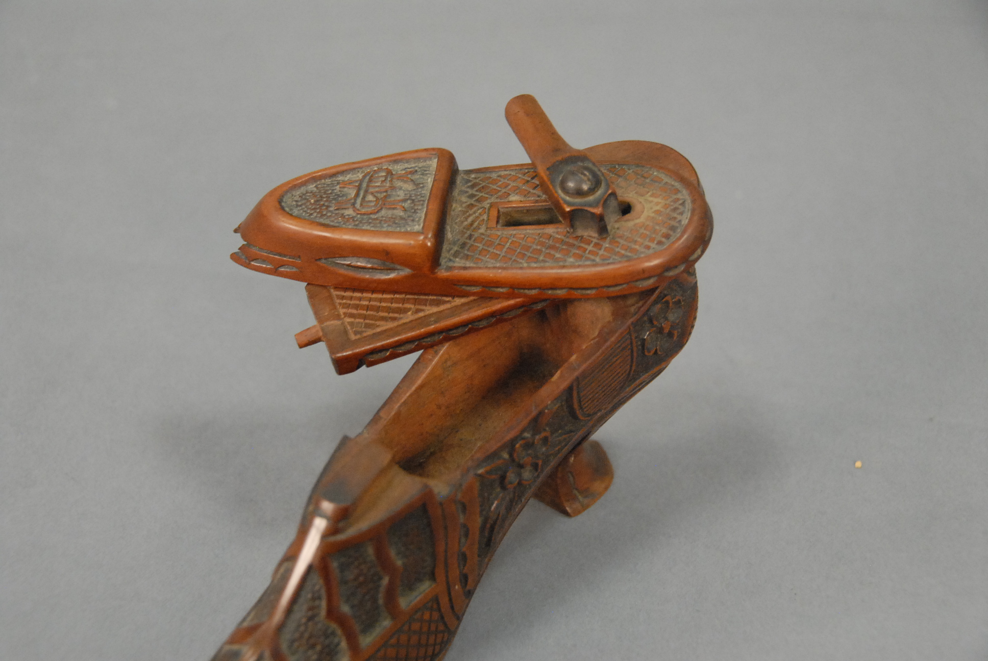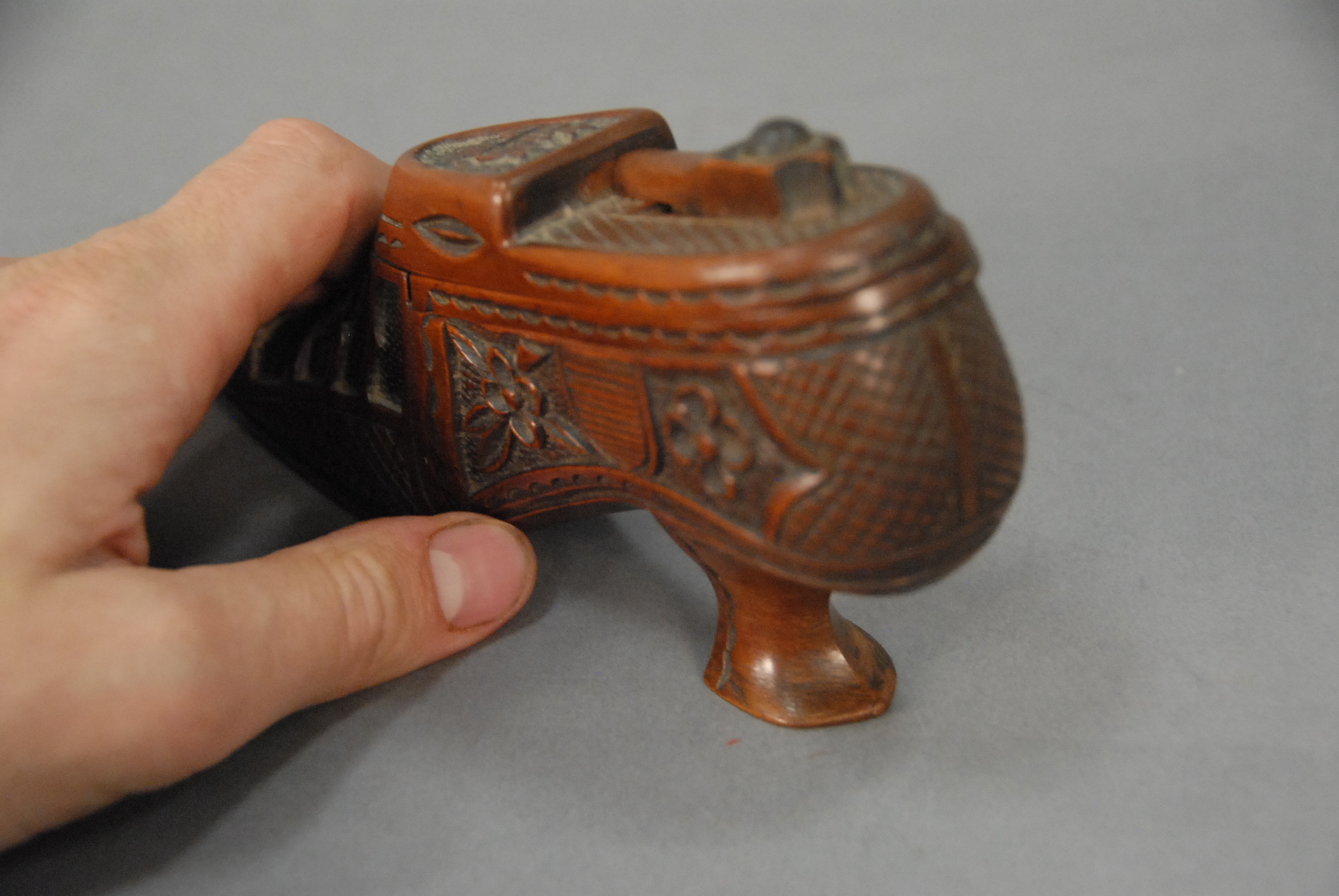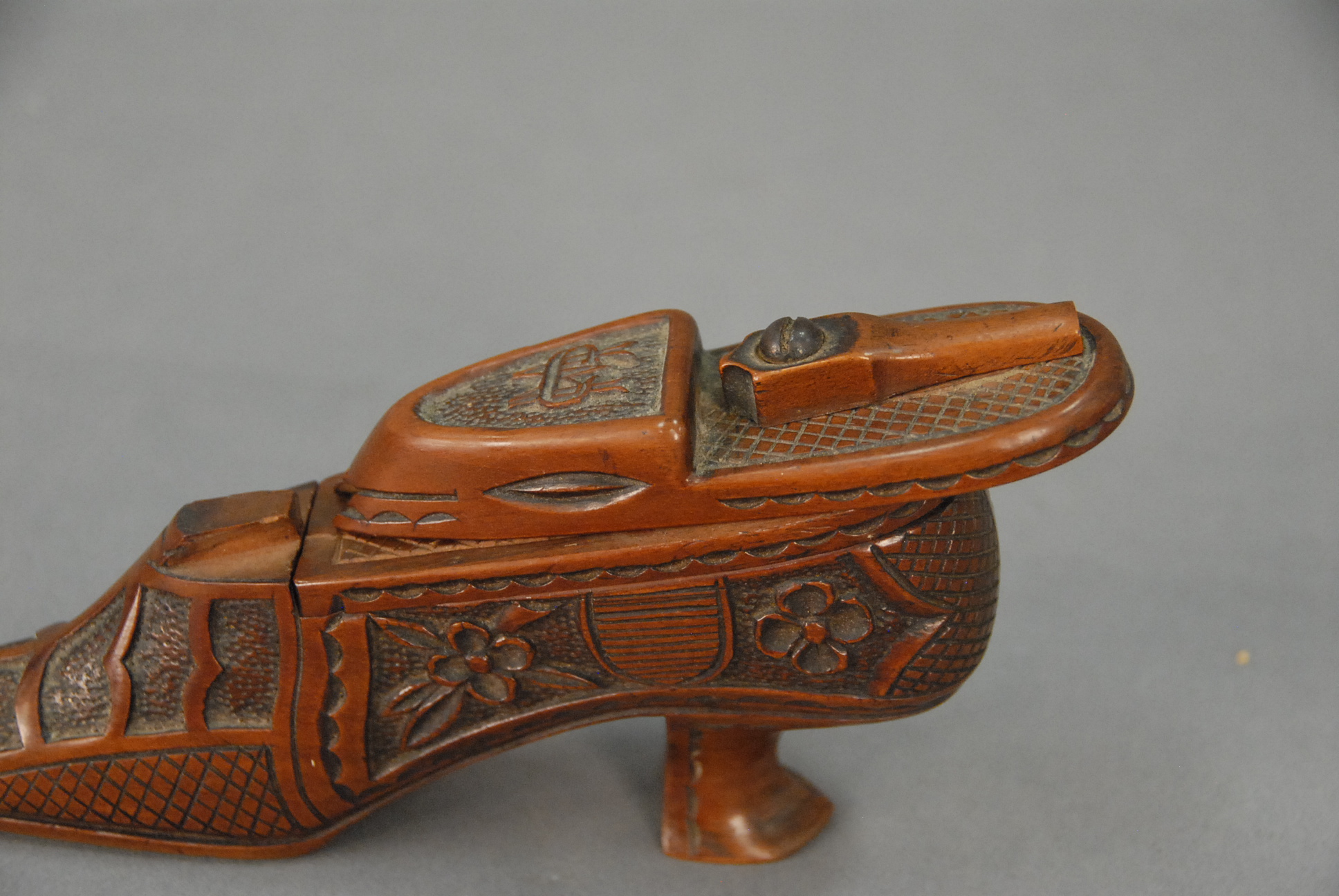 Carved lidded shoe snuff box with twist secret door compartment, ht. 3in. lg. 7in.