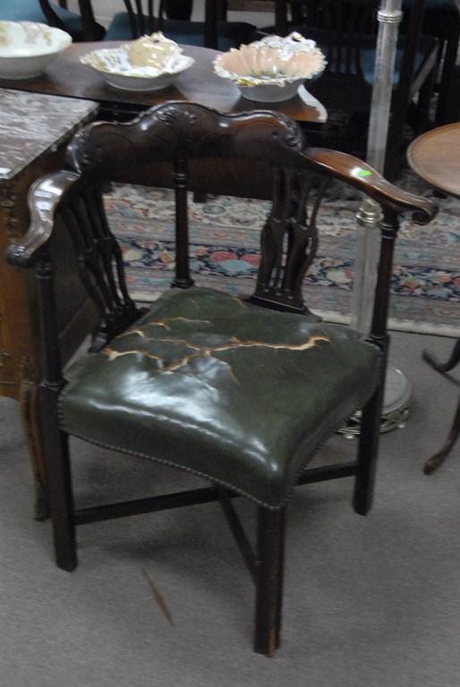 Lot 187: Custom mahogany centennial Chippendale style corner chair with leather seat leather as is, marked Colonial Zeeland MI.