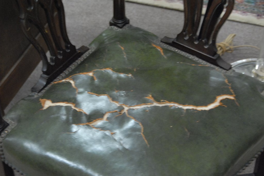 Custom mahogany centennial Chippendale style corner chair with leather seat leather as is, marked Colonial Zeeland MI.